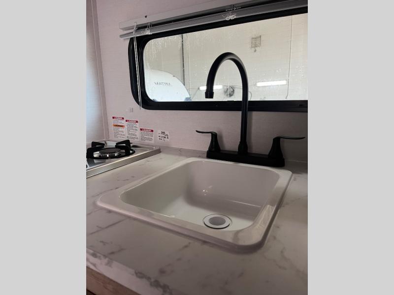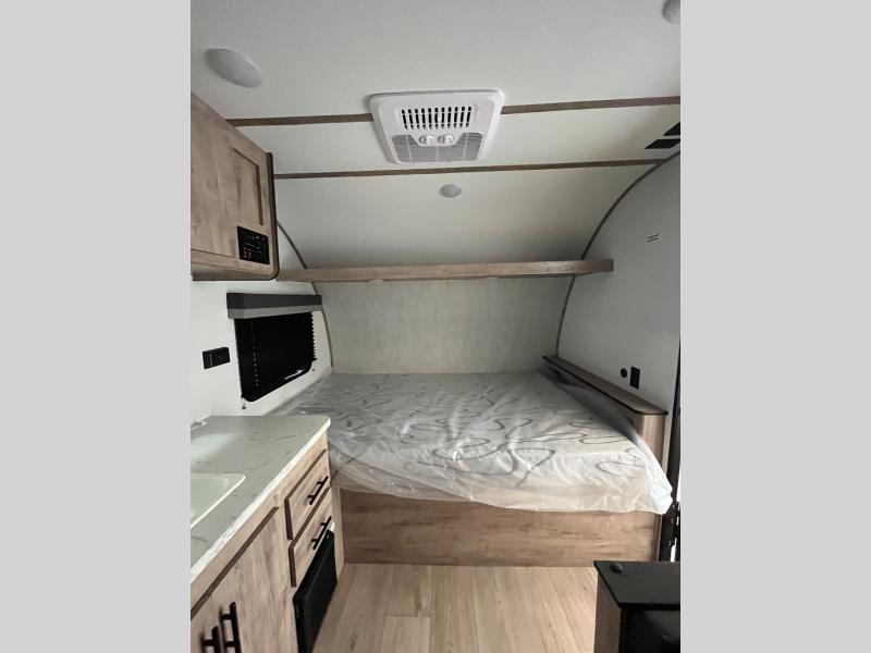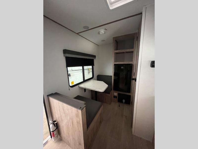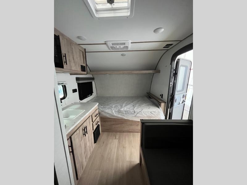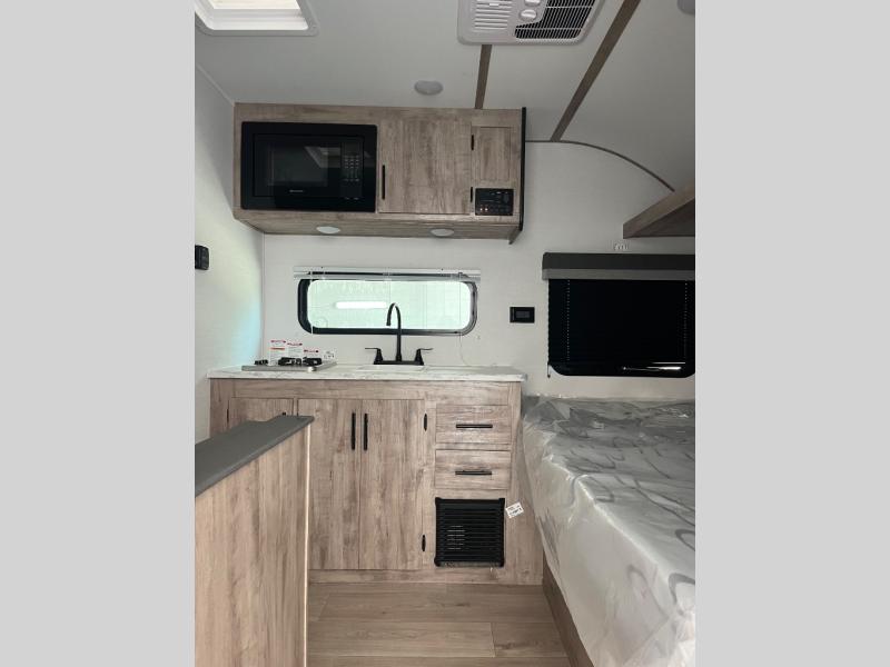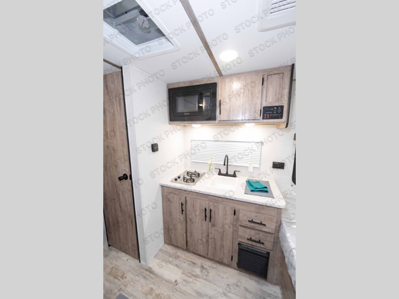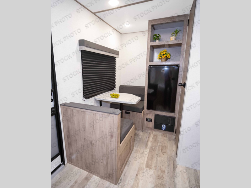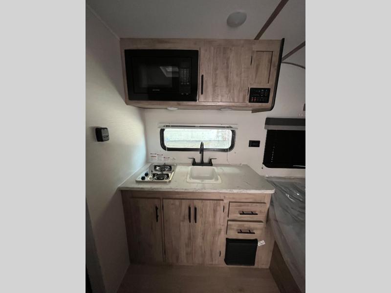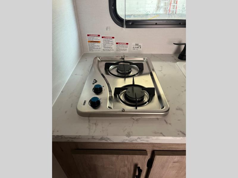 You will love these travel trailer appliances! The sleek microwave and spacious refrigerator make meal prep effortless, while the convenient two-burner cooktop lets you cook up tasty meals on the go. The cozy dinette is perfect for savoring meals or enjoying quality time, and the plush bed ensures a rejuvenating night's sleep. Thoughtful storage solutions, including flip-up storage and overhead shelves, keep your belongings tidy and easily accessible. This travel trailer is perfect for anyone seeking a peaceful and adventurous retreat. With its clever design and functional features, it's easy to tow and park, allowing you to explore scenic destinations with ease.