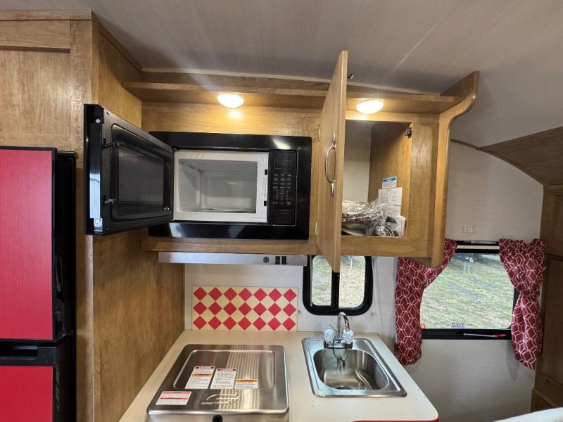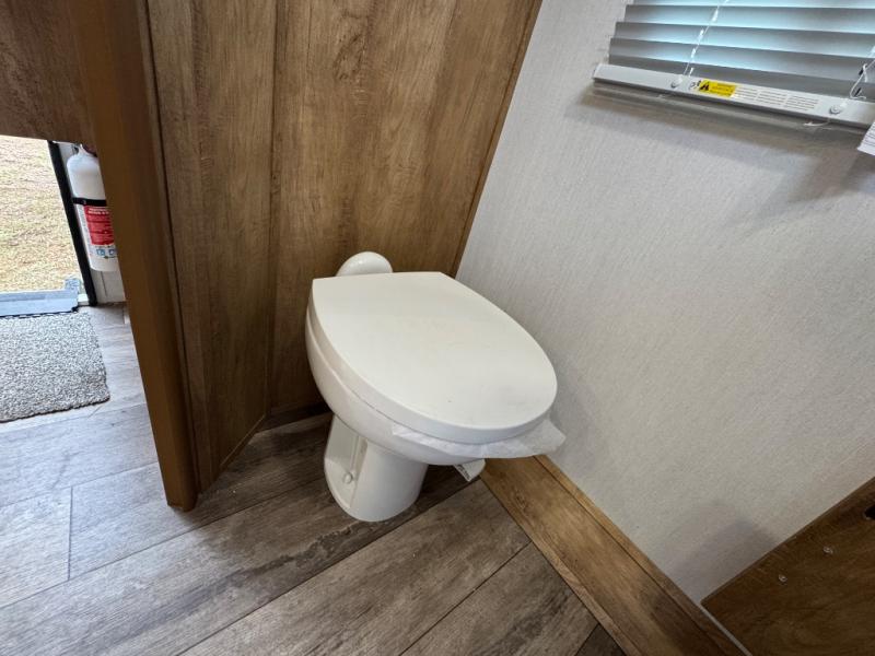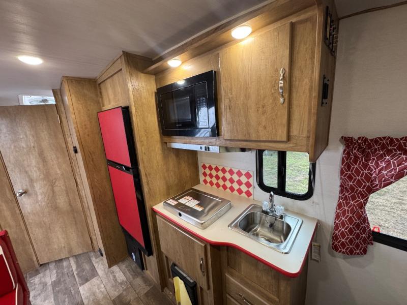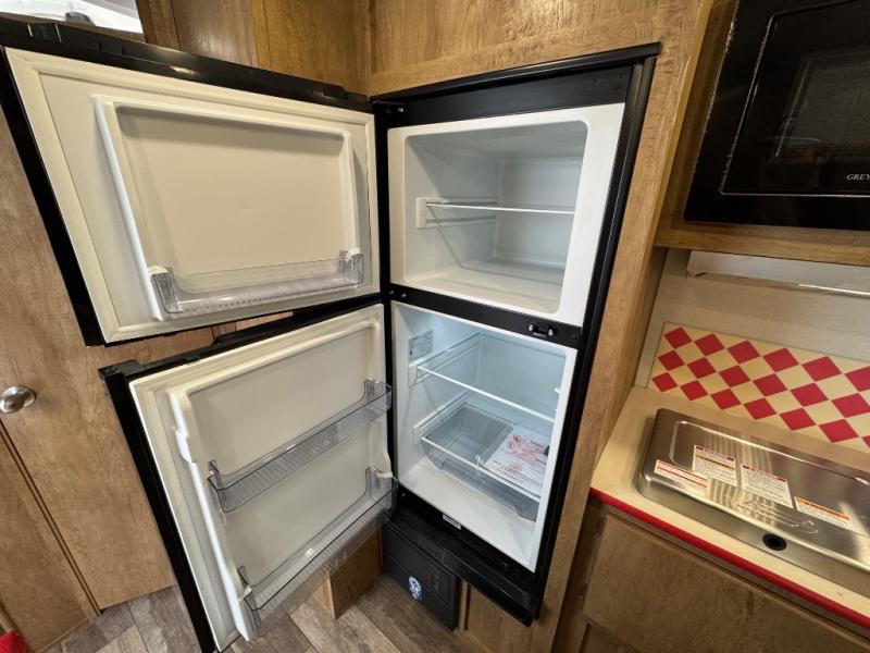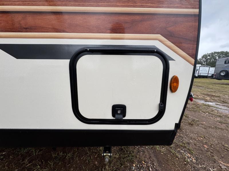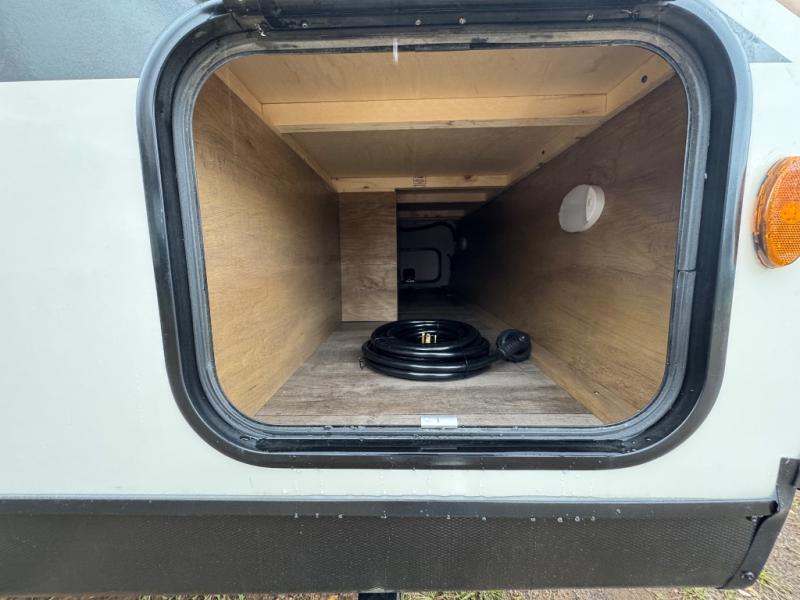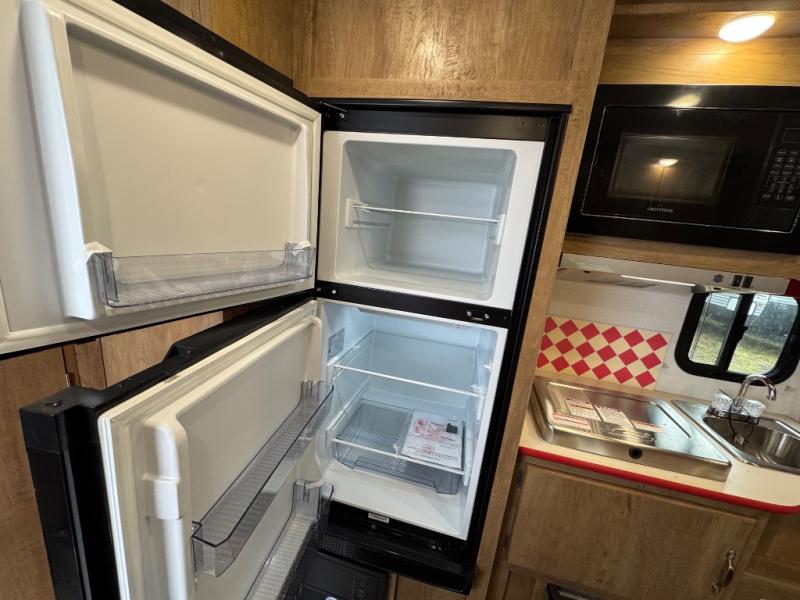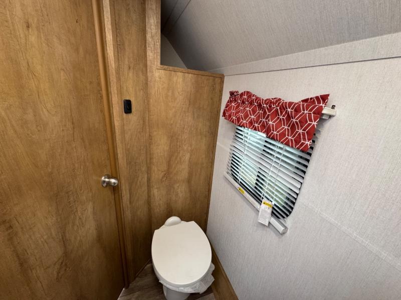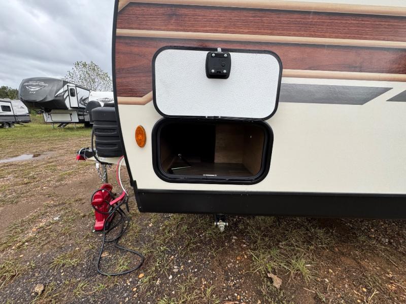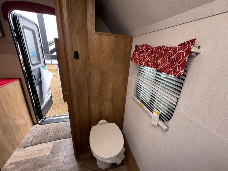 Make your camping trips memorable in this cozy travel trailer. Once you arrive at the campsite, you can unload the exterior pass-through storage, then head out on a trail to stretch your legs. The full bath will allow you to freshen up before dinner, and there is an entry closet with shelves to put your shoes and jackets up. A two burner cooktop and microwave oven comes standard, plus you'll find an 8 cu. ft. 12V refrigerator for your perishables. When it's time to call it a night, you'll enjoy the 54" x 74" front corner bed, while your overnight guest sleeps on the booth dinette!