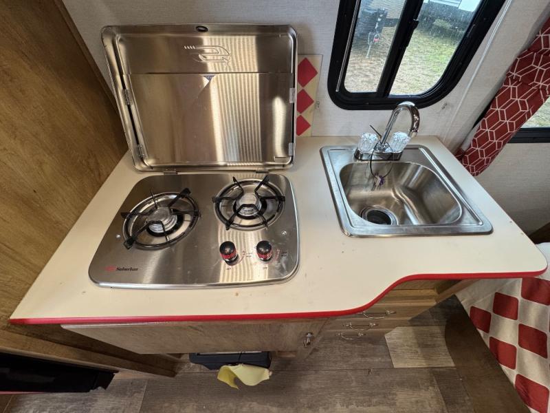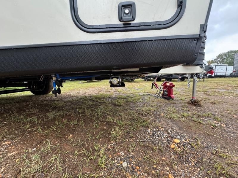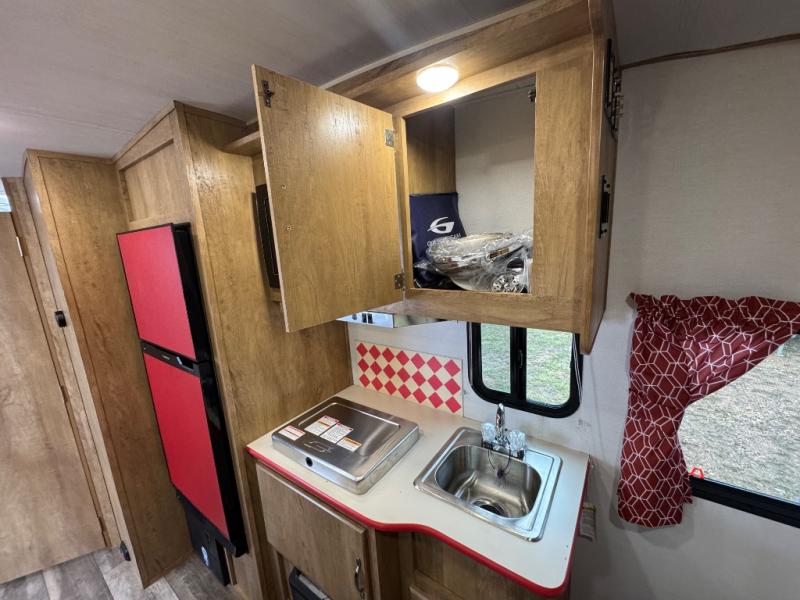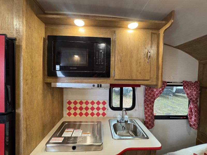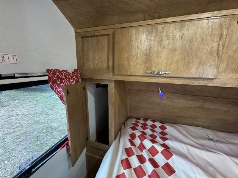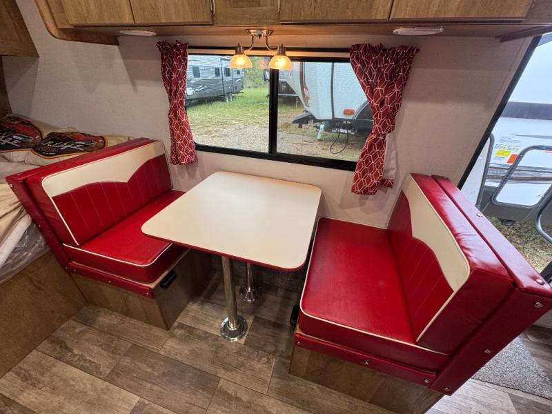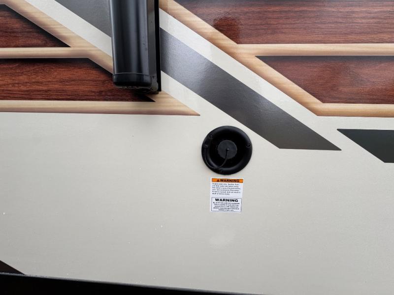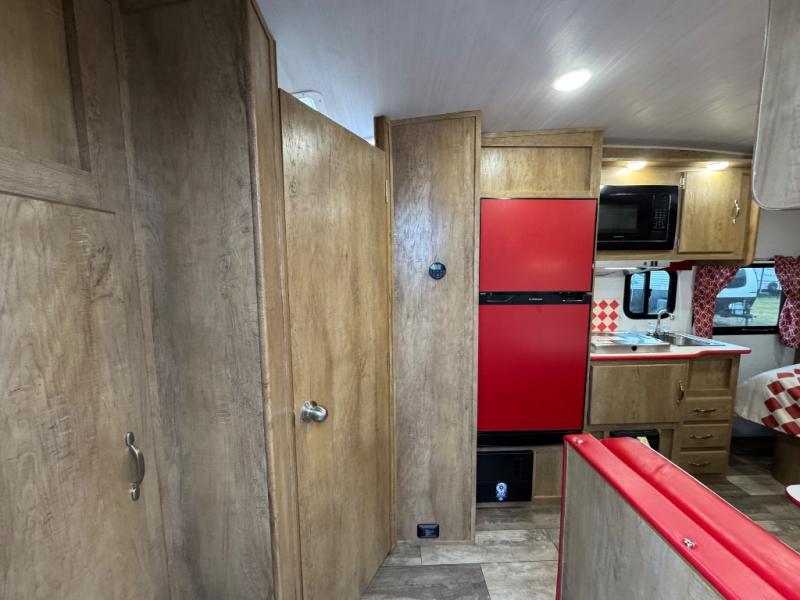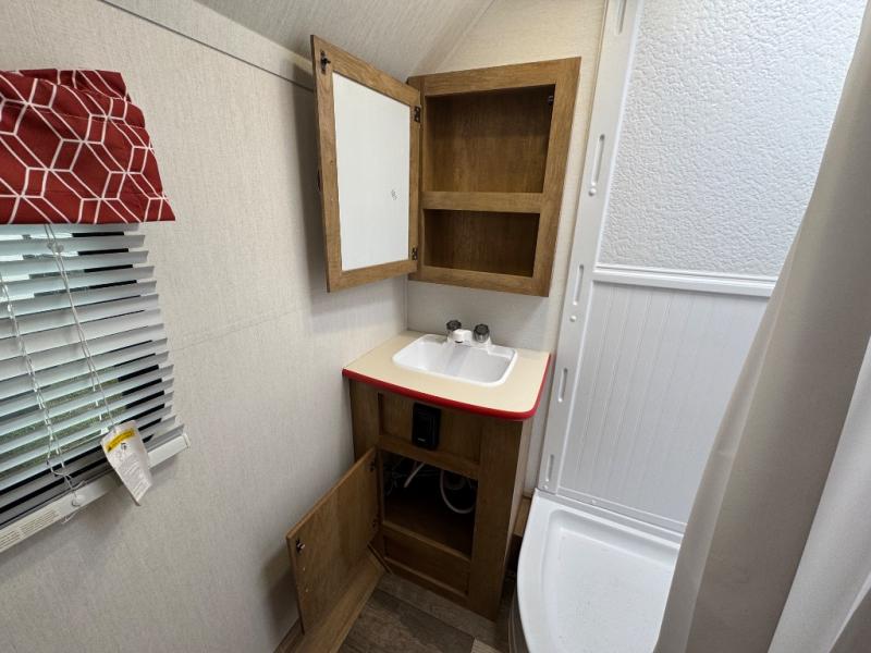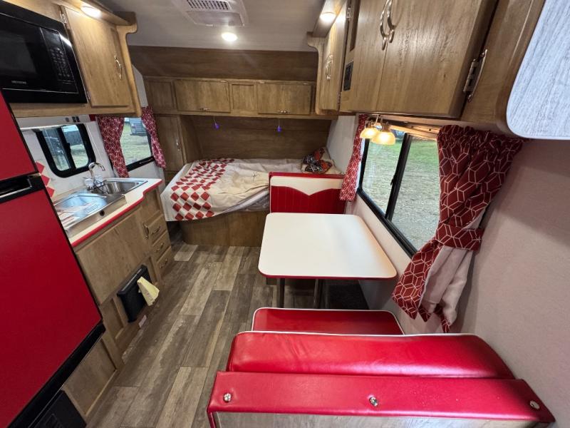 Make your camping trips memorable in this cozy travel trailer. Once you arrive at the campsite, you can unload the exterior pass-through storage, then head out on a trail to stretch your legs. The full bath will allow you to freshen up before dinner, and there is an entry closet with shelves to put your shoes and jackets up. A two burner cooktop and microwave oven comes standard, plus you'll find an 8 cu. ft. 12V refrigerator for your perishables. When it's time to call it a night, you'll enjoy the 54" x 74" front corner bed, while your overnight guest sleeps on the booth dinette!