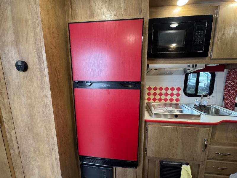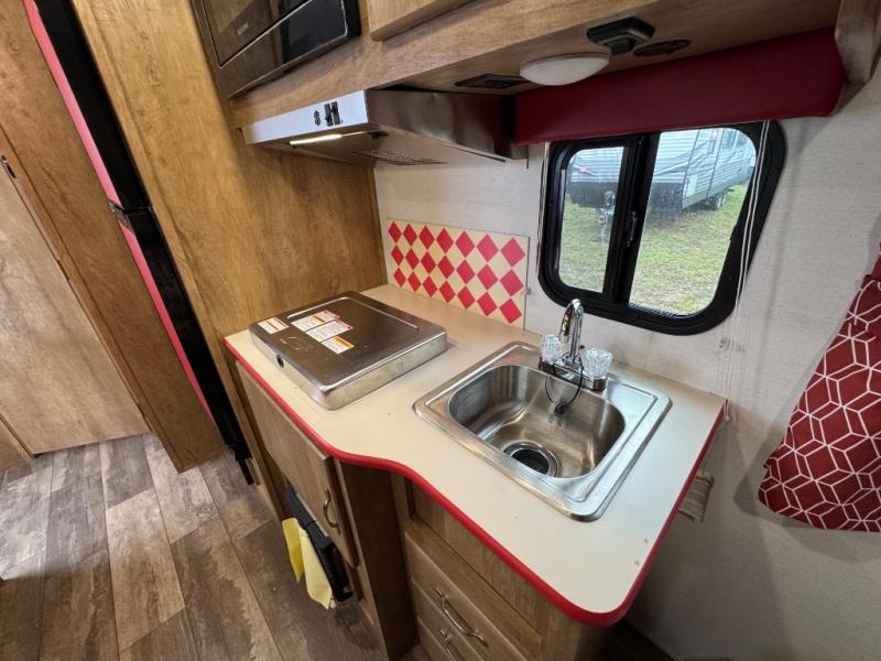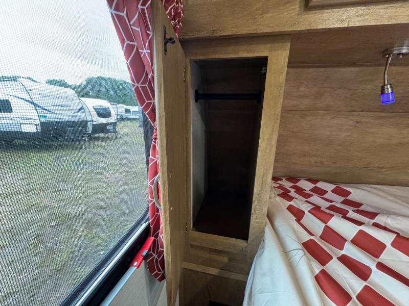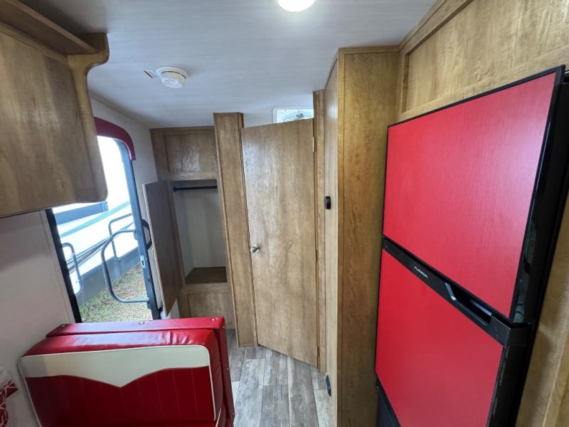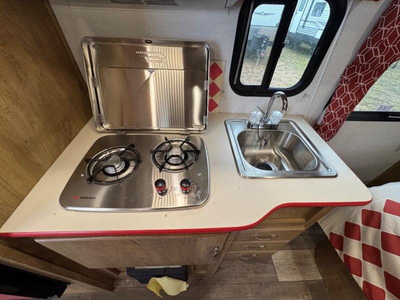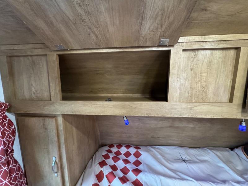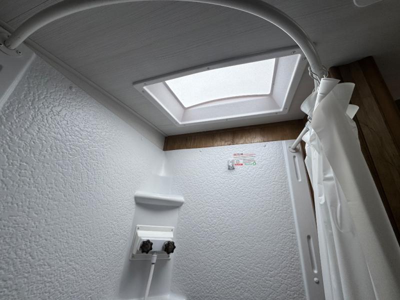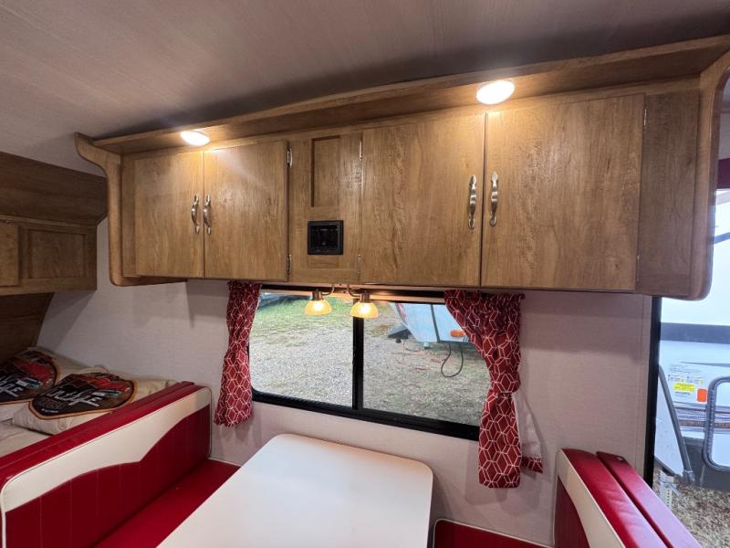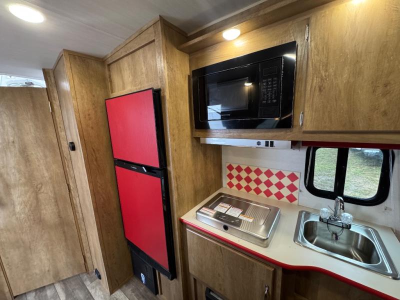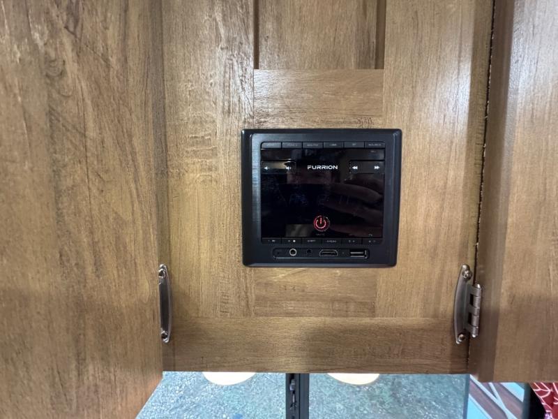 Make your camping trips memorable in this cozy travel trailer. Once you arrive at the campsite, you can unload the exterior pass-through storage, then head out on a trail to stretch your legs. The full bath will allow you to freshen up before dinner, and there is an entry closet with shelves to put your shoes and jackets up. A two burner cooktop and microwave oven comes standard, plus you'll find an 8 cu. ft. 12V refrigerator for your perishables. When it's time to call it a night, you'll enjoy the 54" x 74" front corner bed, while your overnight guest sleeps on the booth dinette!