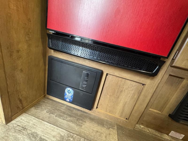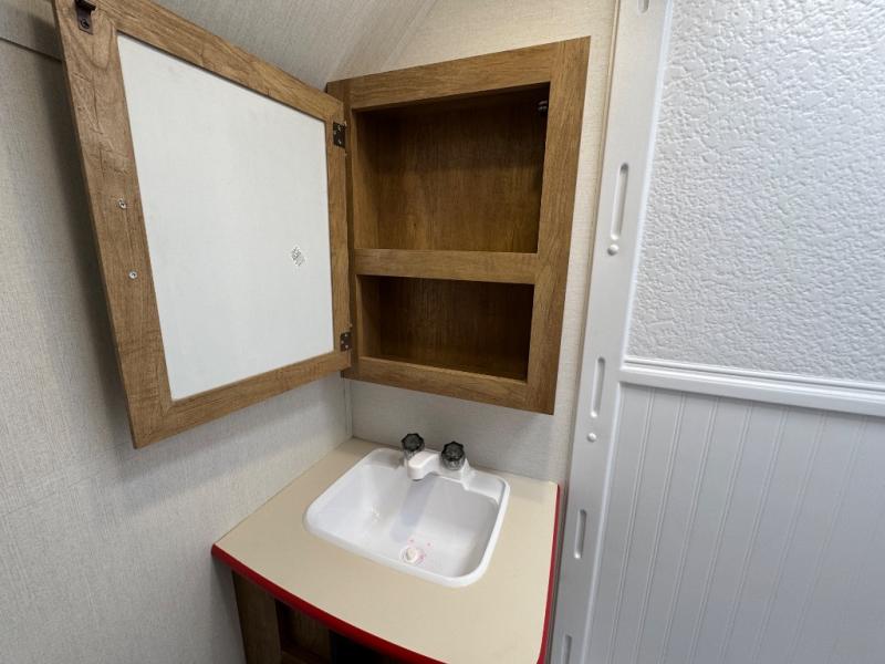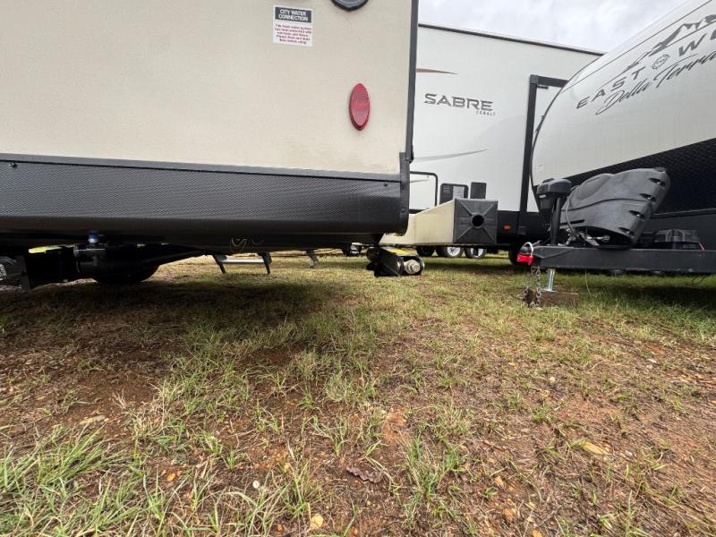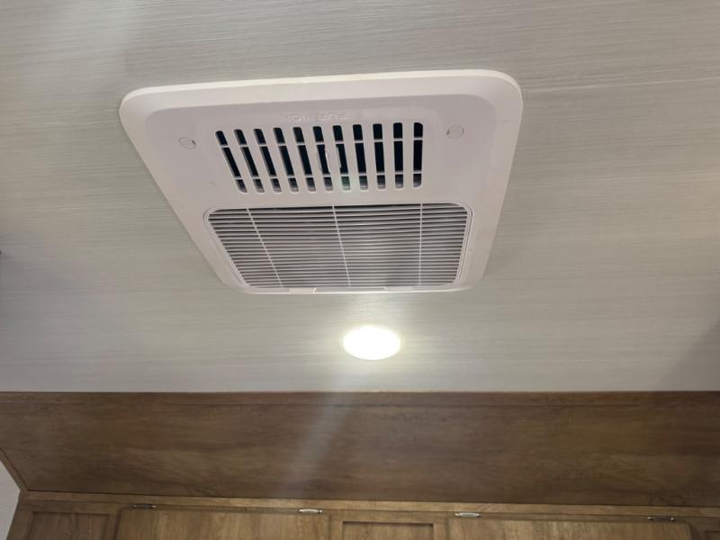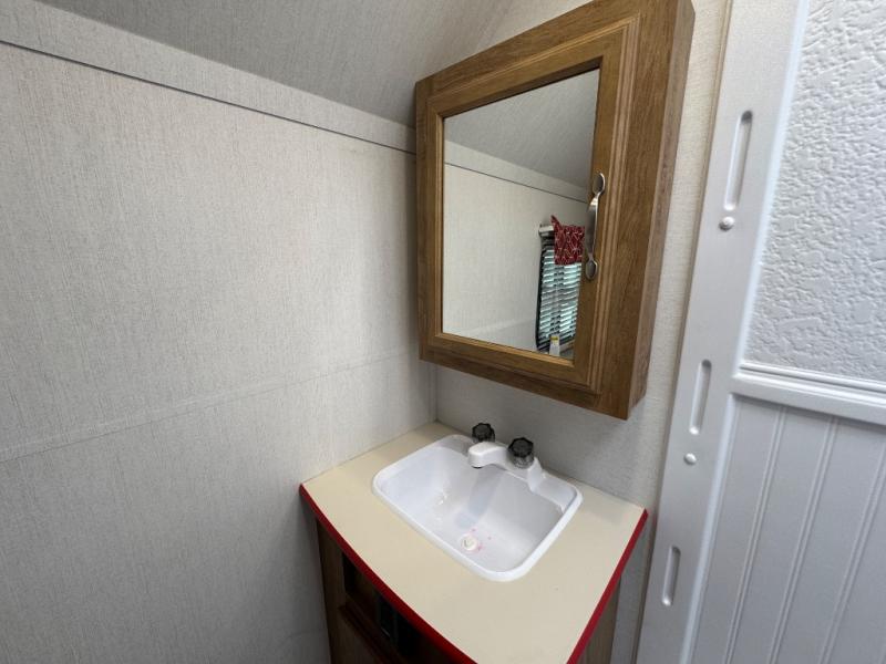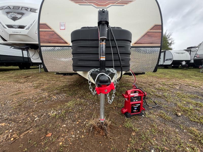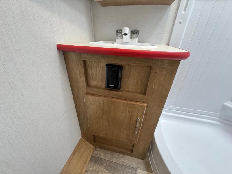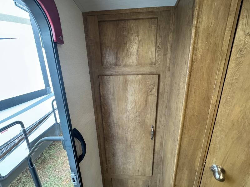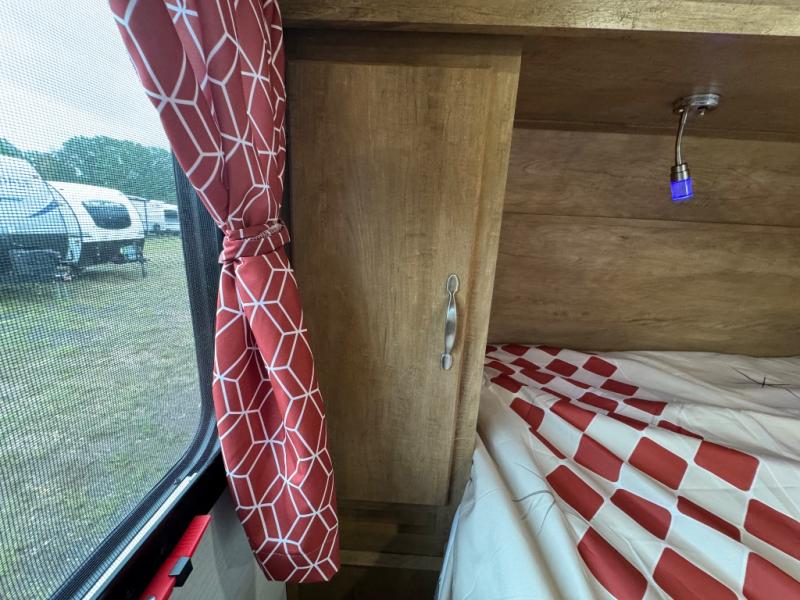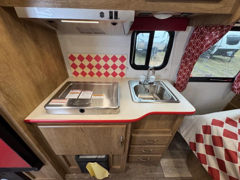 Make your camping trips memorable in this cozy travel trailer. Once you arrive at the campsite, you can unload the exterior pass-through storage, then head out on a trail to stretch your legs. The full bath will allow you to freshen up before dinner, and there is an entry closet with shelves to put your shoes and jackets up. A two burner cooktop and microwave oven comes standard, plus you'll find an 8 cu. ft. 12V refrigerator for your perishables. When it's time to call it a night, you'll enjoy the 54" x 74" front corner bed, while your overnight guest sleeps on the booth dinette!