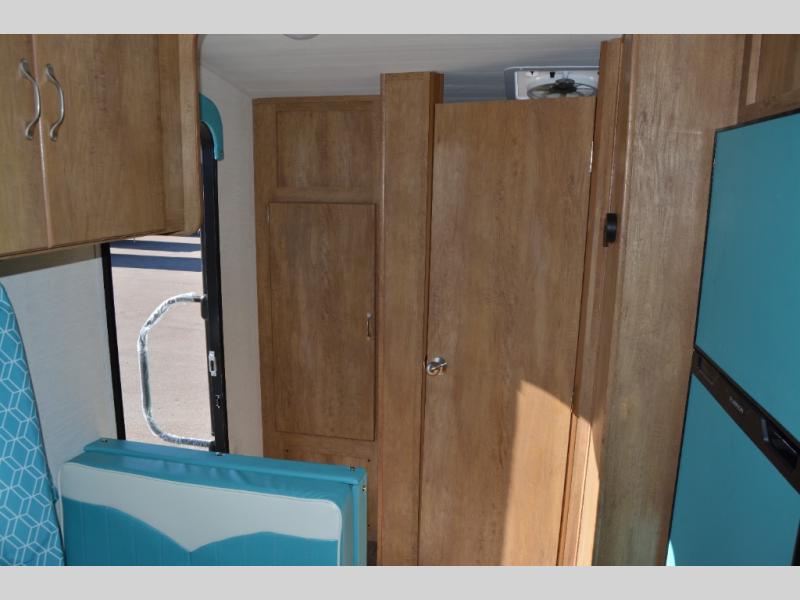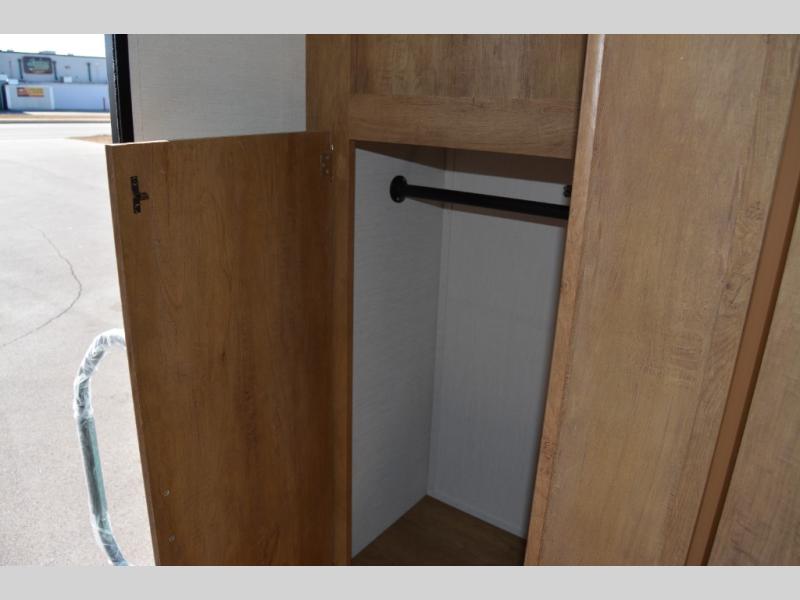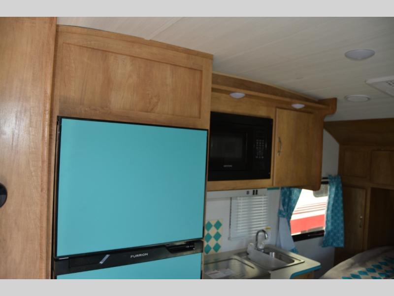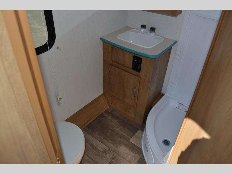 Make your camping trips memorable in this cozy travel trailer. Once you arrive at the campsite, you can unload the exterior pass-through storage, then head out on a trail to stretch your legs. The full bath will allow you to freshen up before dinner, and there is an entry closet with shelves to put your shoes and jackets up. A two burner cooktop and microwave oven comes standard, plus you'll find an 8 cu. ft. 12V refrigerator for your perishables. When it's time to call it a night, you'll enjoy the 54" x 74" front corner bed, while your overnight guest sleeps on the booth dinette!