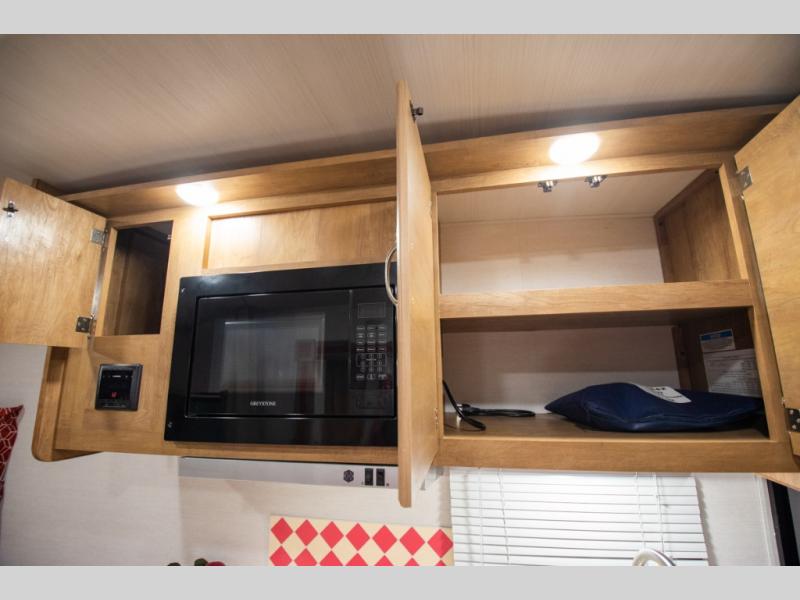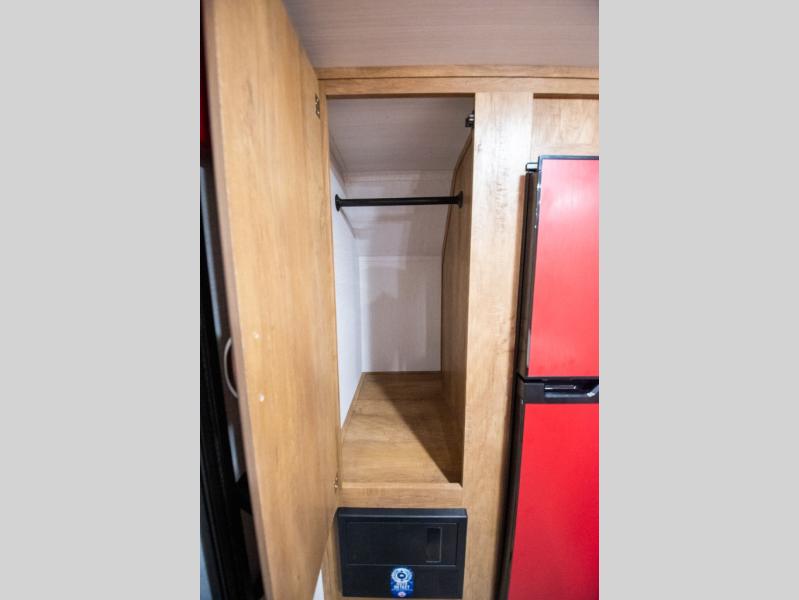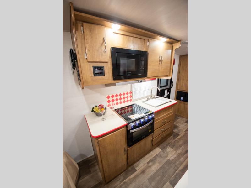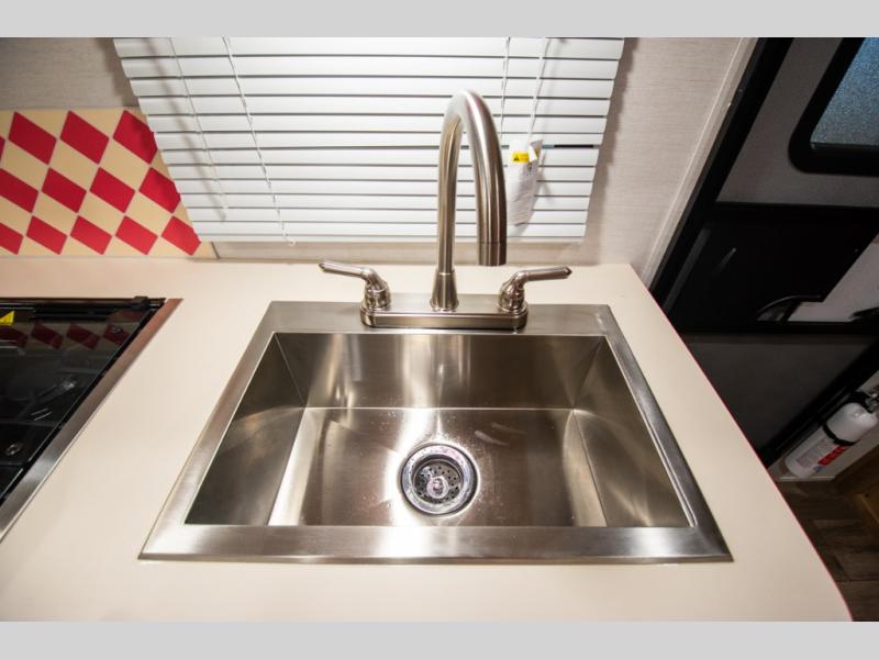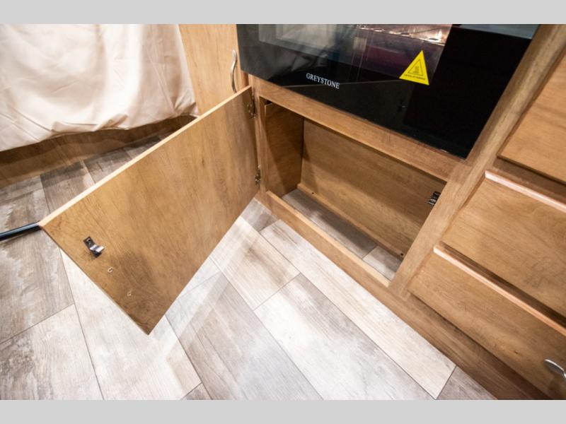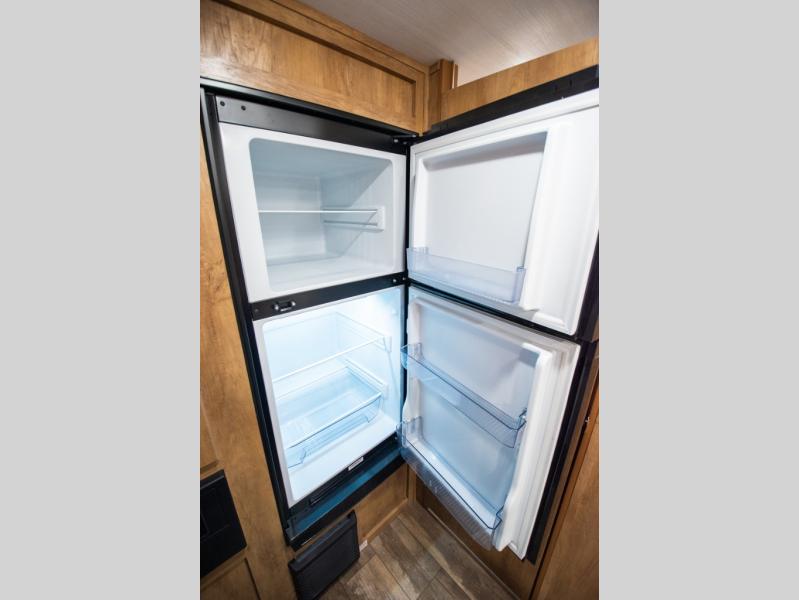 You'll enjoy every minute spent in this roomy travel trailer for four. The sofa bed slide with a table in front of it will provide more space, plus an area to relax, eat, and sleep a guest or two. A front RV queen bed will make this model feel more like home, especially with dual shirt closets on either side of the bed for your clothes. Whip up your best meals on the cooktop, or use the microwave oven if you're on the go. This model also includes an 8 cu. ft. 12V refrigerator and a pantry/closet for plenty of storage space!