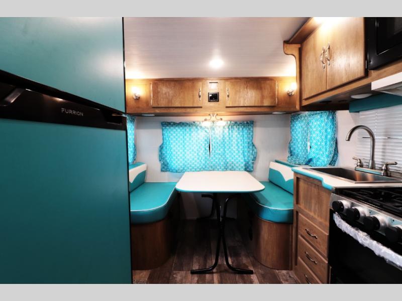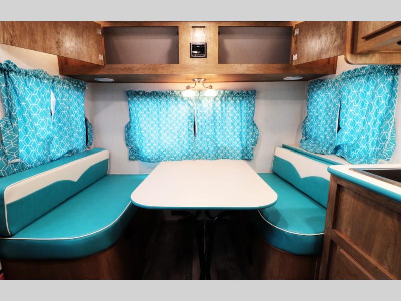 Rear booth dinette surrounded by windows—convertible for guests or family.