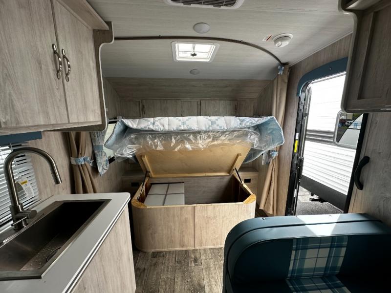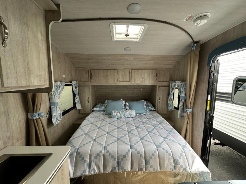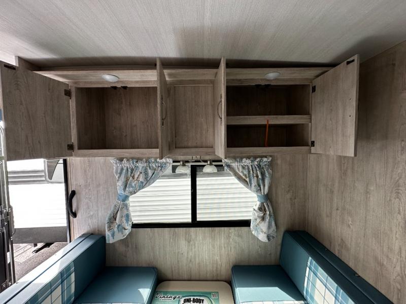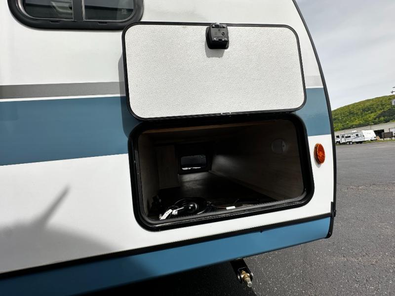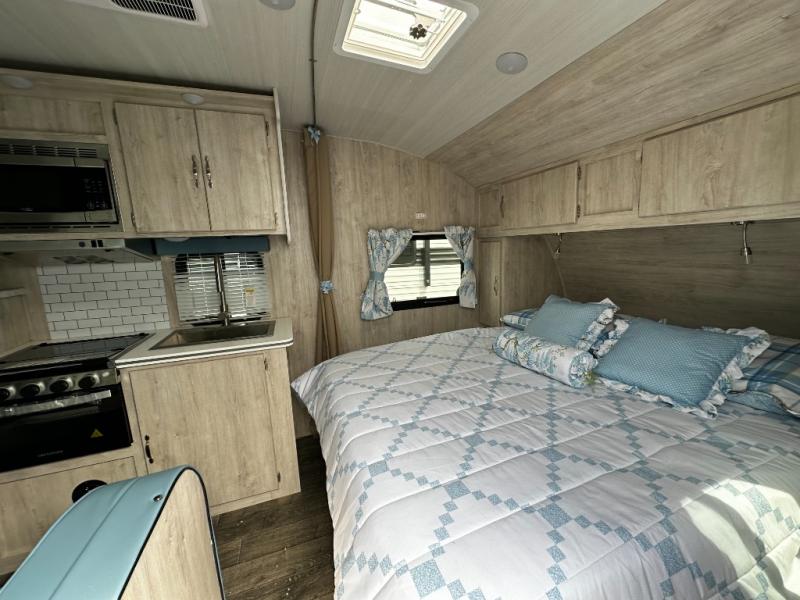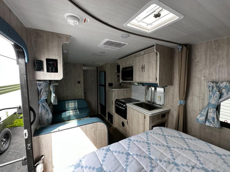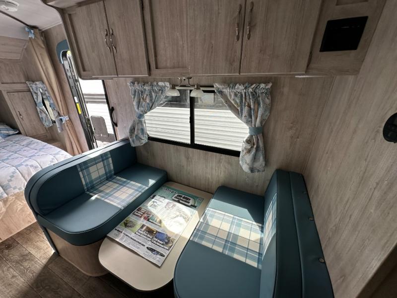 This travel trailer has the same layout as model 18MBS, but you'll enjoy a fixed RV queen bed up front instead of the Murphy bed. The full rear bath includes a linen closet and a wardrobe to keep your necessities organized, and you'll find additional storage throughout this model for your belongings. The vintage booth dinette will be the perfect place to dine at after dinner is made on the cooktop. There is also a microwave oven for quick meals and an 8 cu. ft. 12V refrigerator for cold drinks and perishables. And don't forget about the exterior pass-through storage for your larger camp gear!