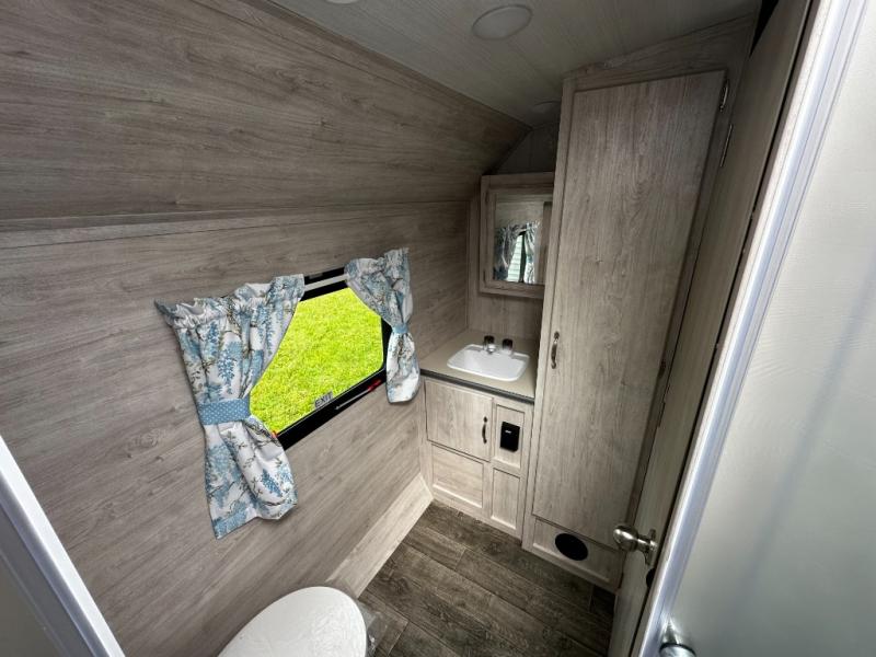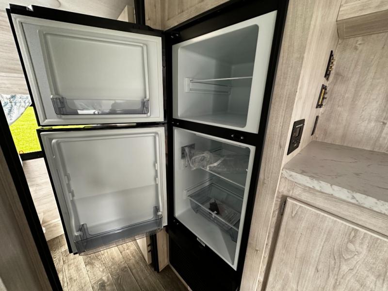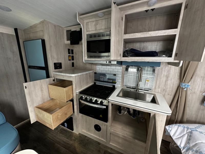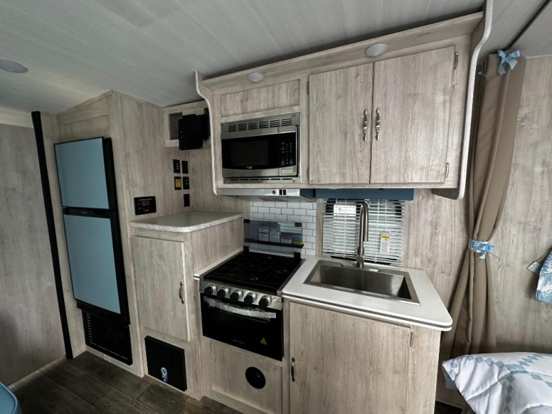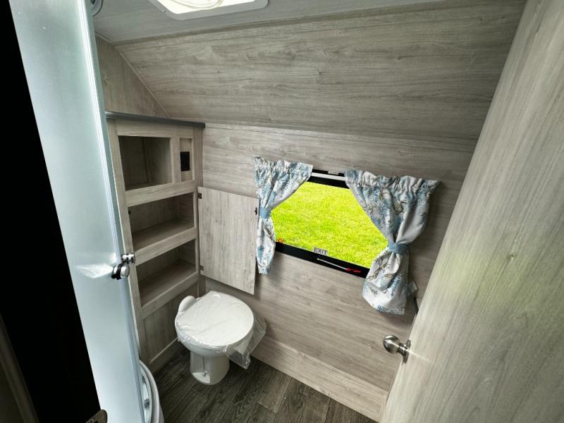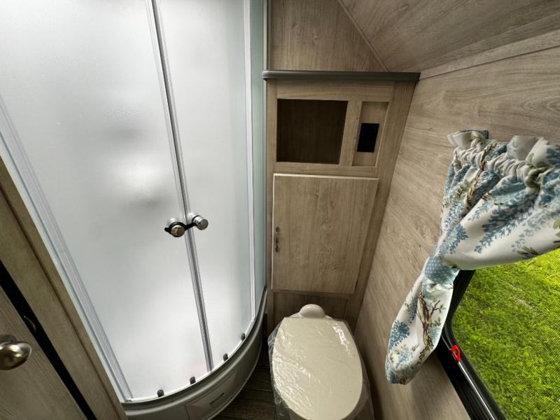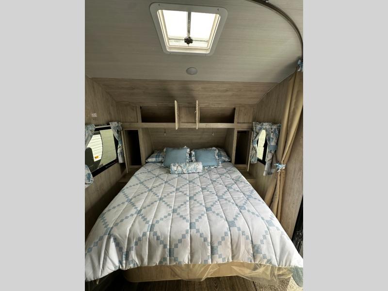 This travel trailer has the same layout as model 18MBS, but you'll enjoy a fixed RV queen bed up front instead of the Murphy bed. The full rear bath includes a linen closet and a wardrobe to keep your necessities organized, and you'll find additional storage throughout this model for your belongings. The vintage booth dinette will be the perfect place to dine at after dinner is made on the cooktop. There is also a microwave oven for quick meals and an 8 cu. ft. 12V refrigerator for cold drinks and perishables. And don't forget about the exterior pass-through storage for your larger camp gear!