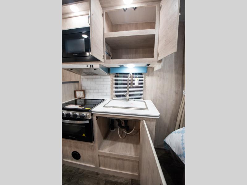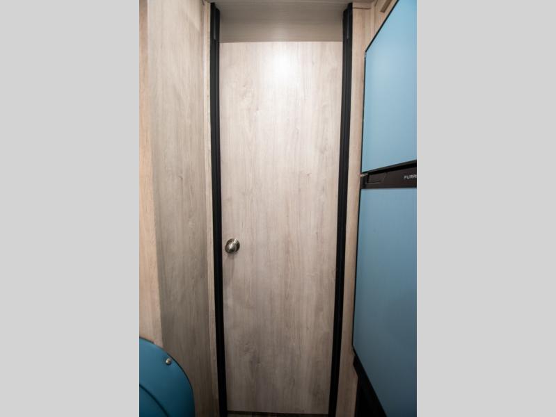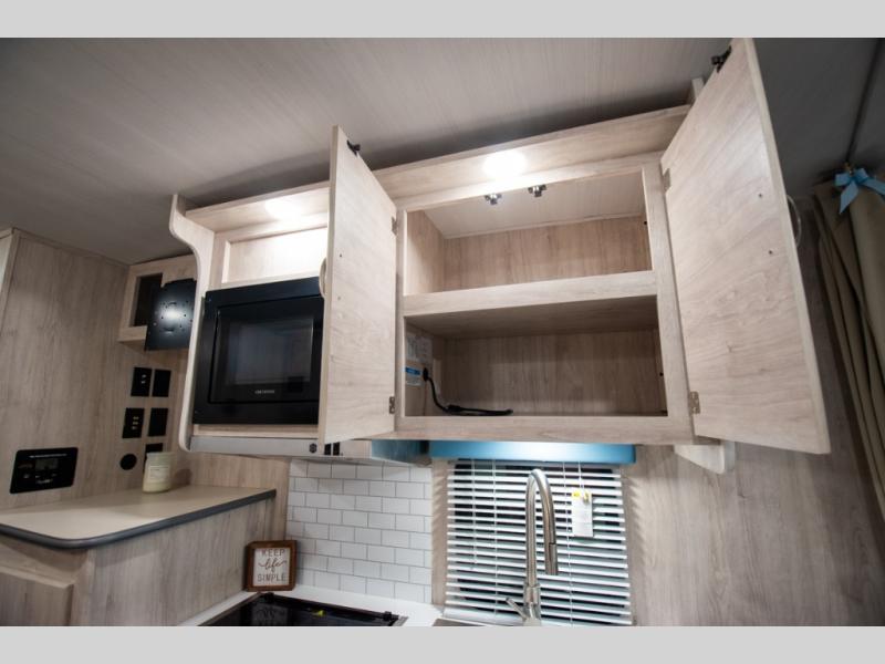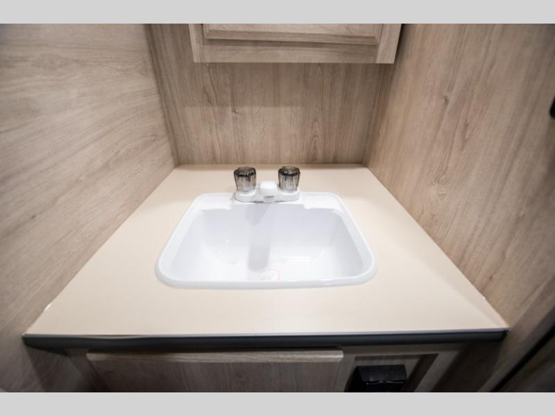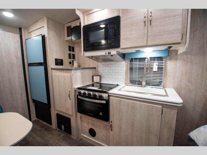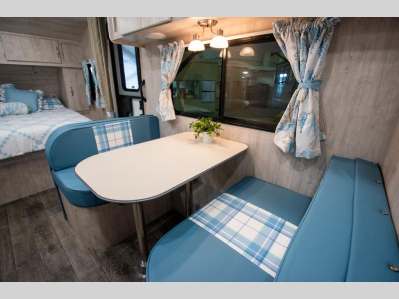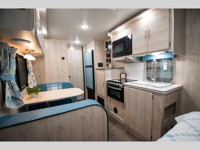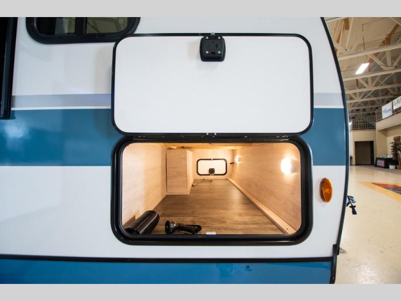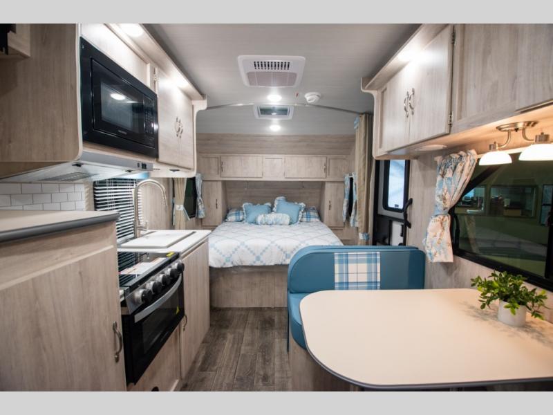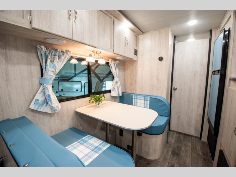 This travel trailer has the same layout as model 18MBS, but you'll enjoy a fixed RV queen bed up front instead of the Murphy bed. The full rear bath includes a linen closet and a wardrobe to keep your necessities organized, and you'll find additional storage throughout this model for your belongings. The vintage booth dinette will be the perfect place to dine at after dinner is made on the cooktop. There is also a microwave oven for quick meals and an 8 cu. ft. 12V refrigerator for cold drinks and perishables. And don't forget about the exterior pass-through storage for your larger camp gear!