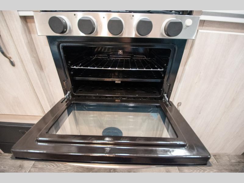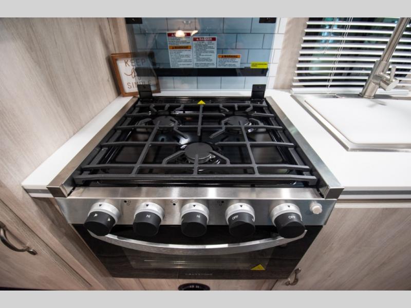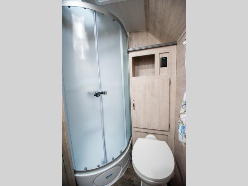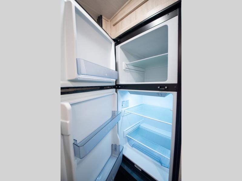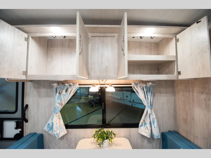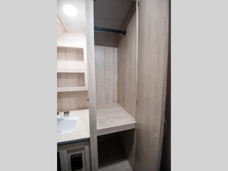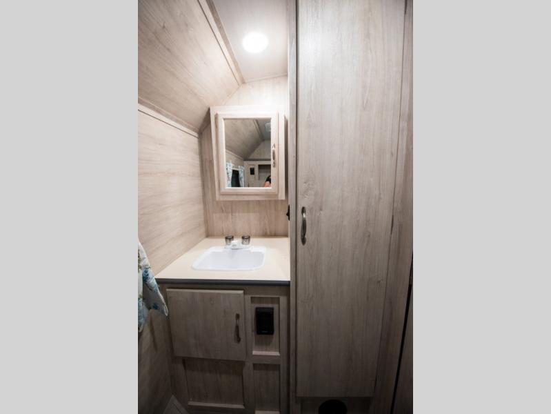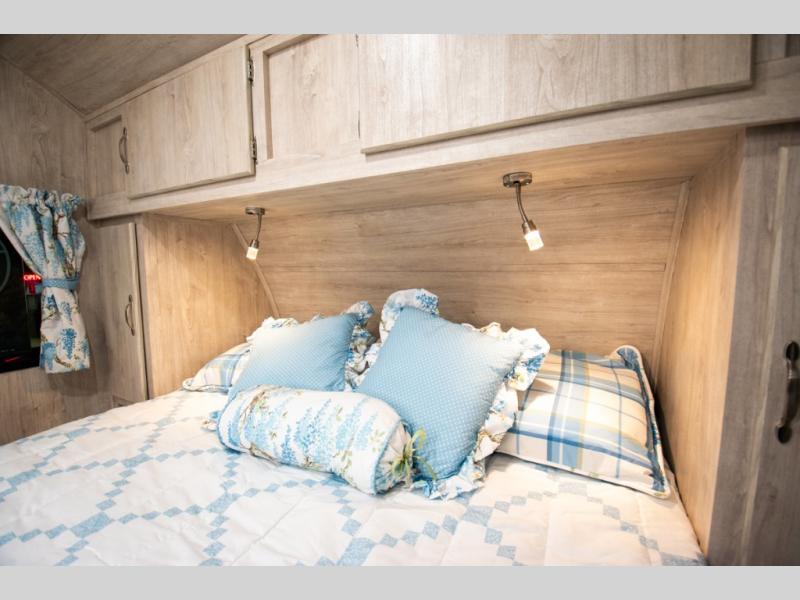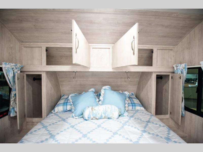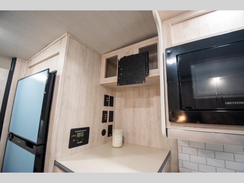 This travel trailer has the same layout as model 18MBS, but you'll enjoy a fixed RV queen bed up front instead of the Murphy bed. The full rear bath includes a linen closet and a wardrobe to keep your necessities organized, and you'll find additional storage throughout this model for your belongings. The vintage booth dinette will be the perfect place to dine at after dinner is made on the cooktop. There is also a microwave oven for quick meals and an 8 cu. ft. 12V refrigerator for cold drinks and perishables. And don't forget about the exterior pass-through storage for your larger camp gear!