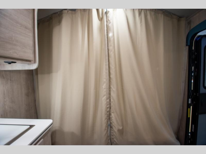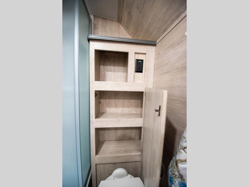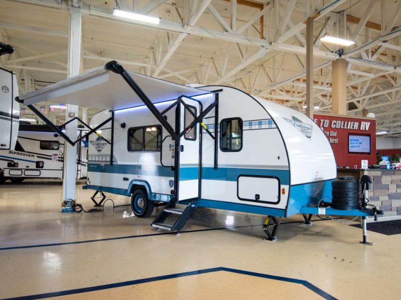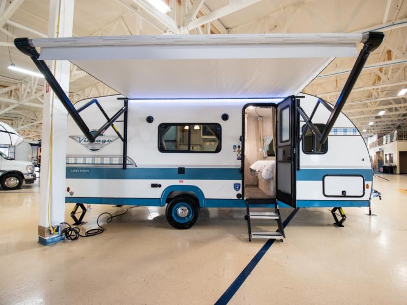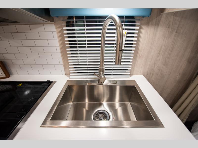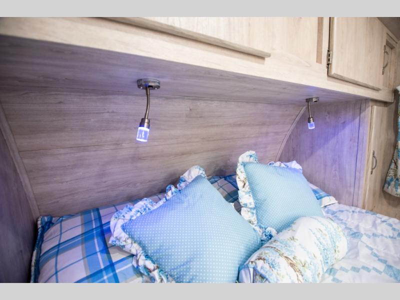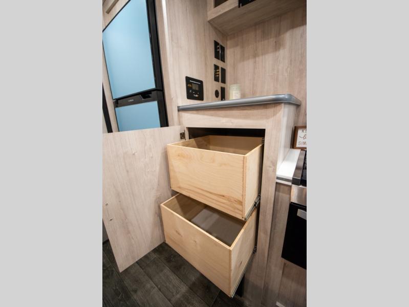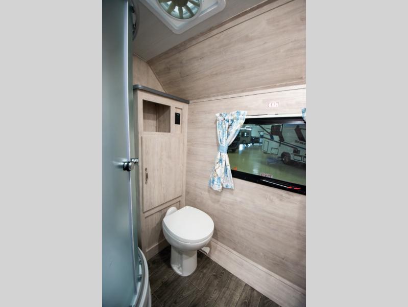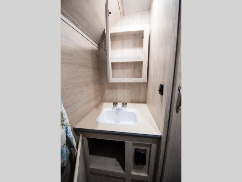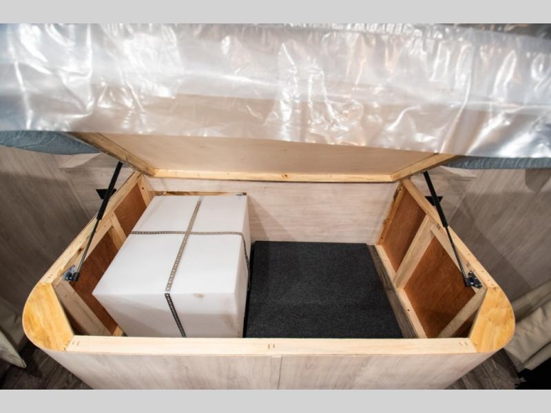 This travel trailer has the same layout as model 18MBS, but you'll enjoy a fixed RV queen bed up front instead of the Murphy bed. The full rear bath includes a linen closet and a wardrobe to keep your necessities organized, and you'll find additional storage throughout this model for your belongings. The vintage booth dinette will be the perfect place to dine at after dinner is made on the cooktop. There is also a microwave oven for quick meals and an 8 cu. ft. 12V refrigerator for cold drinks and perishables. And don't forget about the exterior pass-through storage for your larger camp gear!