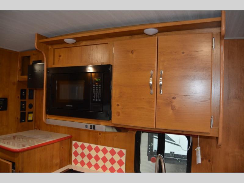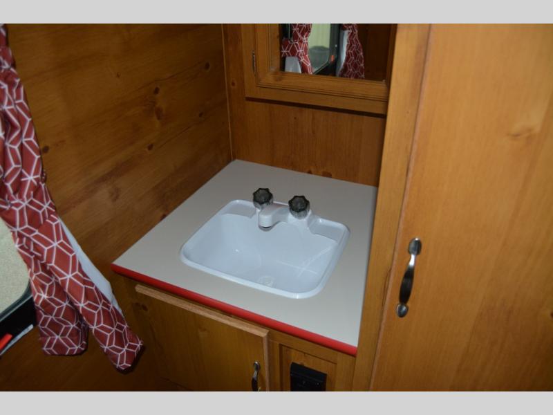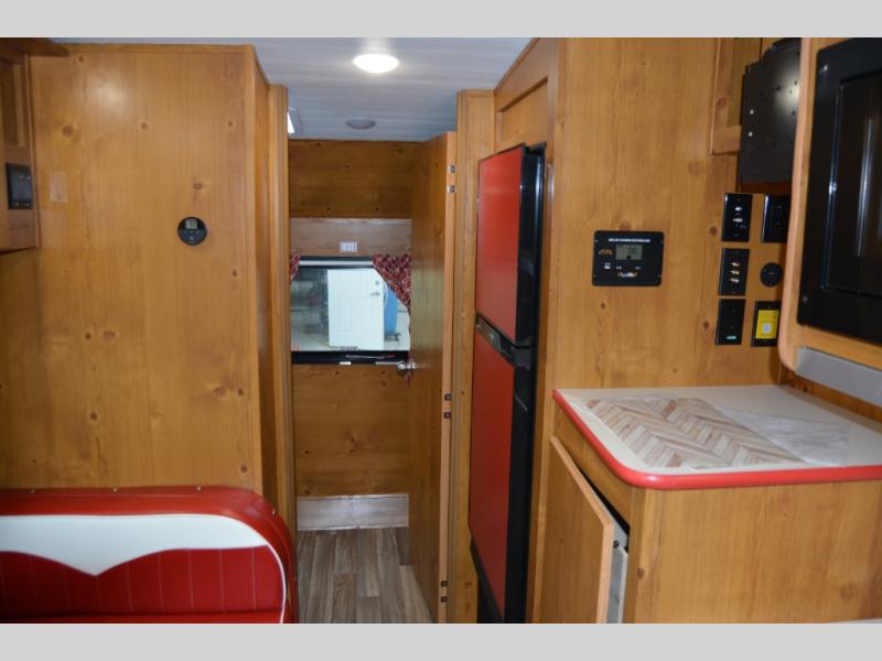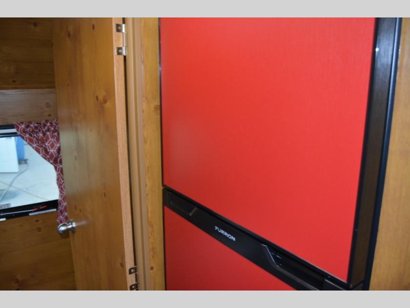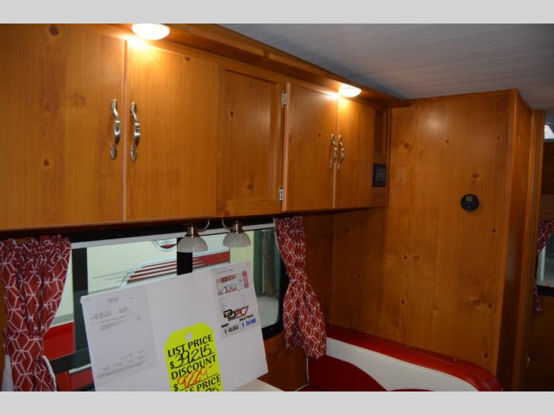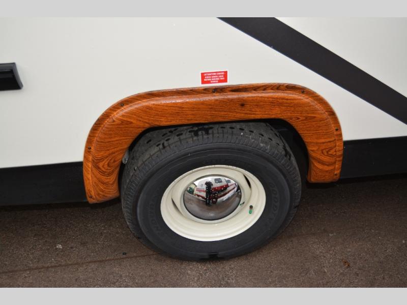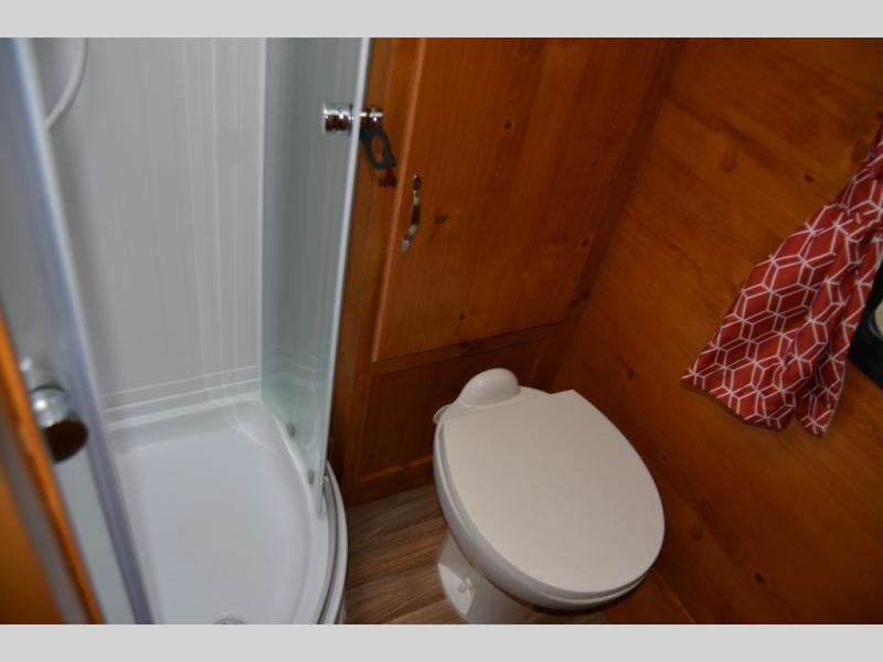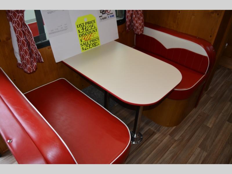 This travel trailer has the same layout as model 18MBS, but you'll enjoy a fixed RV queen bed up front instead of the Murphy bed. The full rear bath includes a linen closet and a wardrobe to keep your necessities organized, and you'll find additional storage throughout this model for your belongings. The vintage booth dinette will be the perfect place to dine at after dinner is made on the cooktop. There is also a microwave oven for quick meals and an 8 cu. ft. 12V refrigerator for cold drinks and perishables. And don't forget about the exterior pass-through storage for your larger camp gear!