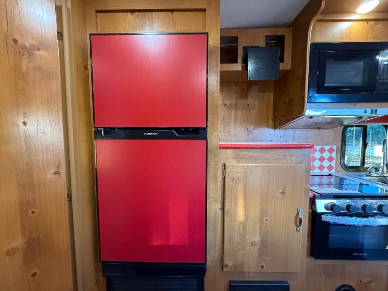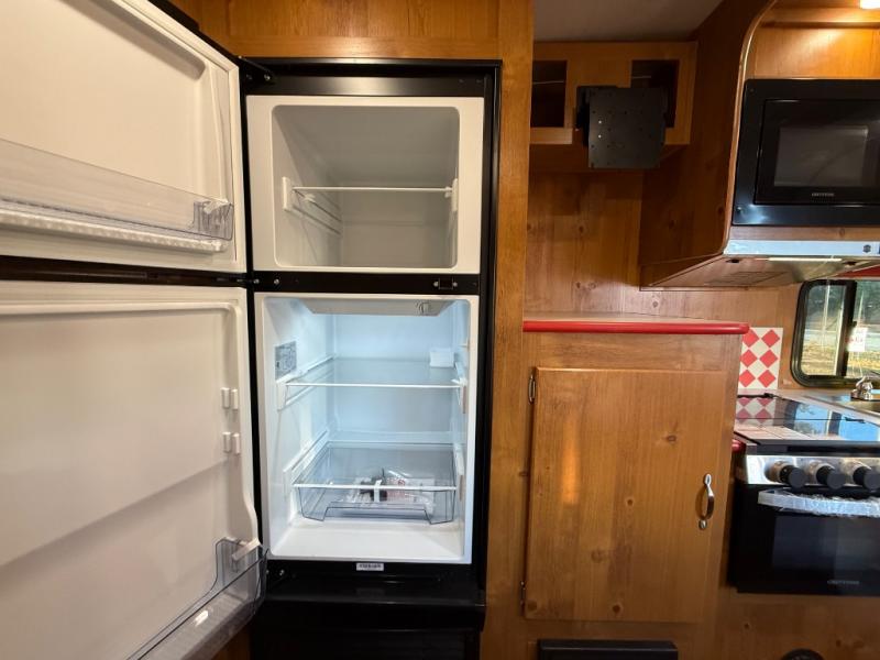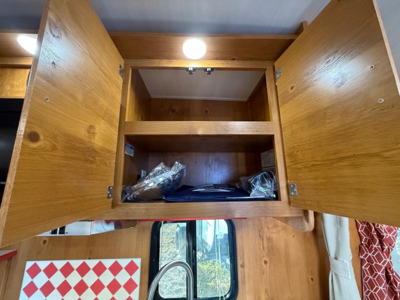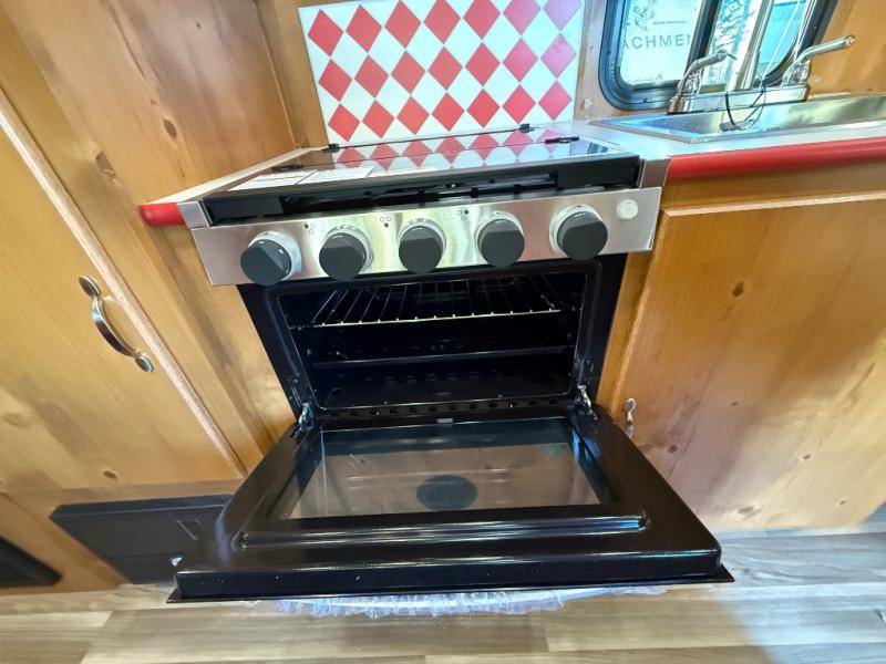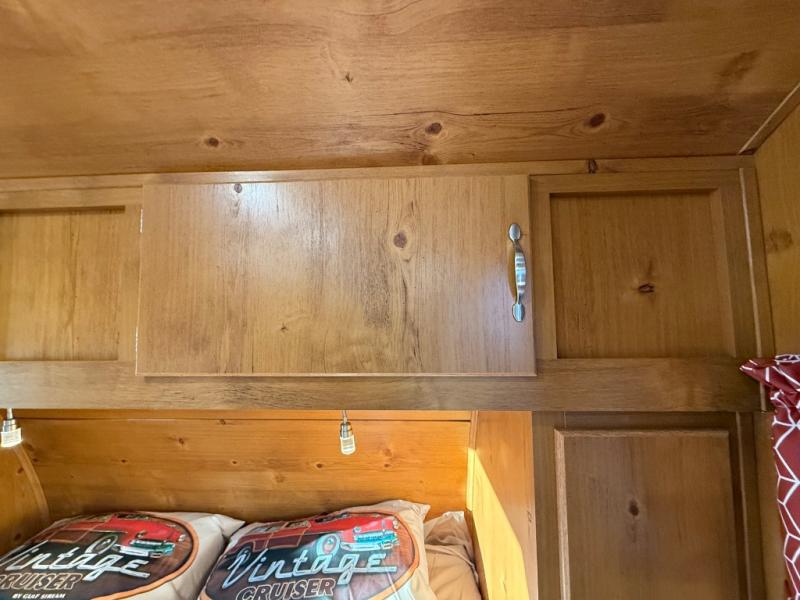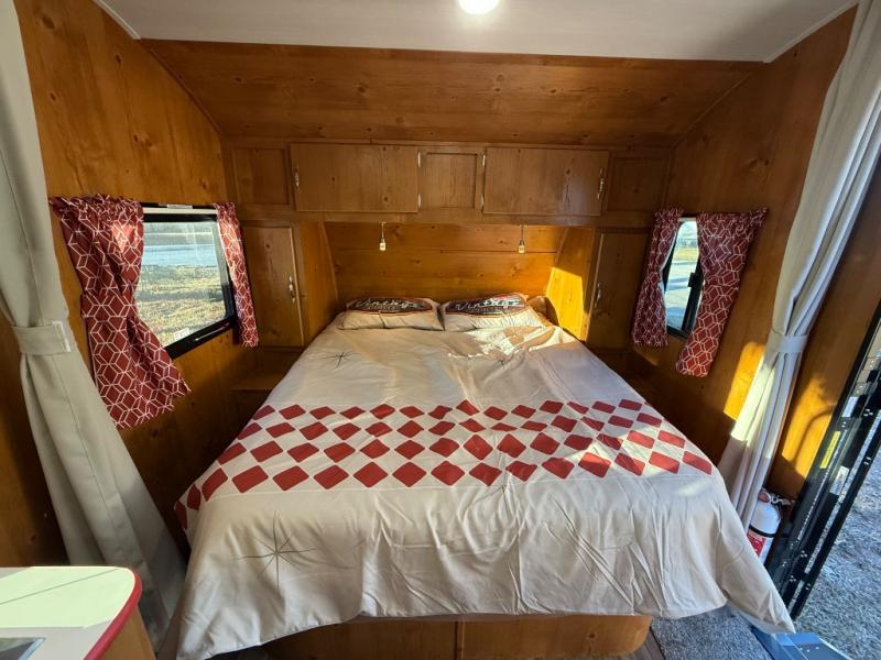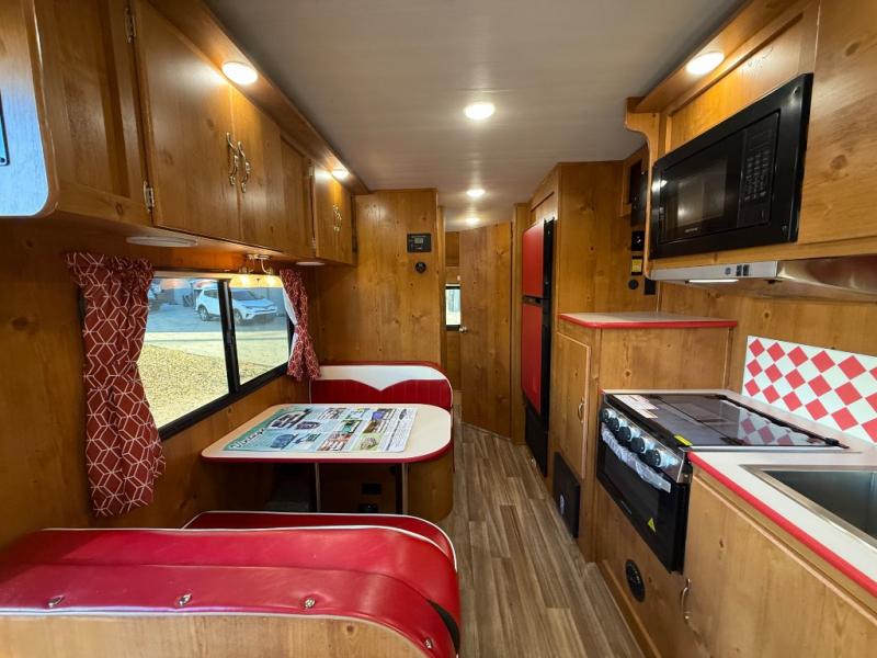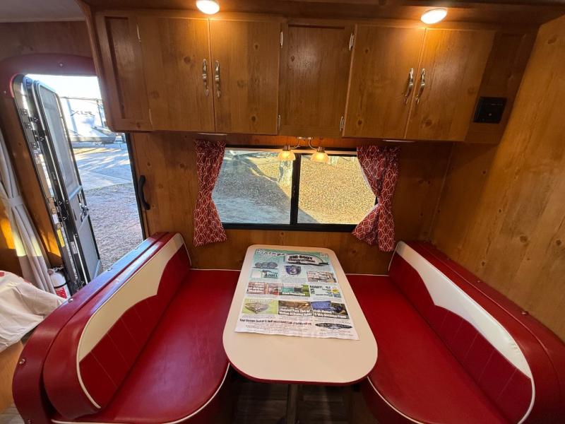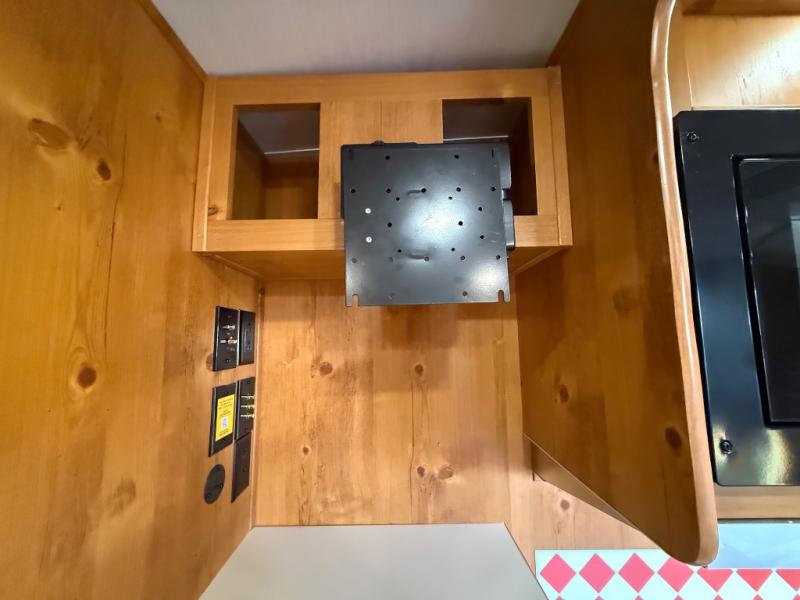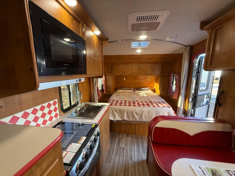 This travel trailer has the same layout as model 18MBS, but you'll enjoy a fixed RV queen bed up front instead of the Murphy bed. The full rear bath includes a linen closet and a wardrobe to keep your necessities organized, and you'll find additional storage throughout this model for your belongings. The vintage booth dinette will be the perfect place to dine at after dinner is made on the cooktop. There is also a microwave oven for quick meals and an 8 cu. ft. 12V refrigerator for cold drinks and perishables. And don't forget about the exterior pass-through storage for your larger camp gear!
