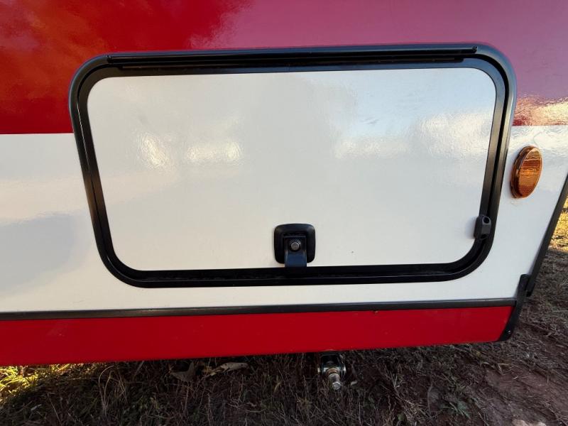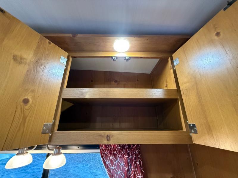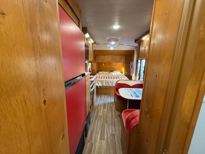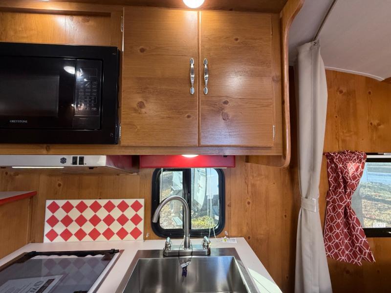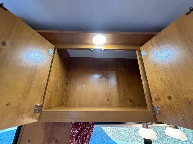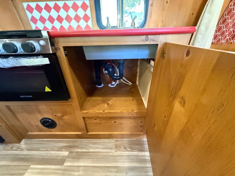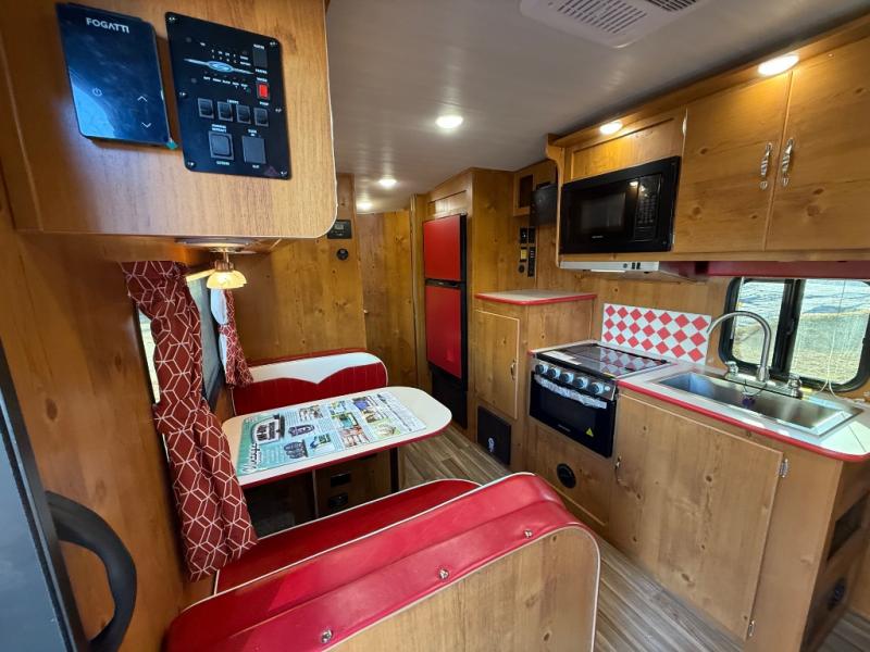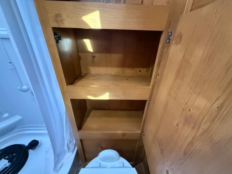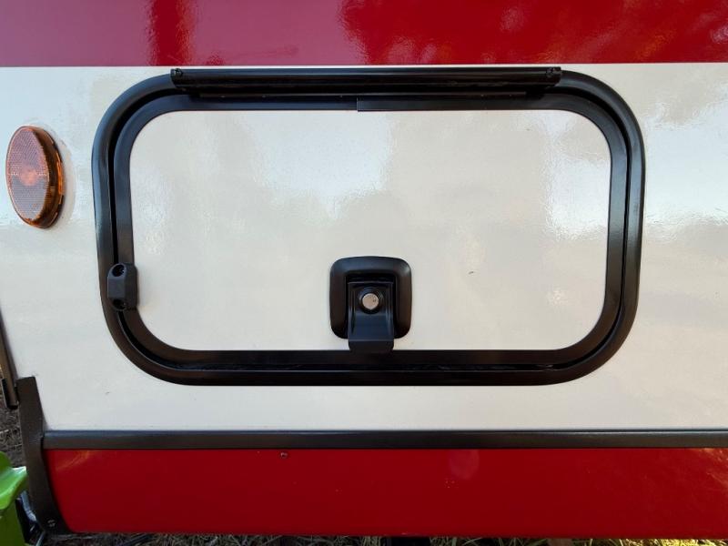 This travel trailer has the same layout as model 18MBS, but you'll enjoy a fixed RV queen bed up front instead of the Murphy bed. The full rear bath includes a linen closet and a wardrobe to keep your necessities organized, and you'll find additional storage throughout this model for your belongings. The vintage booth dinette will be the perfect place to dine at after dinner is made on the cooktop. There is also a microwave oven for quick meals and an 8 cu. ft. 12V refrigerator for cold drinks and perishables. And don't forget about the exterior pass-through storage for your larger camp gear!
