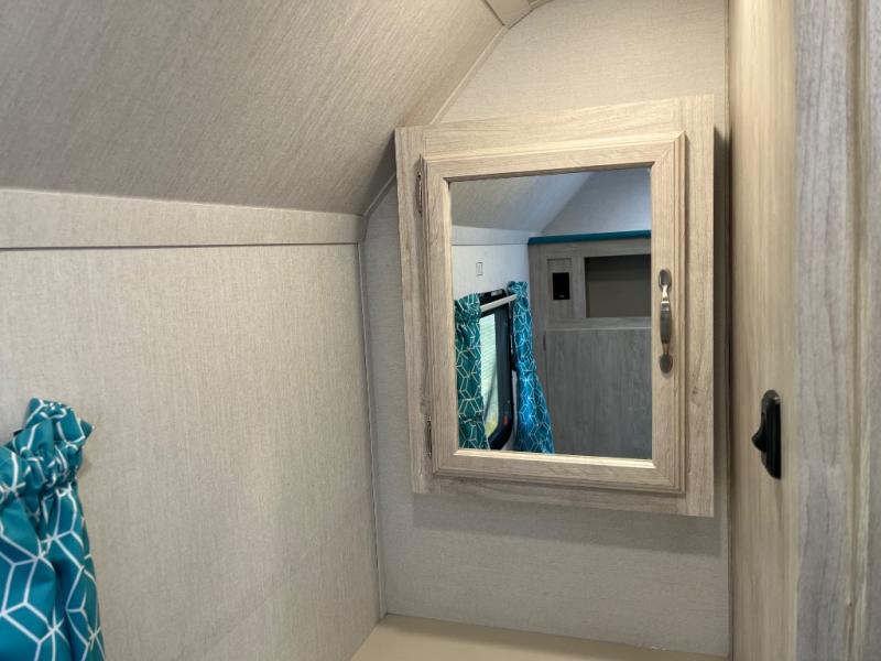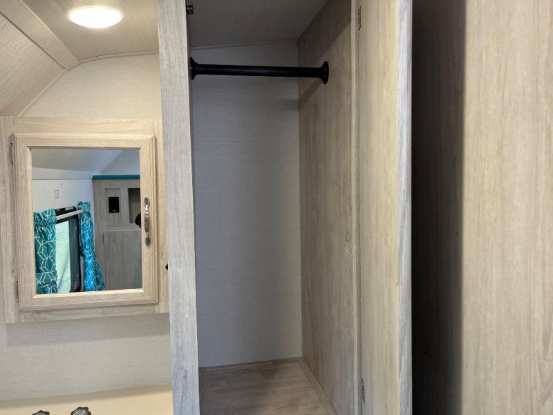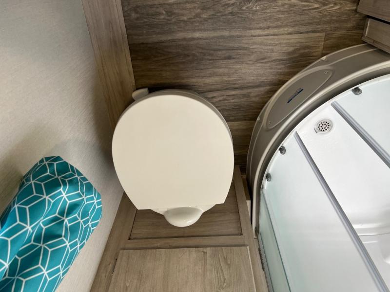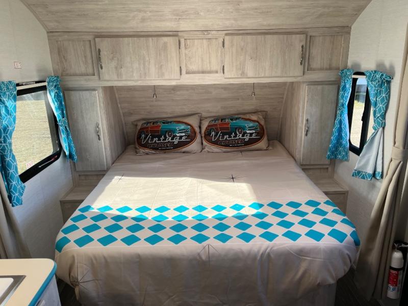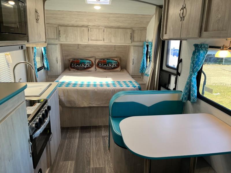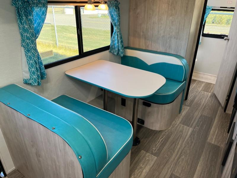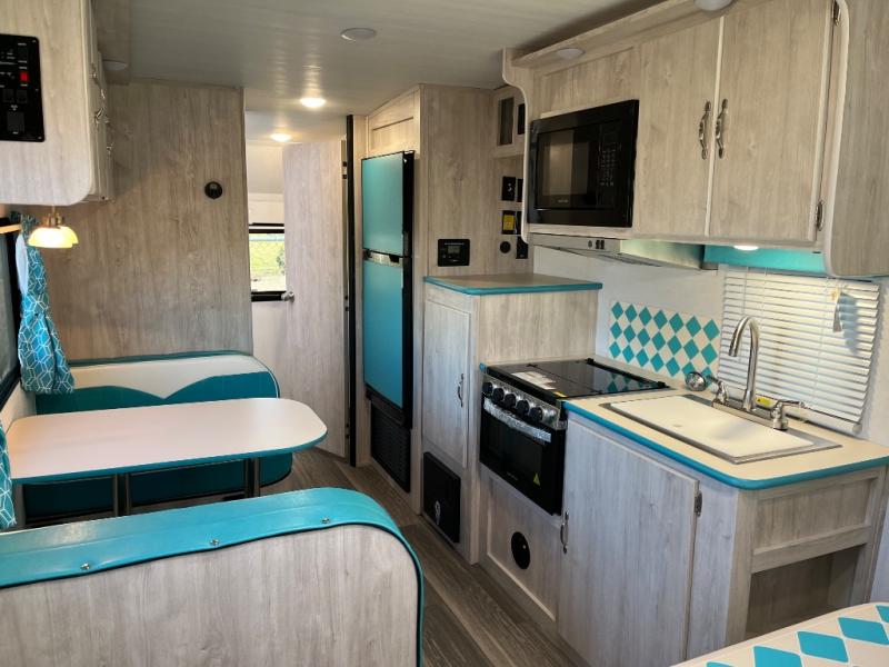 This travel trailer has the same layout as model 18MBS, but you'll enjoy a fixed RV queen bed up front instead of the Murphy bed. The full rear bath includes a linen closet and a wardrobe to keep your necessities organized, and you'll find additional storage throughout this model for your belongings. The vintage booth dinette will be the perfect place to dine at after dinner is made on the cooktop. There is also a microwave oven for quick meals and an 8 cu. ft. 12V refrigerator for cold drinks and perishables. And don't forget about the exterior pass-through storage for your larger camp gear!