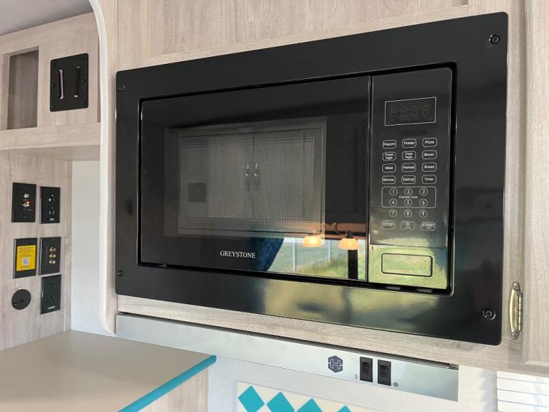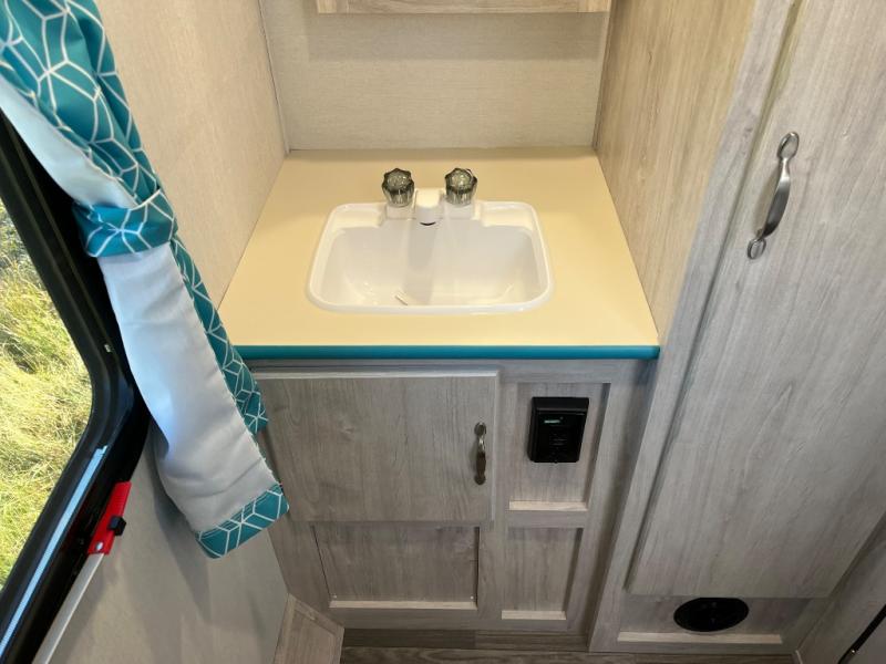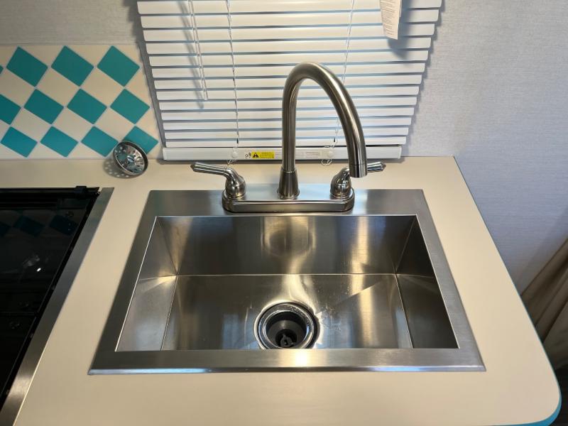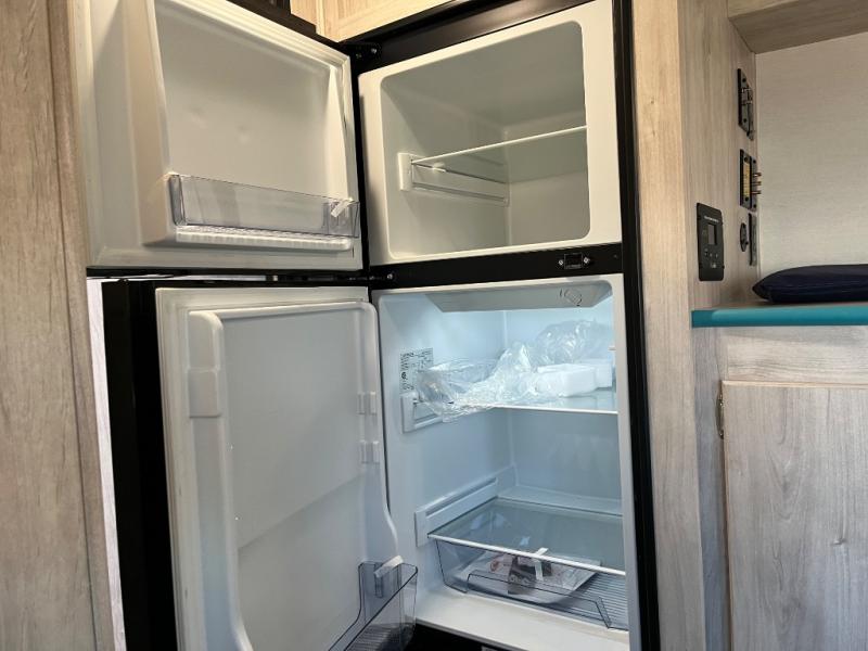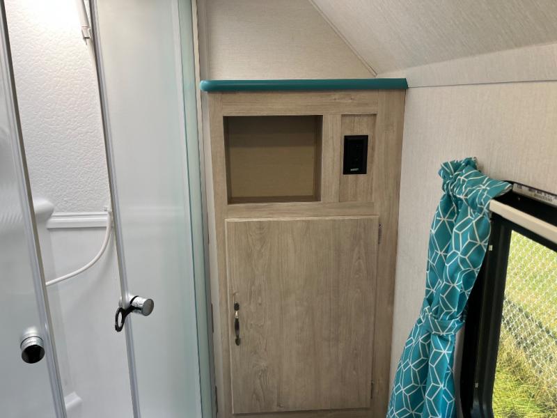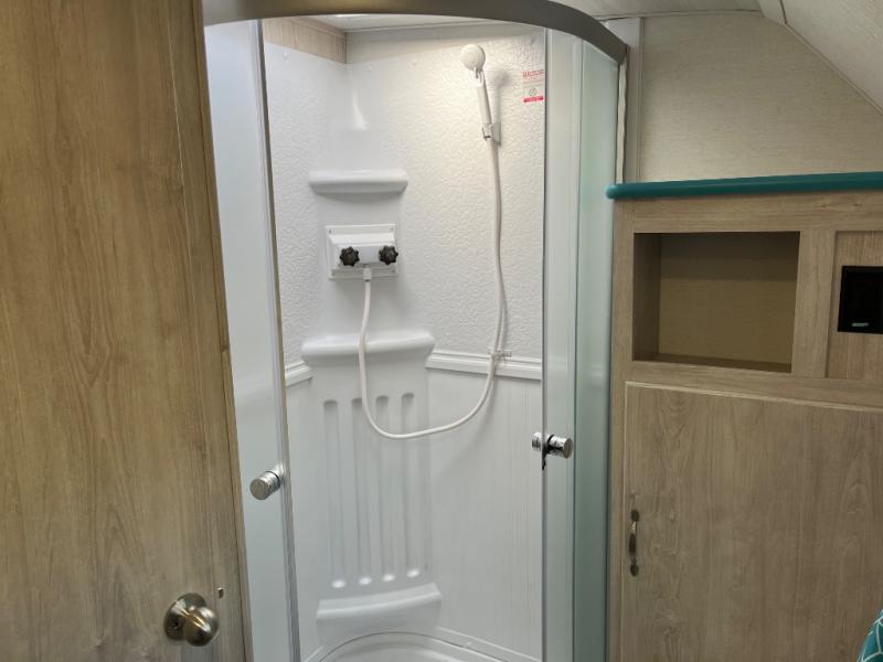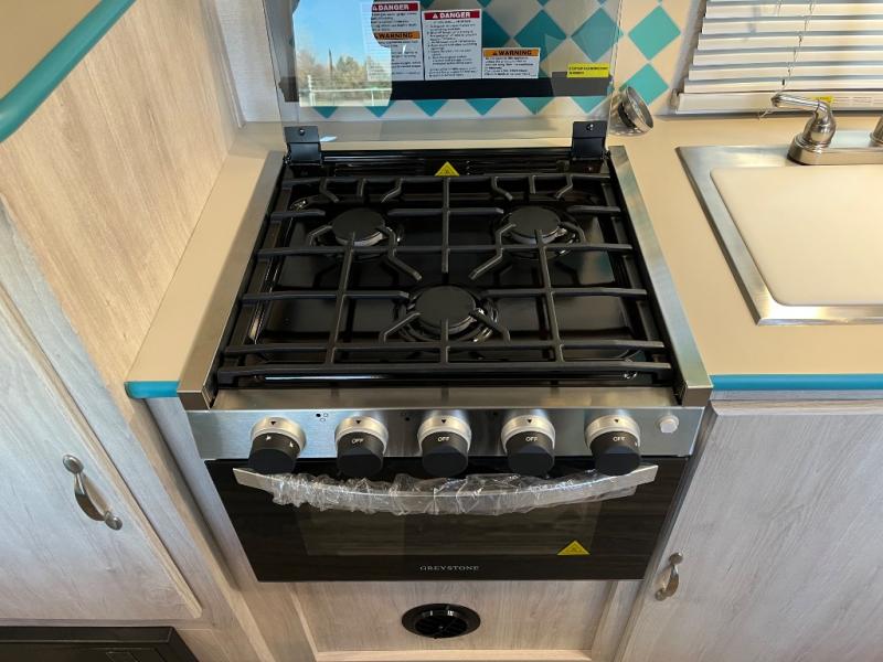 This travel trailer has the same layout as model 18MBS, but you'll enjoy a fixed RV queen bed up front instead of the Murphy bed. The full rear bath includes a linen closet and a wardrobe to keep your necessities organized, and you'll find additional storage throughout this model for your belongings. The vintage booth dinette will be the perfect place to dine at after dinner is made on the cooktop. There is also a microwave oven for quick meals and an 8 cu. ft. 12V refrigerator for cold drinks and perishables. And don't forget about the exterior pass-through storage for your larger camp gear!