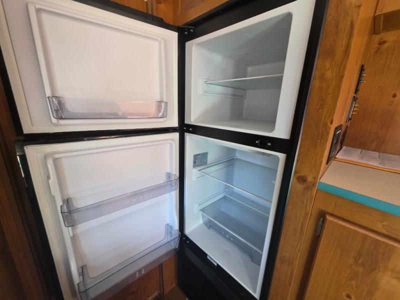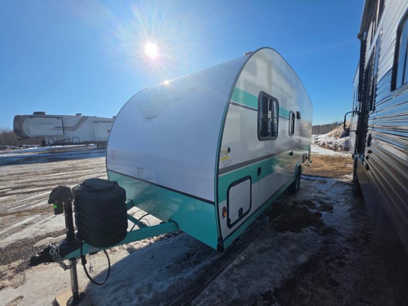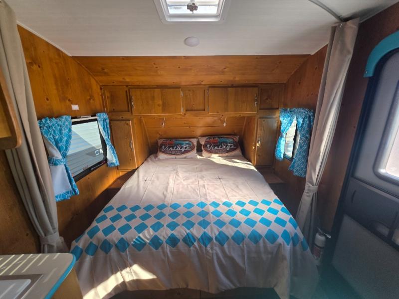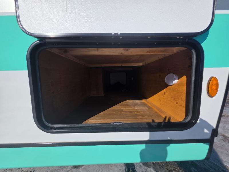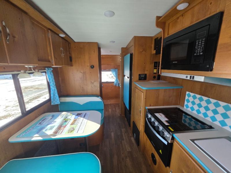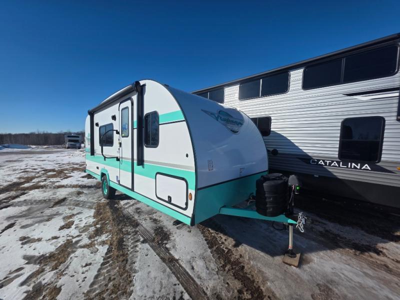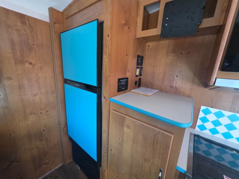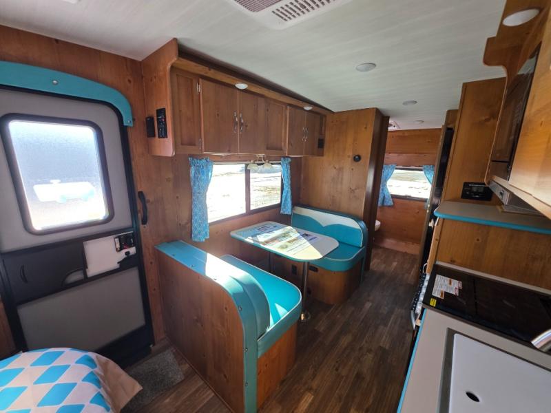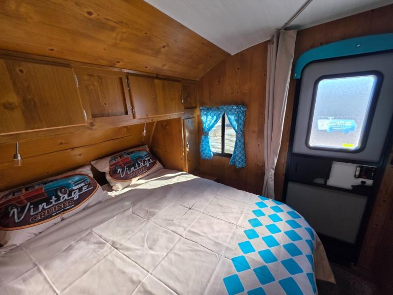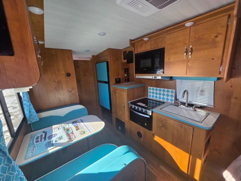 This travel trailer has the same layout as model 18MBS, but you'll enjoy a fixed RV queen bed up front instead of the Murphy bed. The full rear bath includes a linen closet and a wardrobe to keep your necessities organized, and you'll find additional storage throughout this model for your belongings. The vintage booth dinette will be the perfect place to dine at after dinner is made on the cooktop. There is also a microwave oven for quick meals and an 8 cu. ft. 12V refrigerator for cold drinks and perishables. And don't forget about the exterior pass-through storage for your larger camp gear!