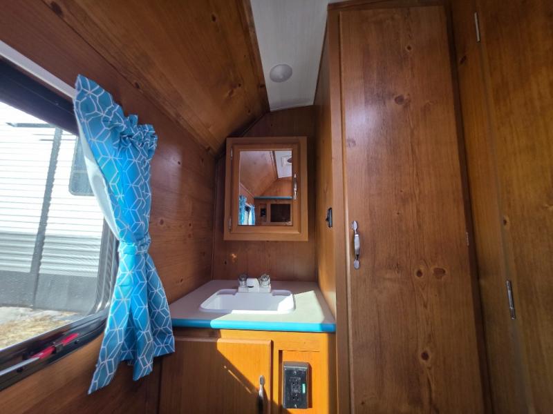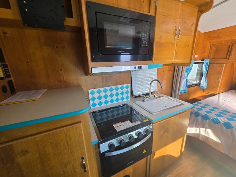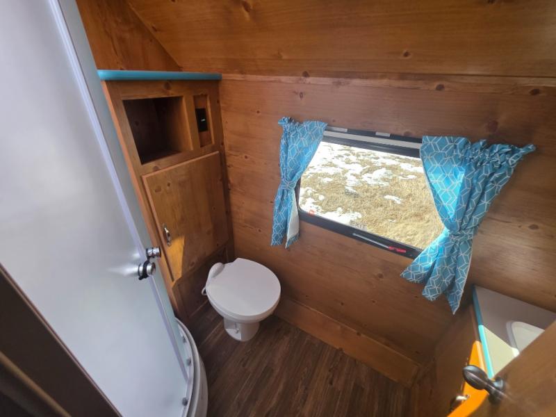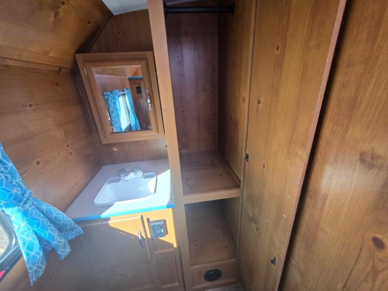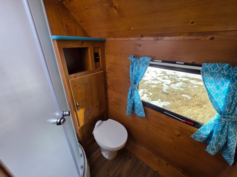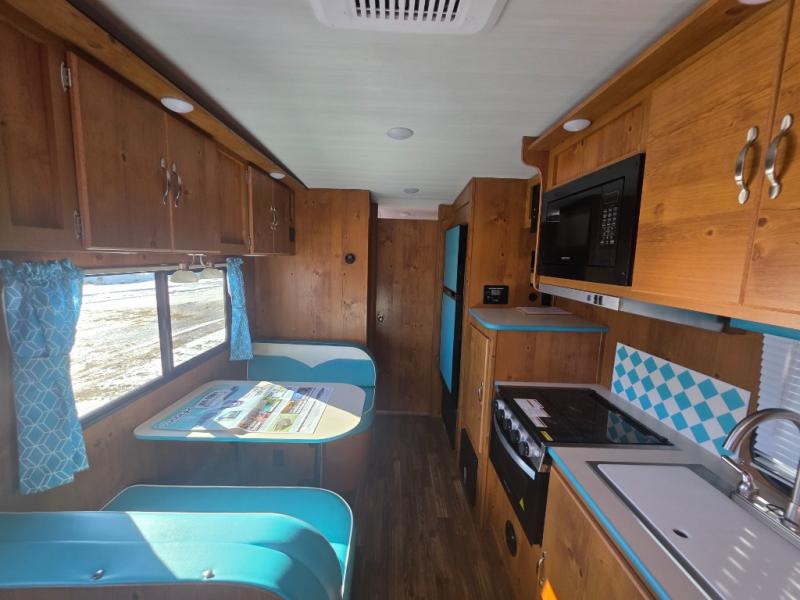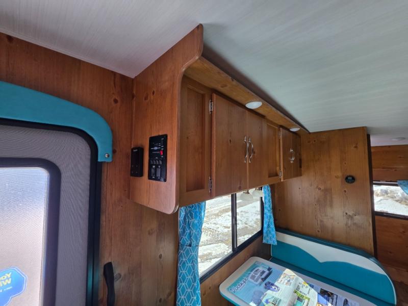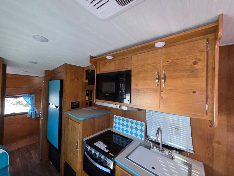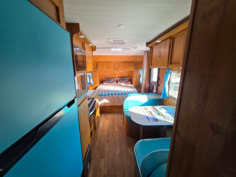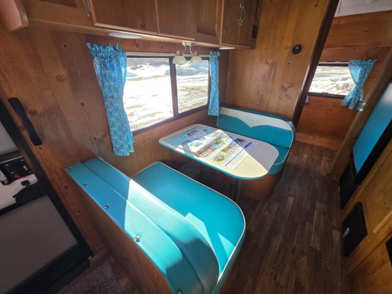 This travel trailer has the same layout as model 18MBS, but you'll enjoy a fixed RV queen bed up front instead of the Murphy bed. The full rear bath includes a linen closet and a wardrobe to keep your necessities organized, and you'll find additional storage throughout this model for your belongings. The vintage booth dinette will be the perfect place to dine at after dinner is made on the cooktop. There is also a microwave oven for quick meals and an 8 cu. ft. 12V refrigerator for cold drinks and perishables. And don't forget about the exterior pass-through storage for your larger camp gear!