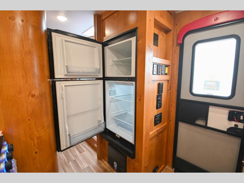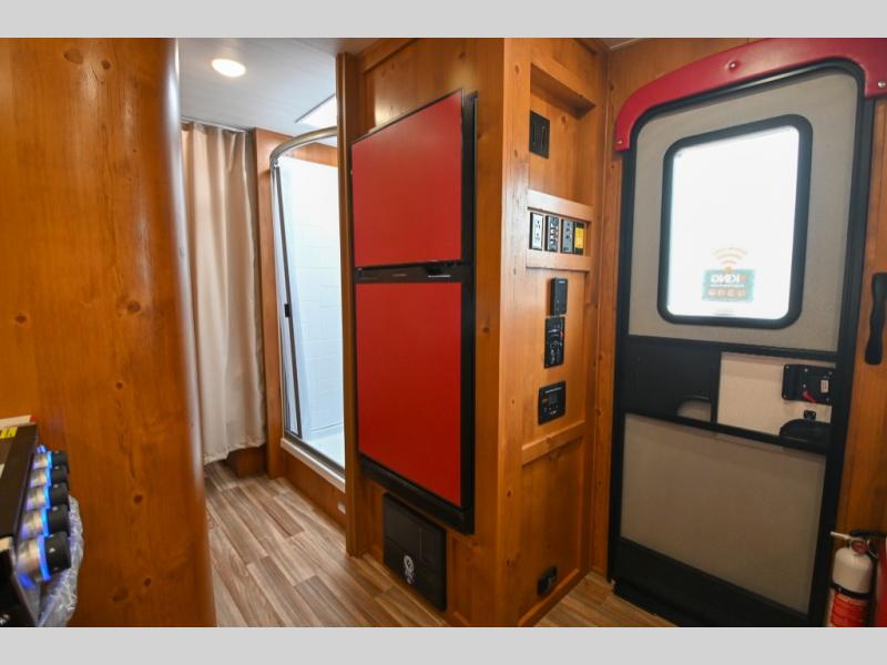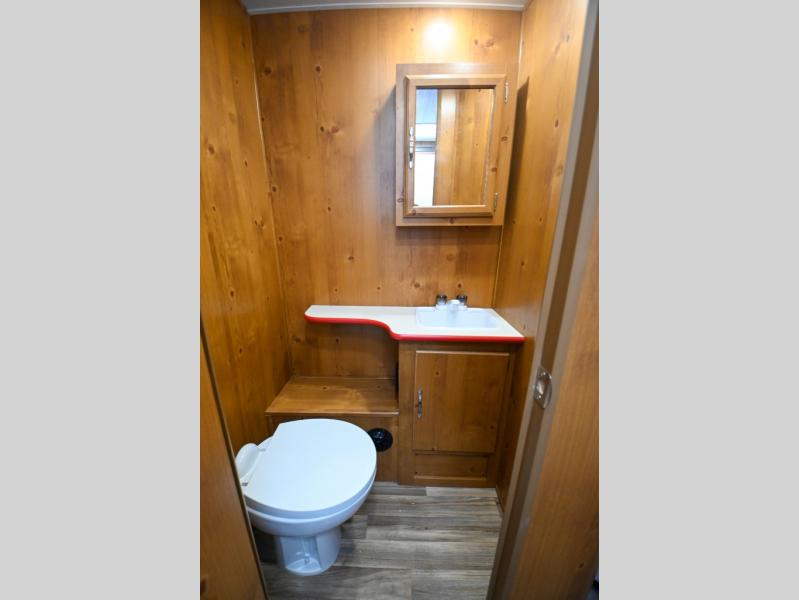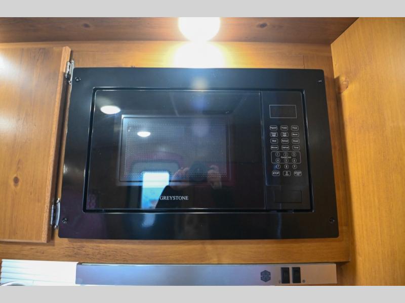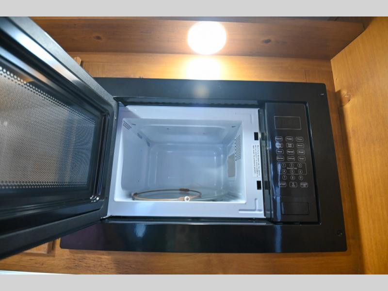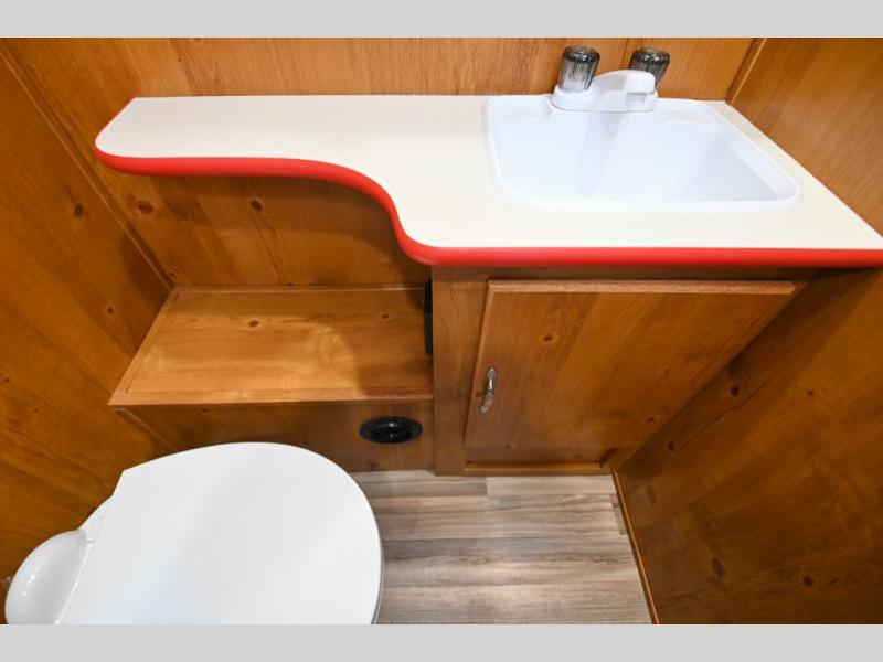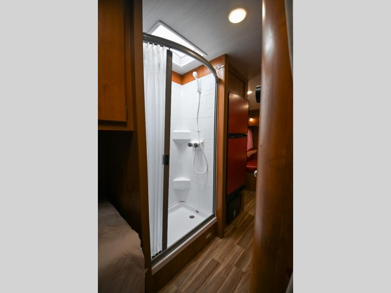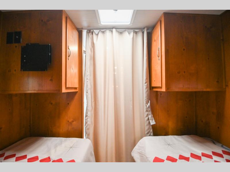 Whether you're camping with a friend or significant other, you'll find this model to be accommodating. There are front twin beds with an insert to make them one king-size bed, plus there are dual shirt closets to keep your clothes off of the floor. The 24" x 36" shower is across from the private toilet and sink so one person can be taking a shower, while the other is brushing their teeth to start the day. Head to the kitchen to prepare breakfast on the cooktop, or use the convenient microwave oven. You will love the rear vintage booth dinette with an extra counter behind one of the seats to set fresh flowers in the window.