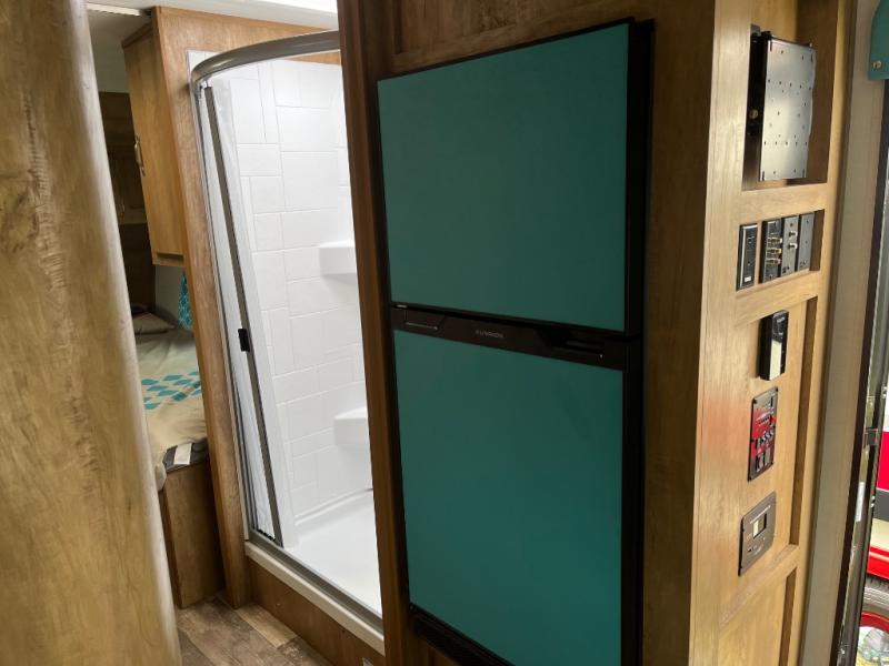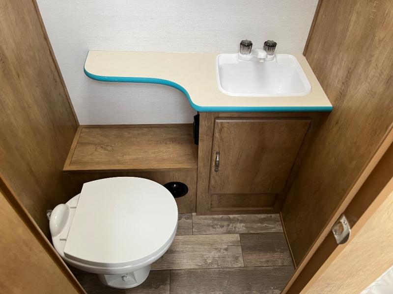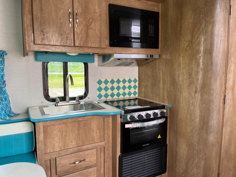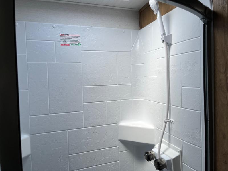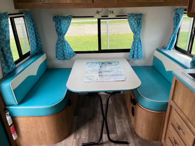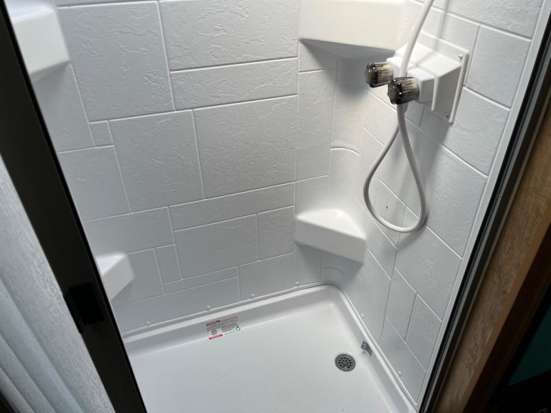 Whether you're camping with a friend or significant other, you'll find this model to be accommodating. There are front twin beds with an insert to make them one king-size bed, plus there are dual shirt closets to keep your clothes off of the floor. The 24" x 36" shower is across from the private toilet and sink so one person can be taking a shower, while the other is brushing their teeth to start the day. Head to the kitchen to prepare breakfast on the cooktop, or use the convenient microwave oven. You will love the rear vintage booth dinette with an extra counter behind one of the seats to set fresh flowers in the window.