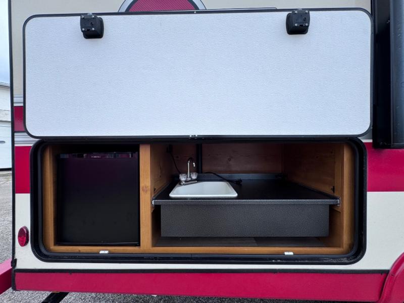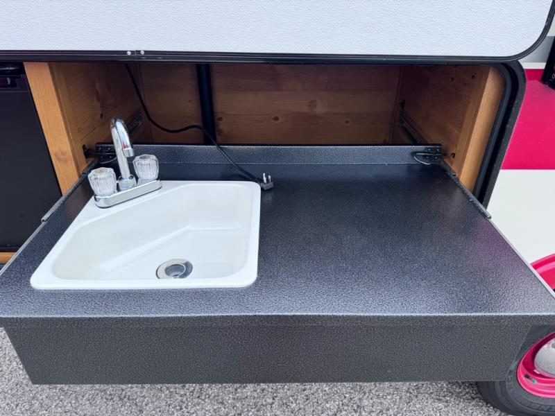 Camping trips to the lake are made complete in this roomy travel trailer for four. The U-shaped dinette slide out will provide the chef more space to cook on the cooktop. You will appreciate having your own RV queen bed up front, plus dual shirt closets and a curtain for privacy. This model also includes an exterior pass-through storage, an electric awning with LED lights, plus an outdoor snack kitchen with a sink and a refrigerator to entertain guests!