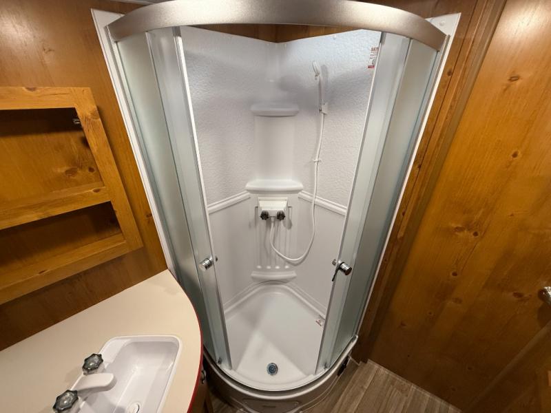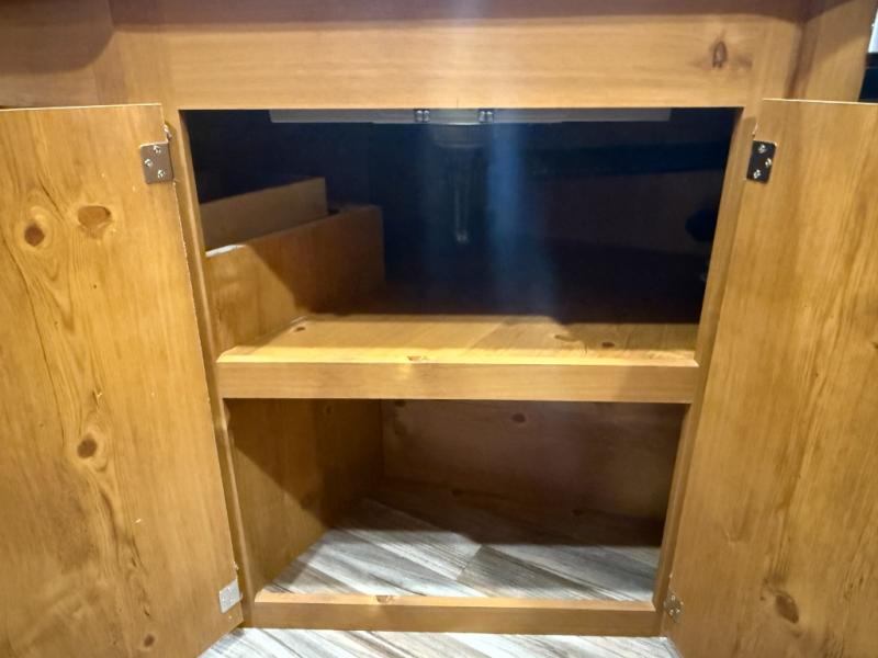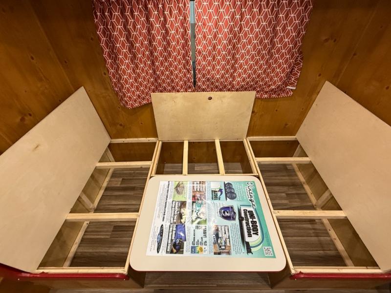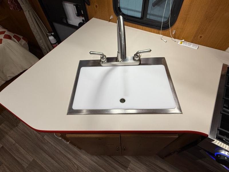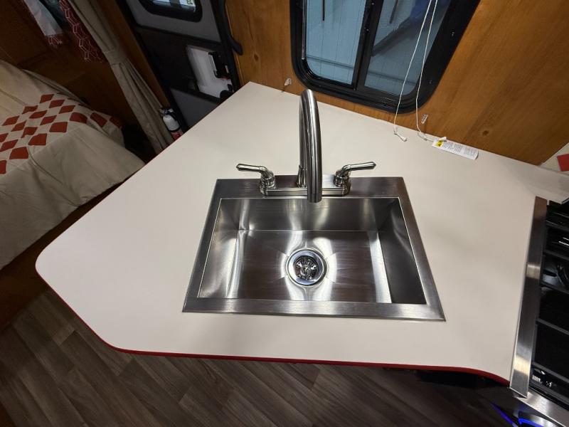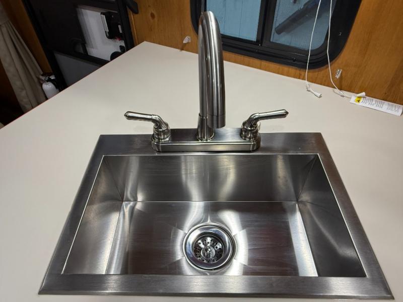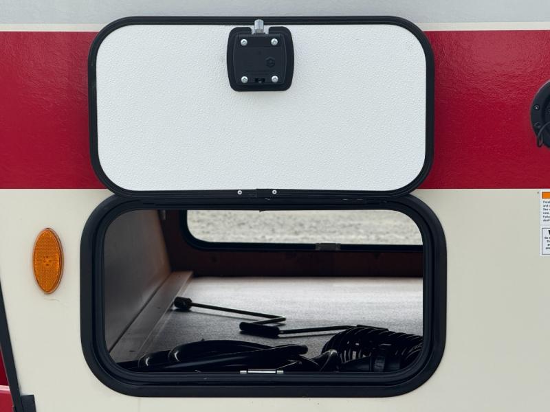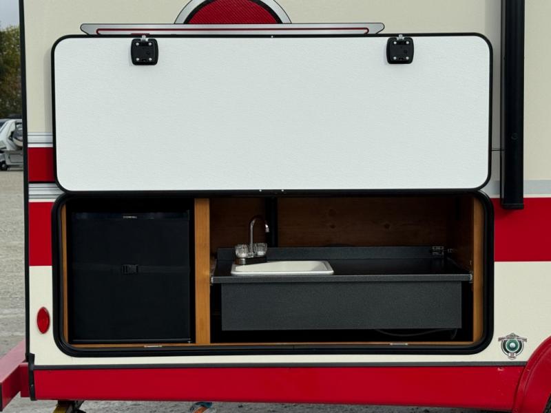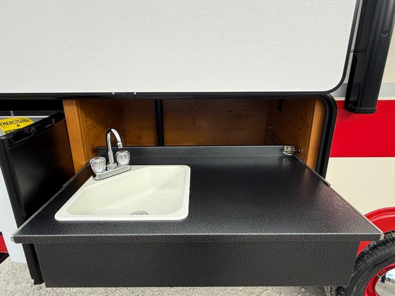Camping trips to the lake are made complete in this roomy travel trailer for four. The U-shaped dinette slide out will provide the chef more space to cook on the cooktop. You will appreciate having your own RV queen bed up front, plus dual shirt closets and a curtain for privacy. This model also includes an exterior pass-through storage, an electric awning with LED lights, plus an outdoor snack kitchen with a sink and a refrigerator to entertain guests!