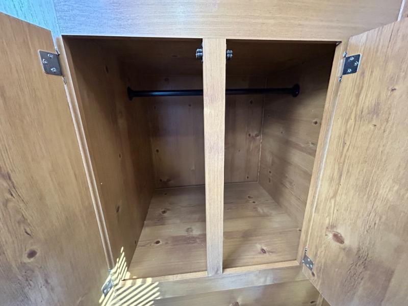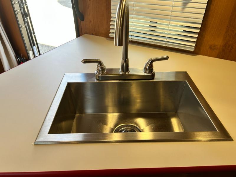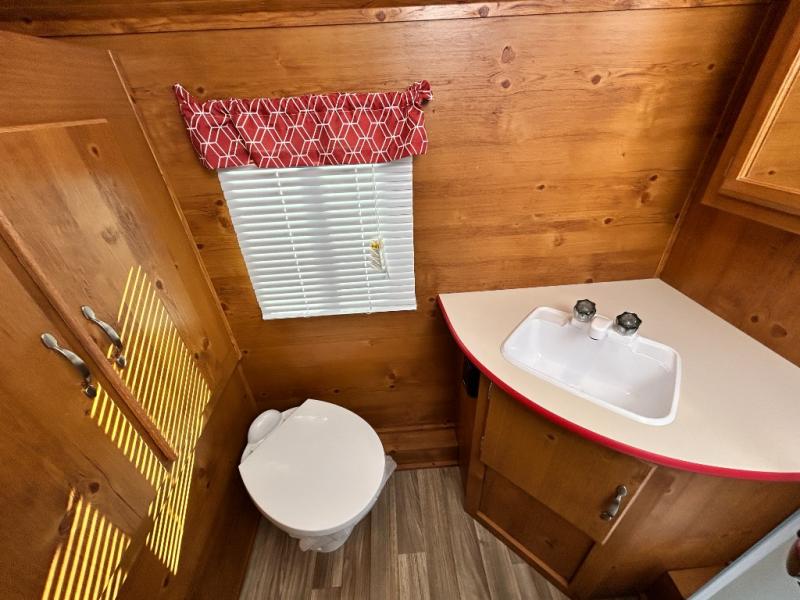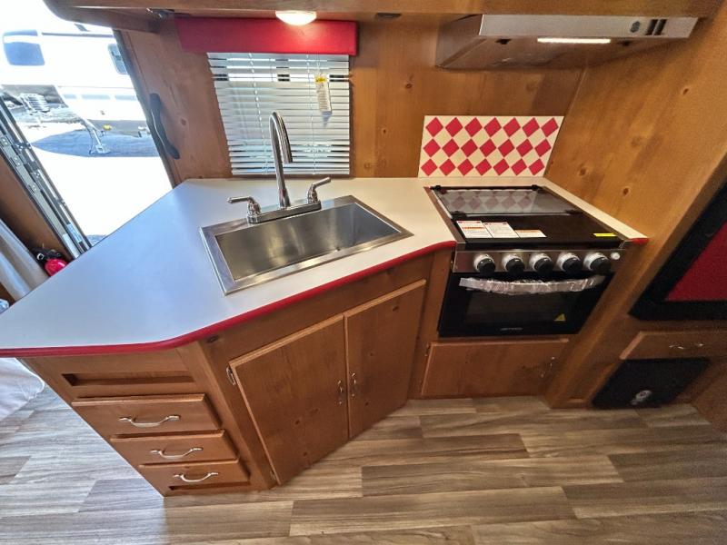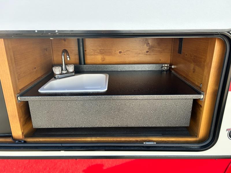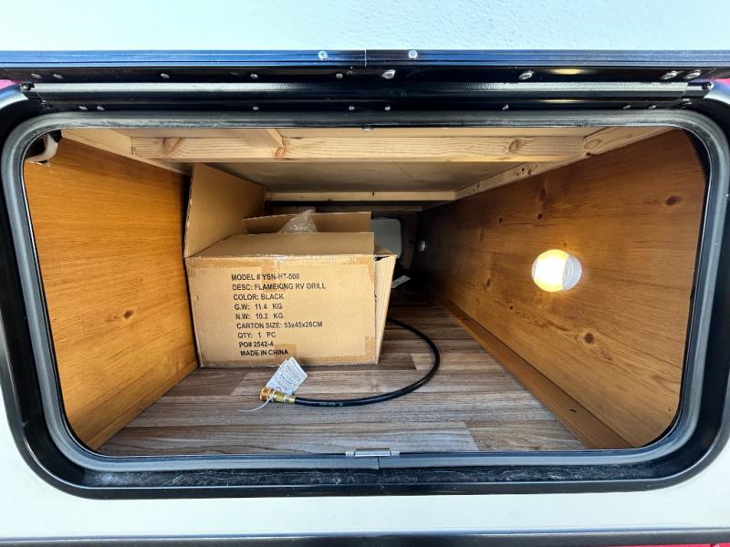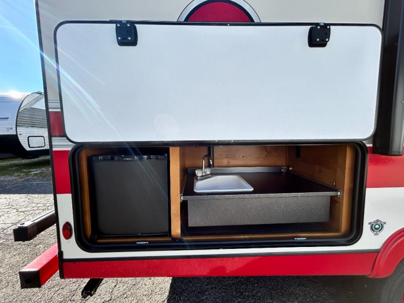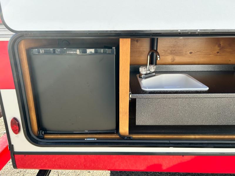 Camping trips to the lake are made complete in this roomy travel trailer for four. The U-shaped dinette slide out will provide the chef more space to cook on the cooktop. You will appreciate having your own RV queen bed up front, plus dual shirt closets and a curtain for privacy. This model also includes an exterior pass-through storage, an electric awning with LED lights, plus an outdoor snack kitchen with a sink and a refrigerator to entertain guests!