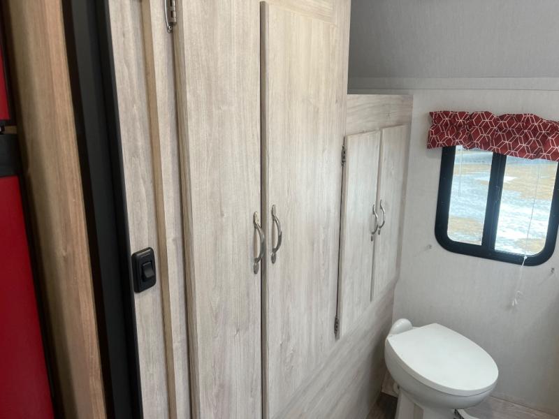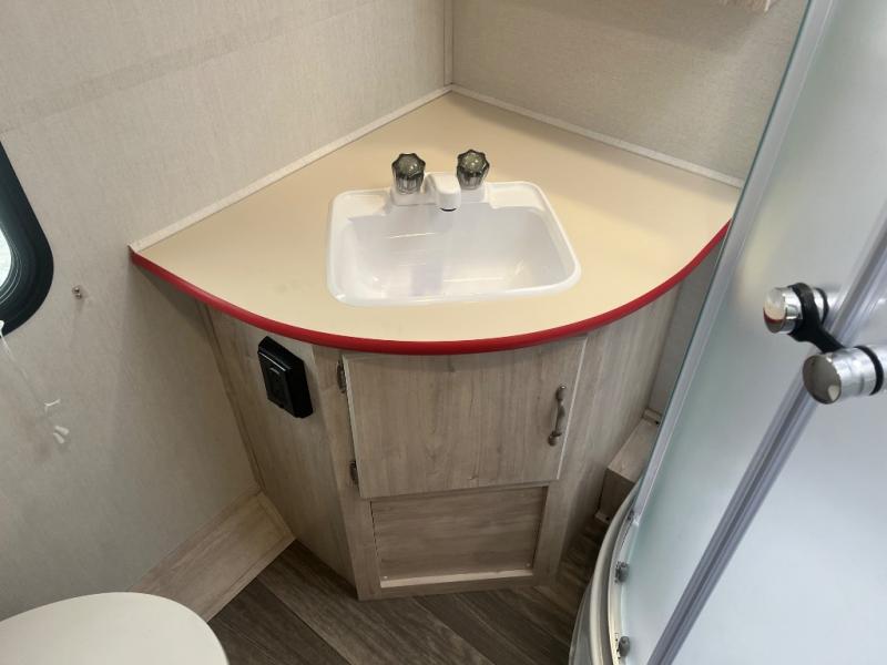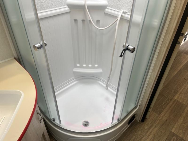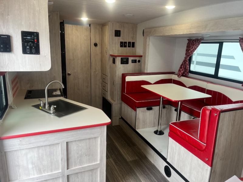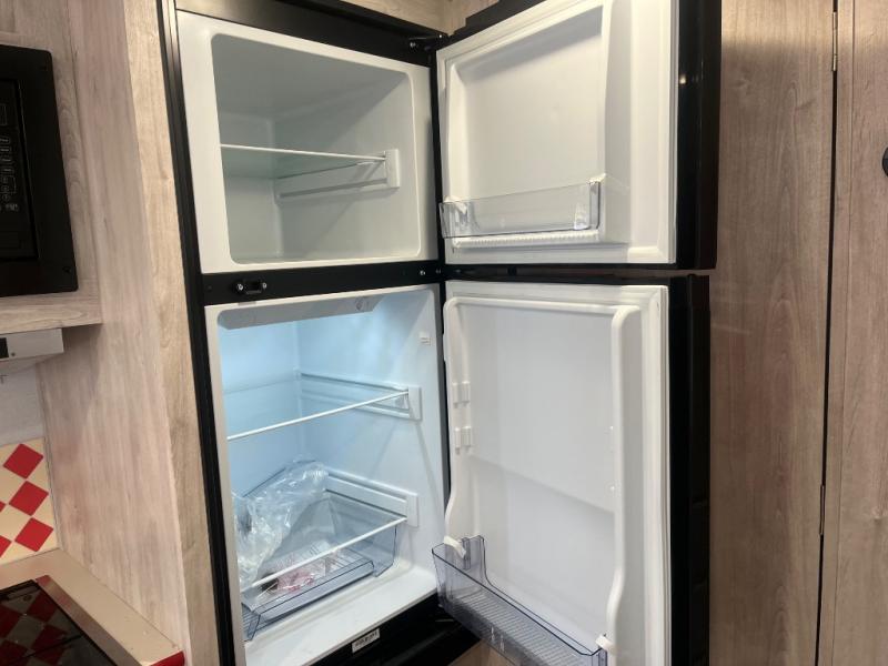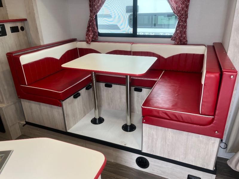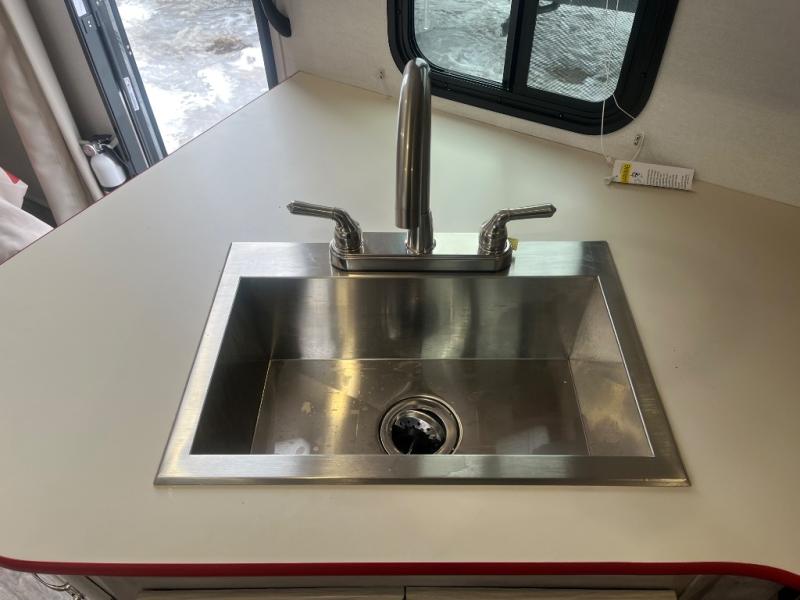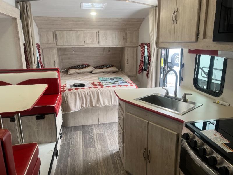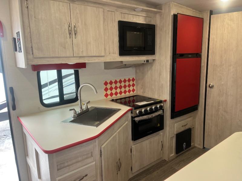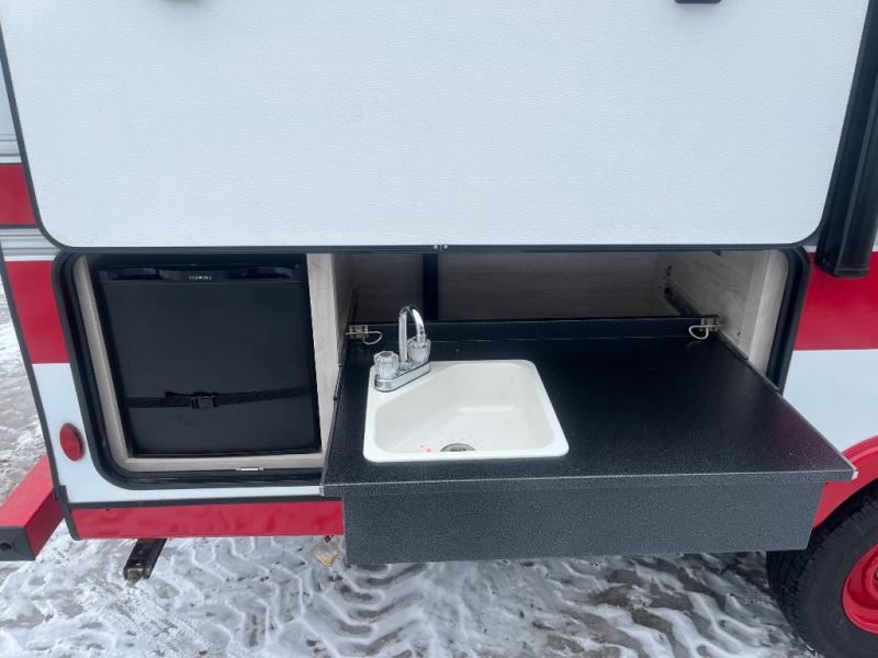 Camping trips to the lake are made complete in this roomy travel trailer for four. The U-shaped dinette slide out will provide the chef more space to cook on the cooktop. You will appreciate having your own RV queen bed up front, plus dual shirt closets and a curtain for privacy. This model also includes an exterior pass-through storage, an electric awning with LED lights, plus an outdoor snack kitchen with a sink and a refrigerator to entertain guests!