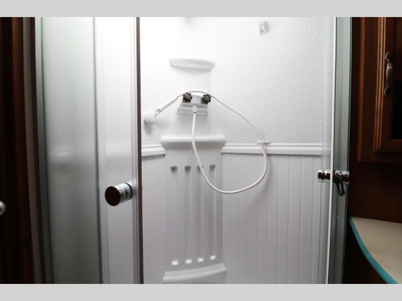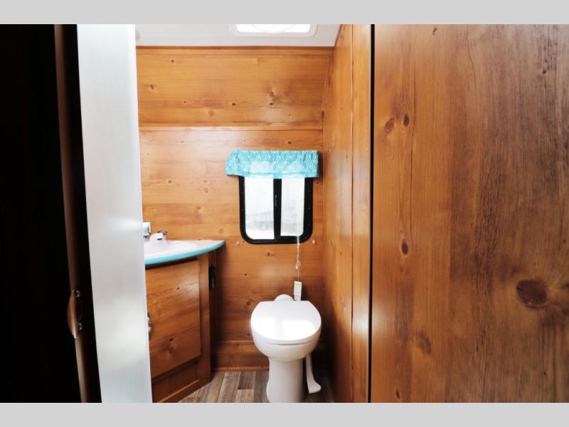 The spacious rear bath layout provides residential comfort with a large shower, vanity, linen storage, and full privacy—perfect for families and extended trips. Up front, enjoy a comfortable walk-around queen bed with overhead storage and dual wardrobes, giving couples the relaxation and organization they want on the road. The open living and kitchen area features a roomy dinette for meals, work, or additional sleeping space, plus panoramic windows that bring in natural light and scenic campground views.
