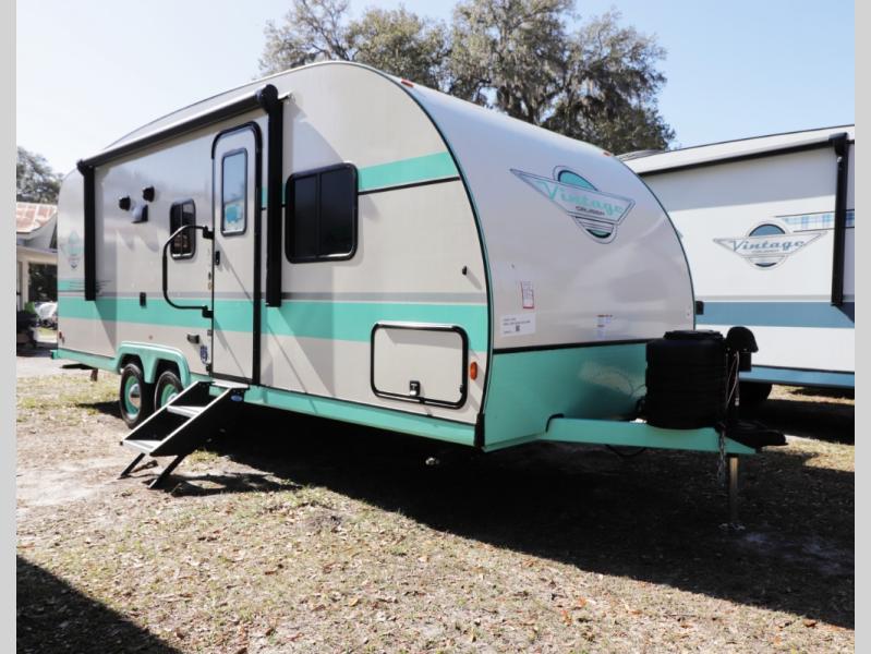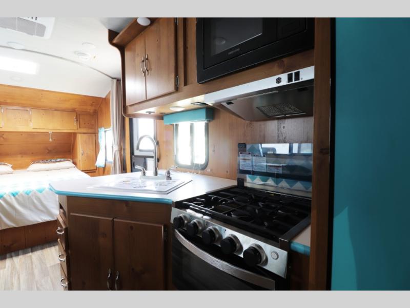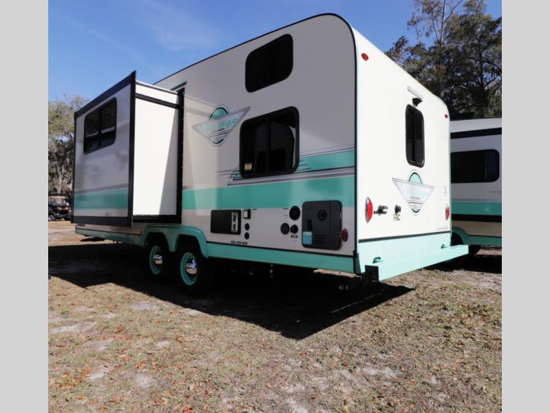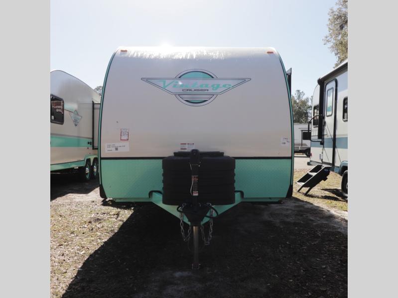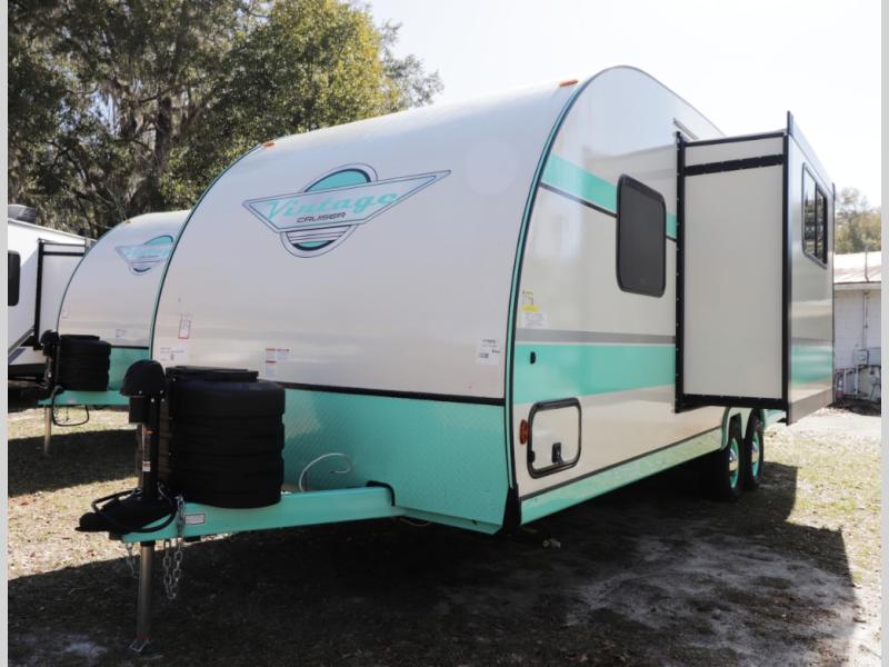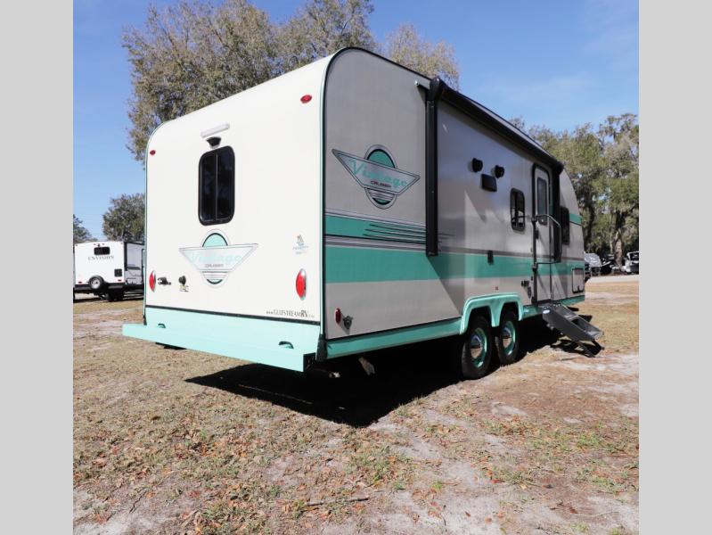 Highlights and popular manufacturer features buyers love include lightweight, easy-tow design for SUVs and half-ton trucks, durable laminated construction with aluminum framing, classic smooth fiberglass exterior with signature Vintage Cruiser retro styling, spacious rear bathroom with large shower and storage, comfortable front queen bed with dual wardrobes, convertible dinette for extra sleeping space, fully equipped kitchen with microwave, cooktop, oven, refrigerator, and stainless sink, high-efficiency roof A/C and furnace for all-season comfort, power awning with LED lighting for outdoor living, exterior pass-through storage, radial tires, and stabilizer jacks for smooth setup at any campsite.