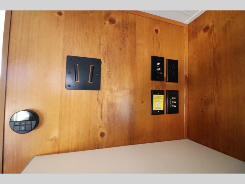 Technology and convenience features RV shoppers look for include modern electrical system with converter and battery charging, solar prep for off-grid capability, backup camera prep for safer towing, USB charging ports, Bluetooth-capable stereo system with interior and exterior speakers, cable/satellite prep, and Wi-Fi readiness (via campground or aftermarket router options), giving travelers the connectivity and entertainment they want on the road.