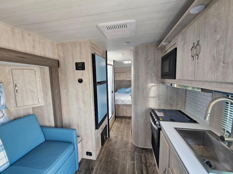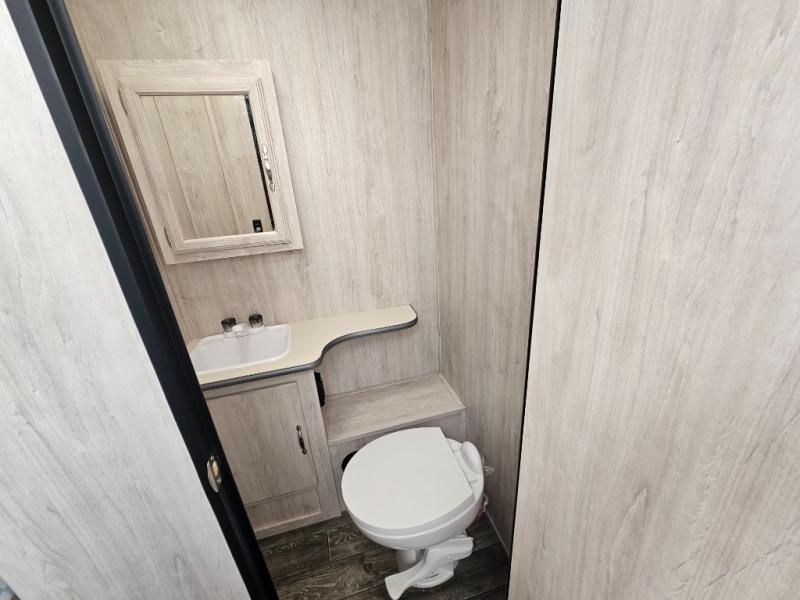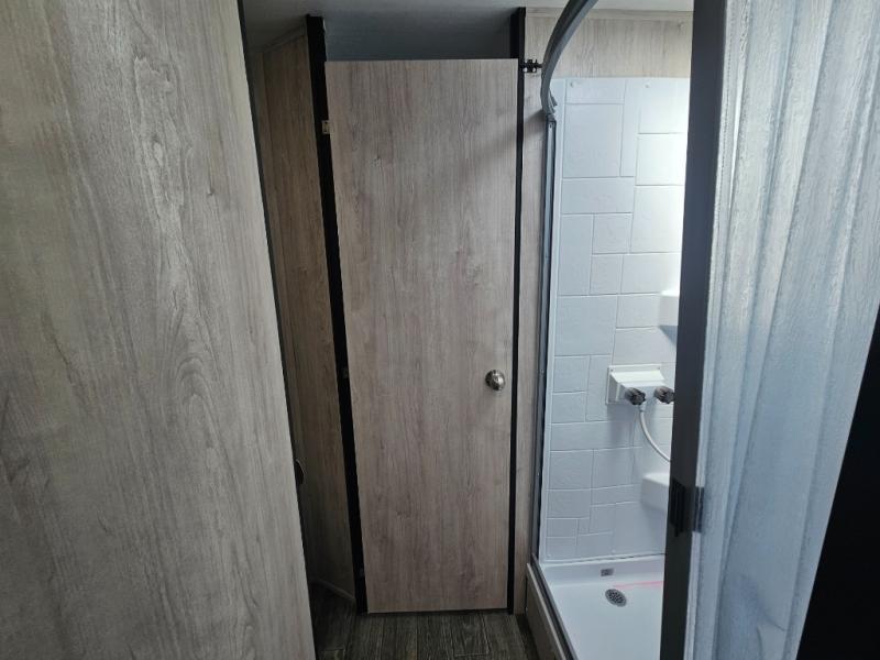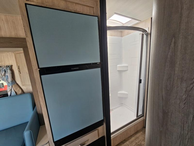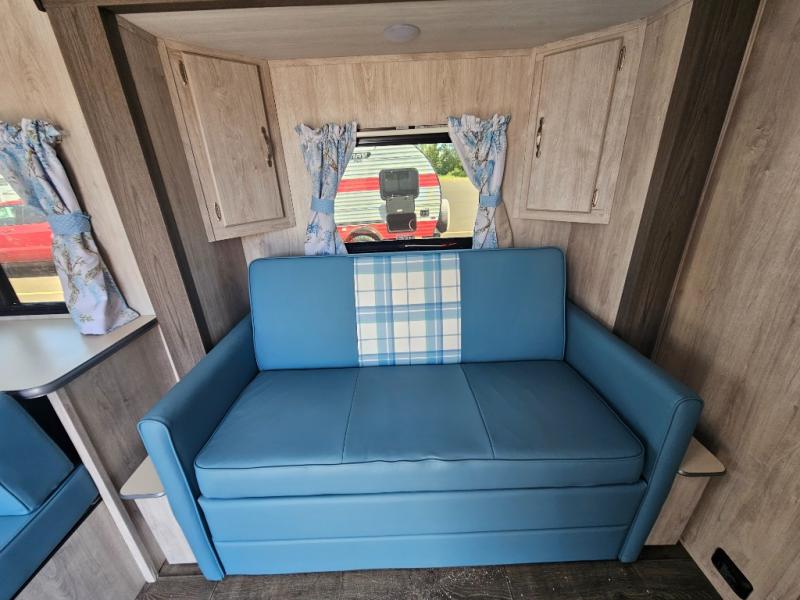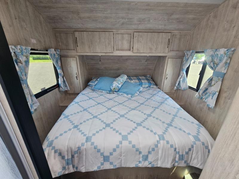 Step into comfort with this classic travel trailer in tow. You will find a rear vintage booth dinette and a sofa slide out with end tables to set your drinks on. The kitchen is complete with a microwave oven, cooktop, plus overhead cabinets for your belongings. After a day outdoors, you can clean up in the 24" x 36" shower, and there is a private toilet and sink across the hall if someone needs to use it while you're cleaning up. This model will feel just like home with its RV queen bed and dual shirt closets for your clothes.