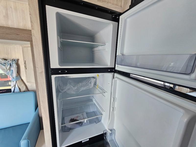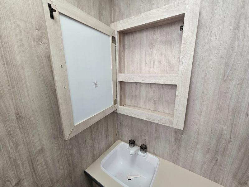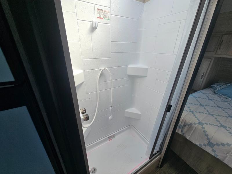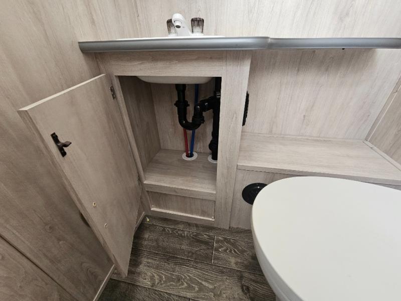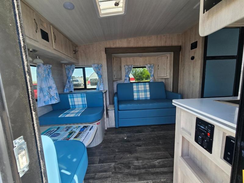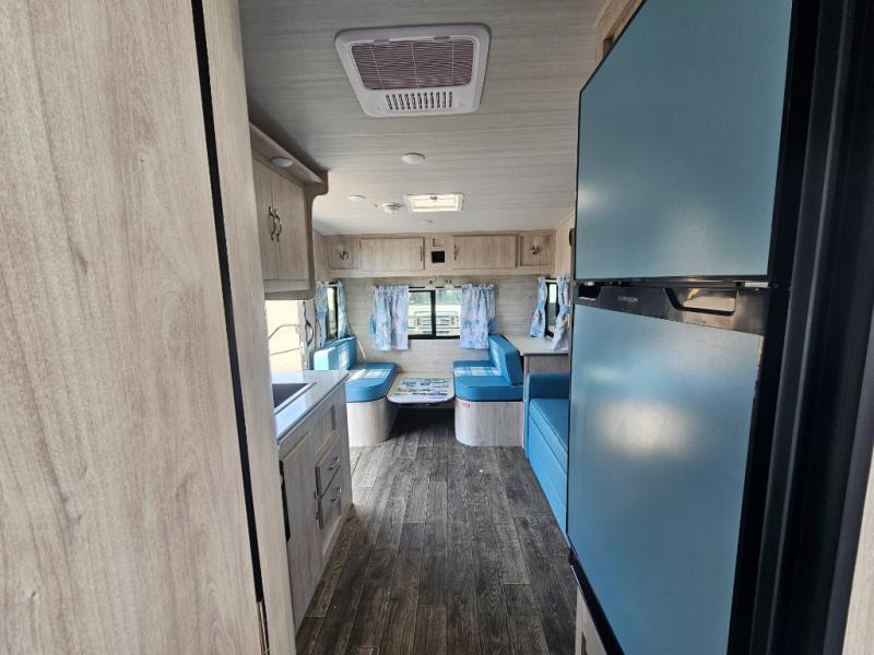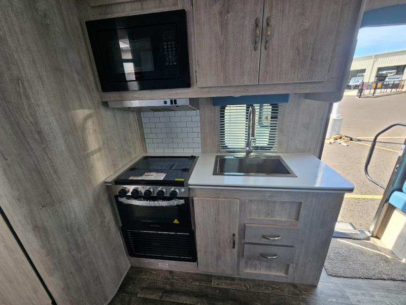 Step into comfort with this classic travel trailer in tow. You will find a rear vintage booth dinette and a sofa slide out with end tables to set your drinks on. The kitchen is complete with a microwave oven, cooktop, plus overhead cabinets for your belongings. After a day outdoors, you can clean up in the 24" x 36" shower, and there is a private toilet and sink across the hall if someone needs to use it while you're cleaning up. This model will feel just like home with its RV queen bed and dual shirt closets for your clothes.