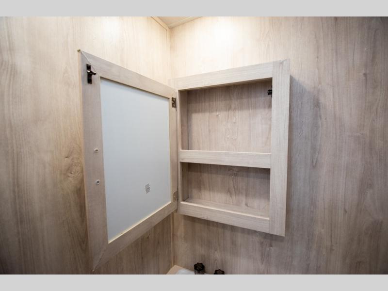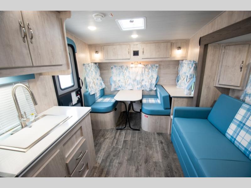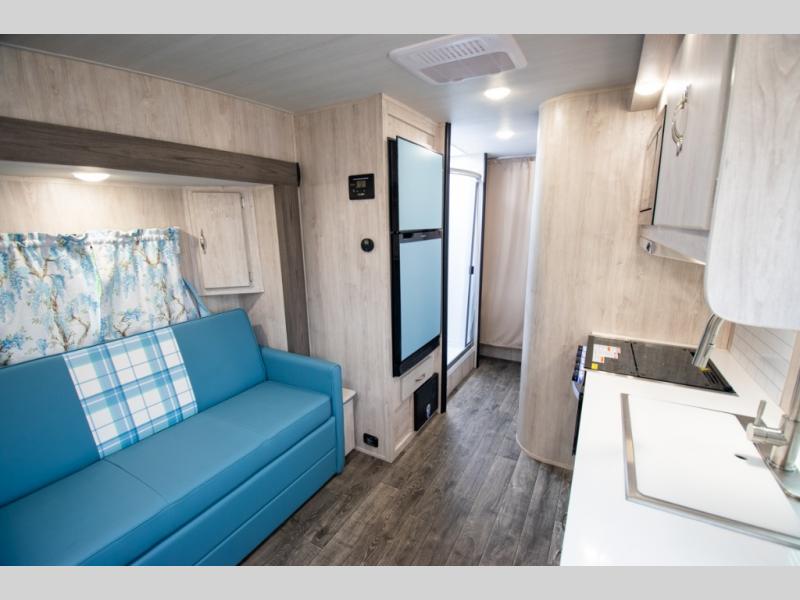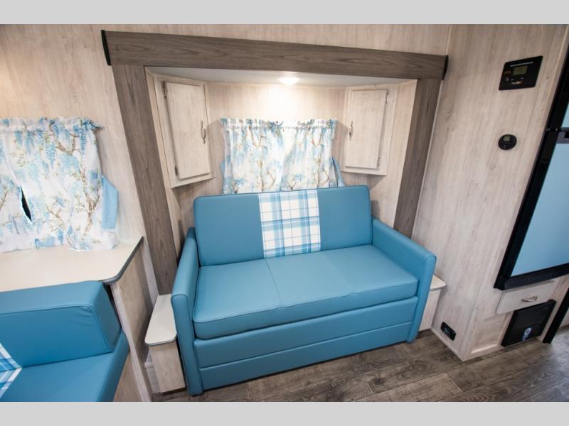 Step into comfort with this classic travel trailer in tow. You will find a rear vintage booth dinette and a sofa slide out with end tables to set your drinks on. The kitchen is complete with a microwave oven, cooktop, plus overhead cabinets for your belongings. After a day outdoors, you can clean up in the 24" x 36" shower, and there is a private toilet and sink across the hall if someone needs to use it while you're cleaning up. This model will feel just like home with its RV queen bed and dual shirt closets for your clothes.