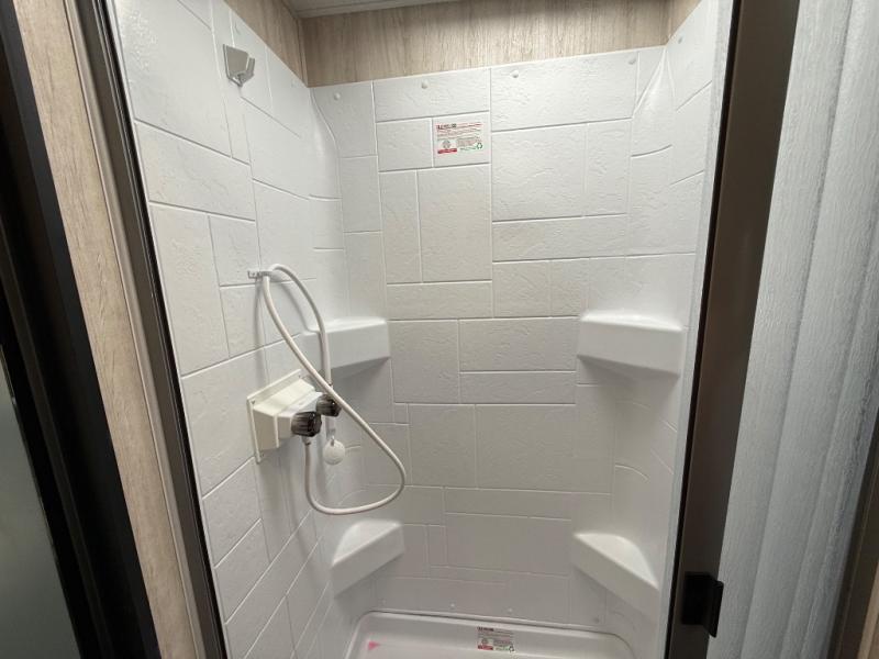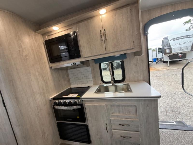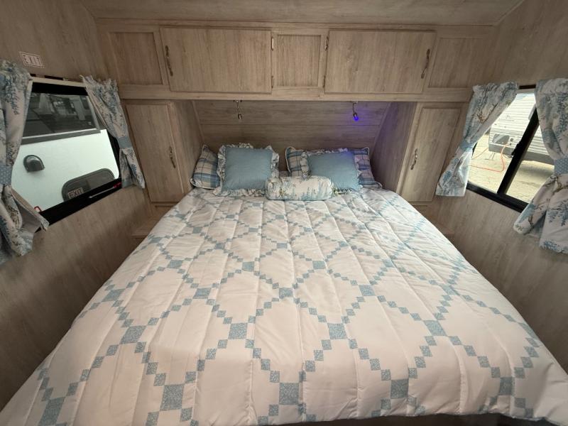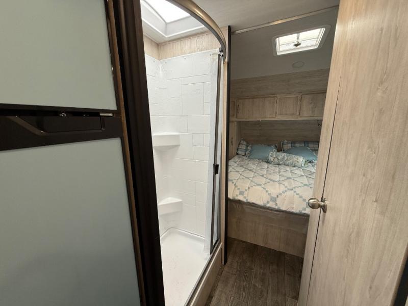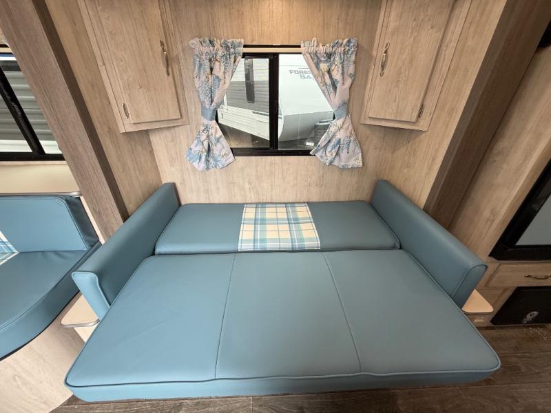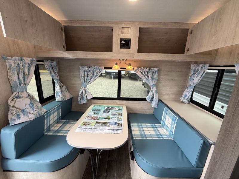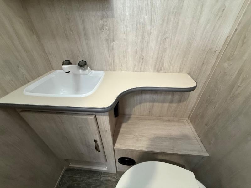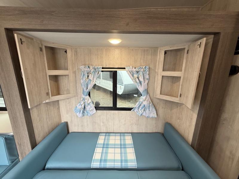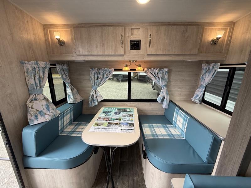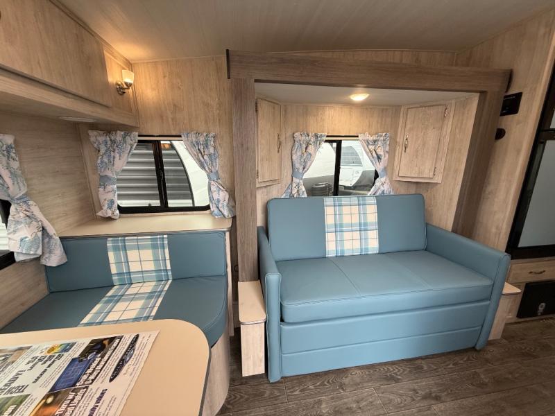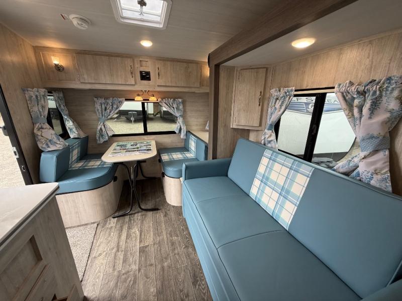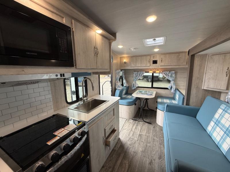Step into comfort with this classic travel trailer in tow. You will find a rear vintage booth dinette and a sofa slide out with end tables to set your drinks on. The kitchen is complete with a microwave oven, cooktop, plus overhead cabinets for your belongings. After a day outdoors, you can clean up in the 24" x 36" shower, and there is a private toilet and sink across the hall if someone needs to use it while you're cleaning up. This model will feel just like home with its RV queen bed and dual shirt closets for your clothes.