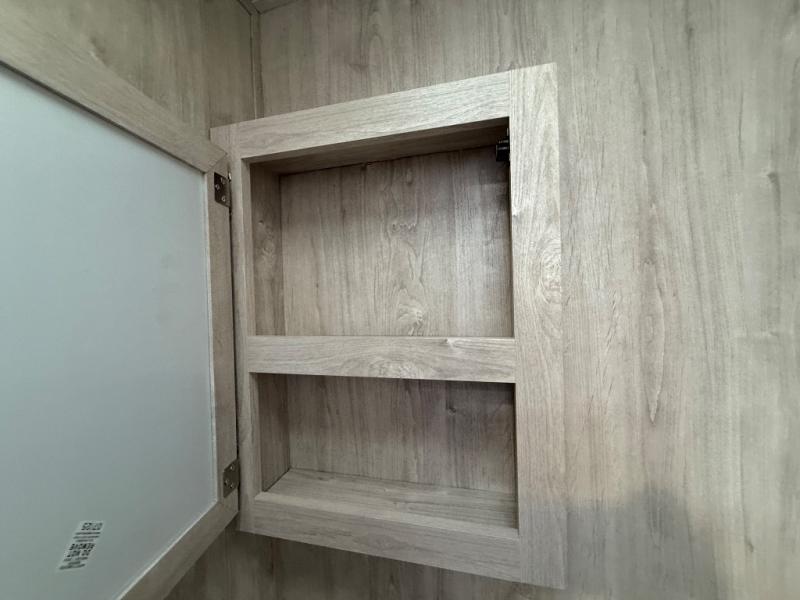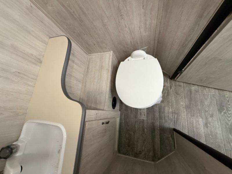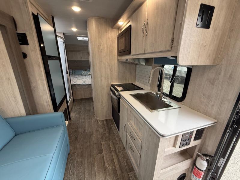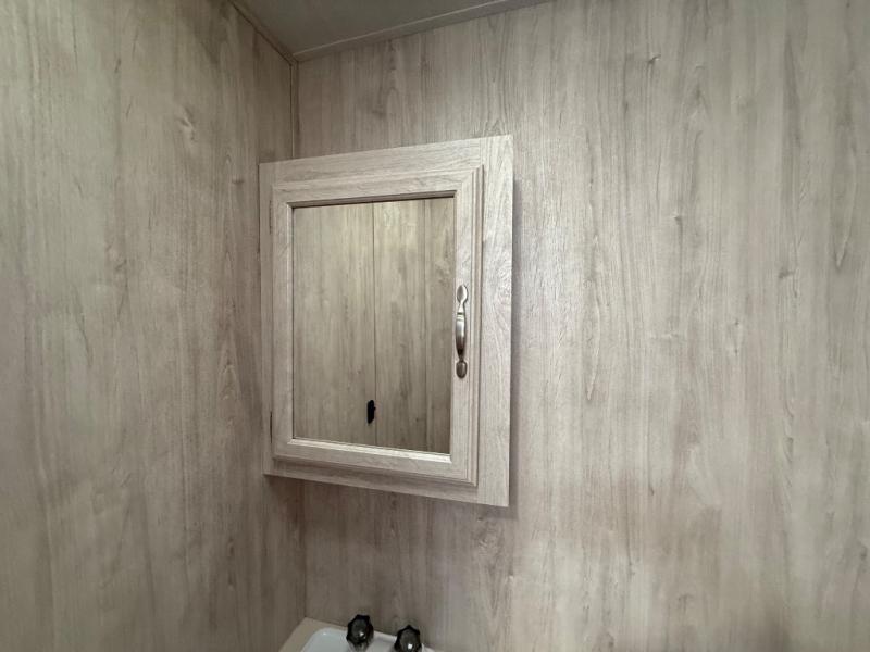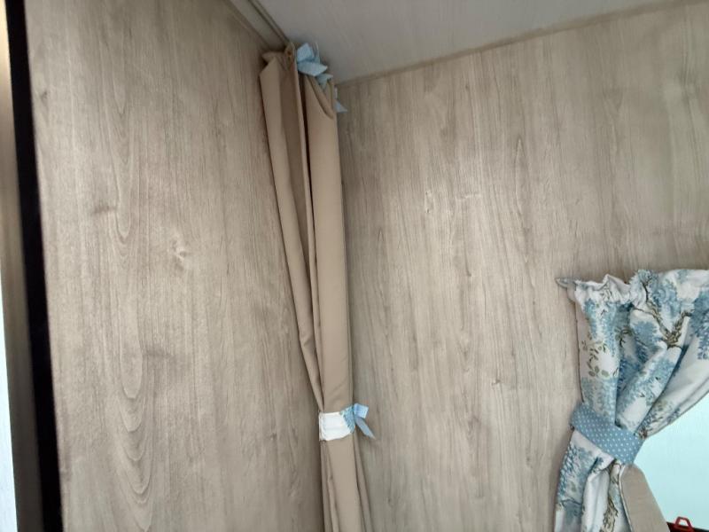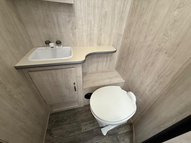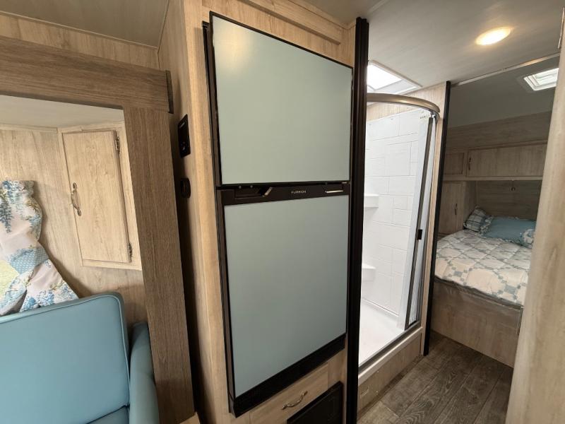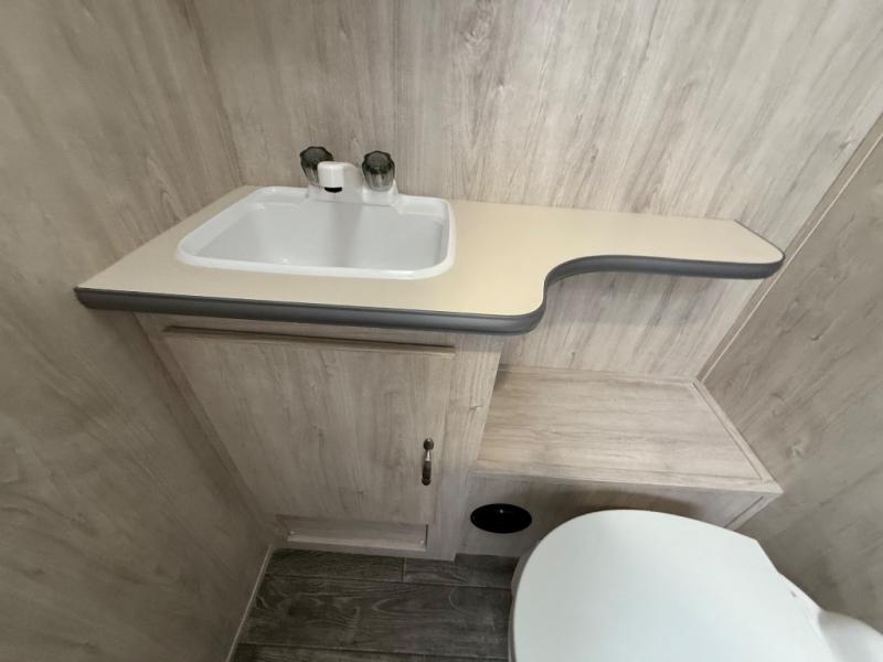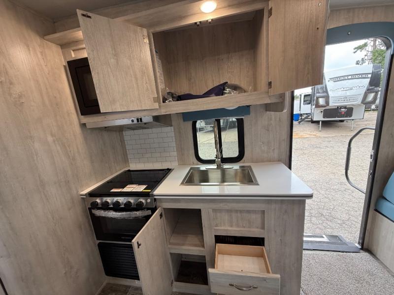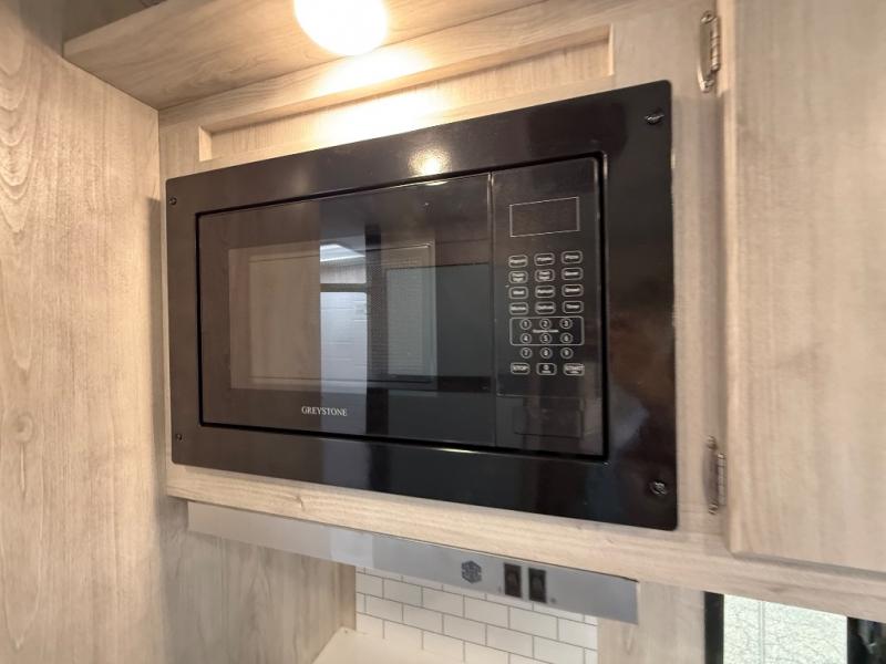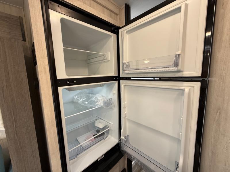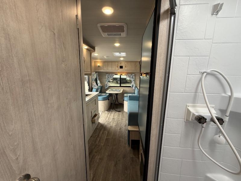 Step into comfort with this classic travel trailer in tow. You will find a rear vintage booth dinette and a sofa slide out with end tables to set your drinks on. The kitchen is complete with a microwave oven, cooktop, plus overhead cabinets for your belongings. After a day outdoors, you can clean up in the 24" x 36" shower, and there is a private toilet and sink across the hall if someone needs to use it while you're cleaning up. This model will feel just like home with its RV queen bed and dual shirt closets for your clothes.