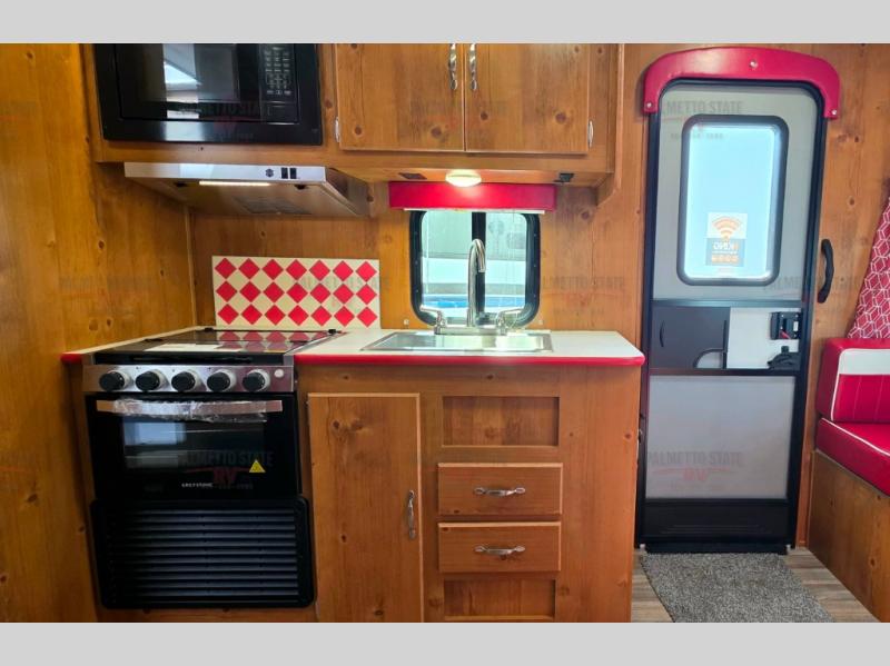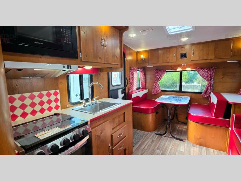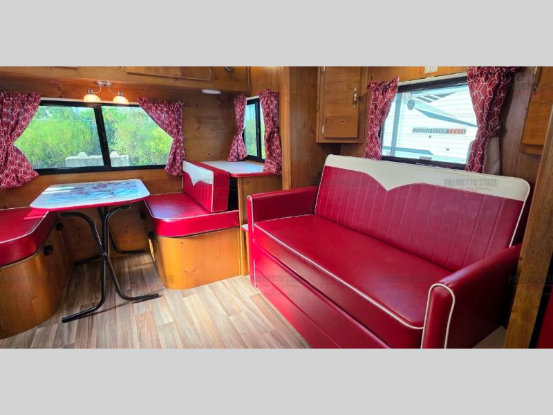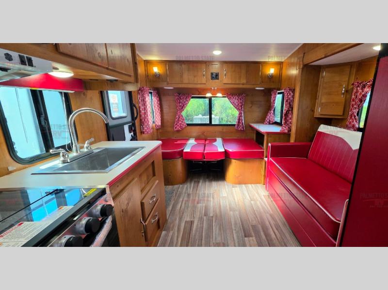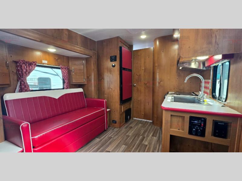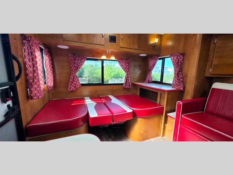 What I liked most: I like the vintage style, the red vinyl, and the knotty pine interior. I chose this model because of access to the bed on both sides, the dinette surrounded by windows, and a deep shower pan that won't leak on the floor when you bump the curtain. I also like that the toilet is not in the shower. My husband wanted 2 axels. We have the trailer 2 months and have camped 4 times. We're on a huge learning curve, but everything has worked perfectly. Our dealer, Big Country RV, Redmond, Oregon, checked everything out and gave us a walk through that was very helpful.