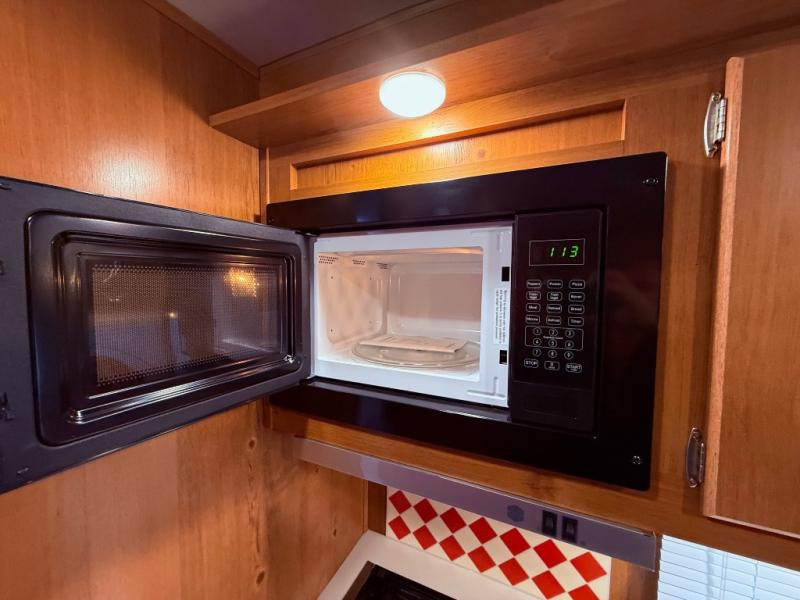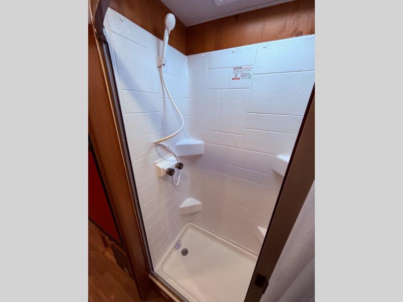 Step into comfort with this classic travel trailer in tow. You will find a rear vintage booth dinette and a sofa slide out with end tables to set your drinks on. The kitchen is complete with a microwave oven, cooktop, plus overhead cabinets for your belongings. After a day outdoors, you can clean up in the 24" x 36" shower, and there is a private toilet and sink across the hall if someone needs to use it while you're cleaning up. This model will feel just like home with its RV queen bed and dual shirt closets for your clothes.