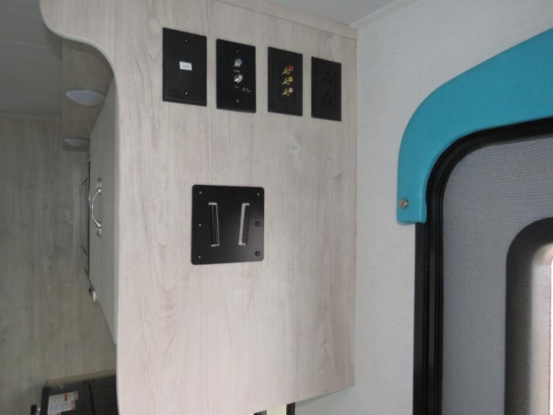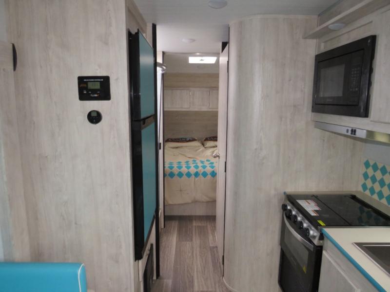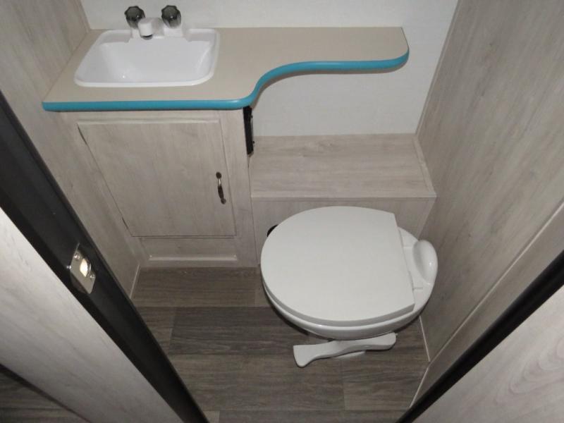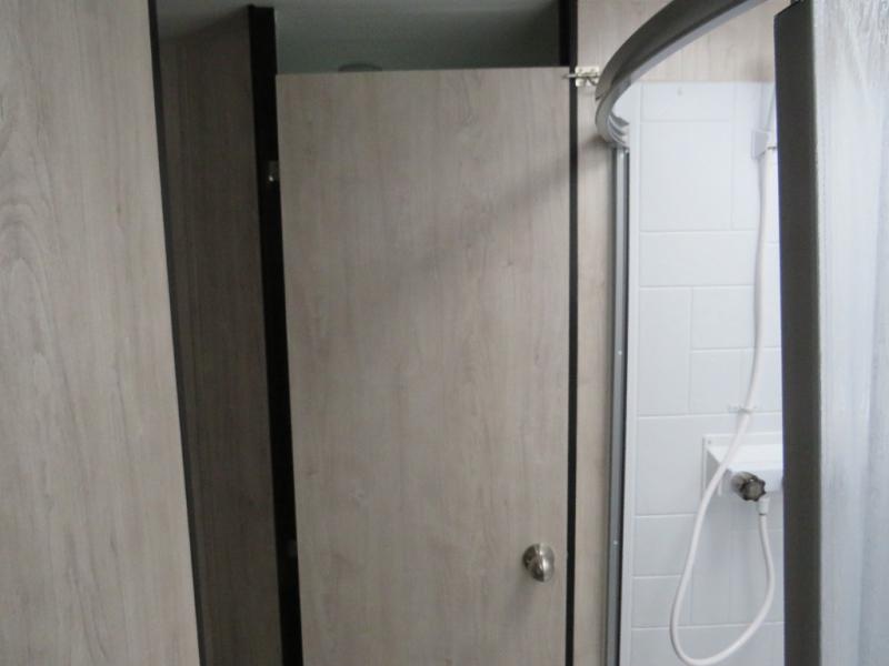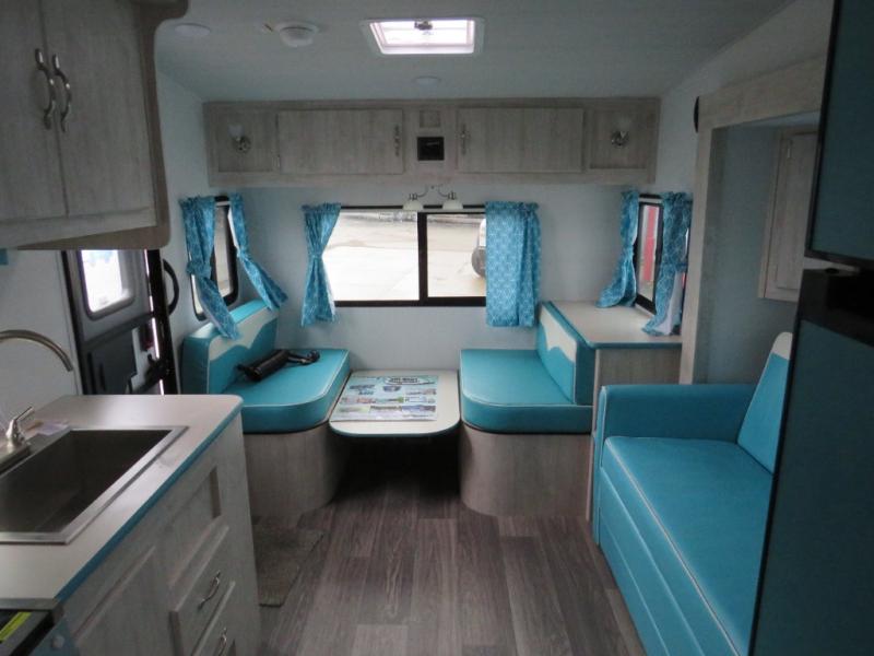 Step into comfort with this classic travel trailer in tow. You will find a rear vintage booth dinette and a sofa slide out with end tables to set your drinks on. The kitchen is complete with a microwave oven, cooktop, plus overhead cabinets for your belongings. After a day outdoors, you can clean up in the 24" x 36" shower, and there is a private toilet and sink across the hall if someone needs to use it while you're cleaning up. This model will feel just like home with its RV queen bed and dual shirt closets for your clothes.