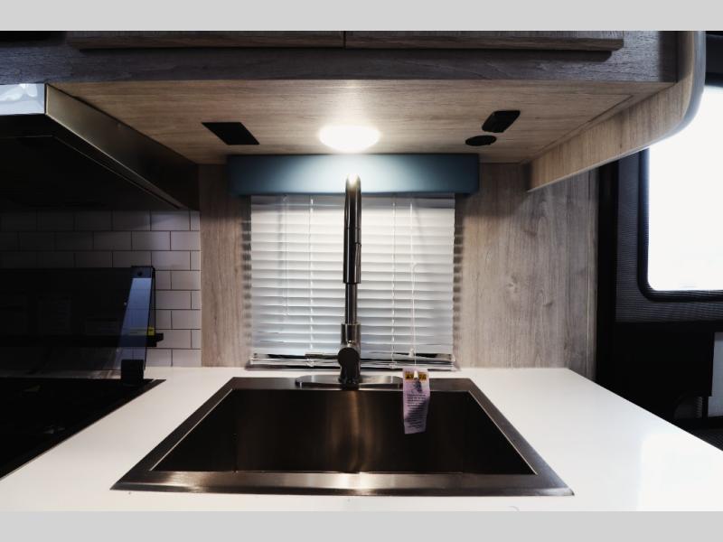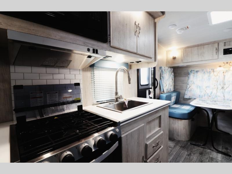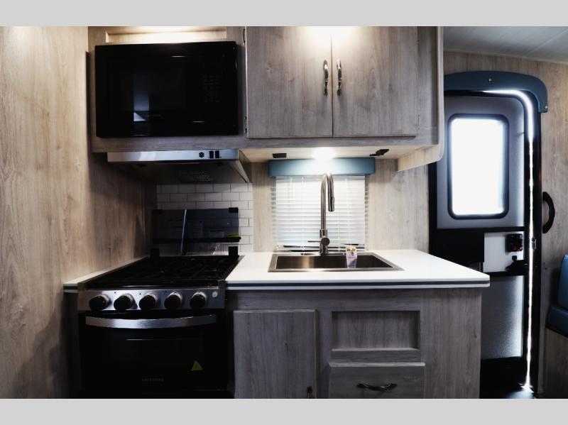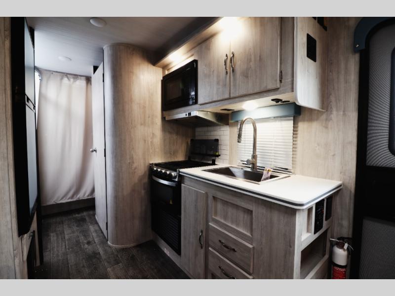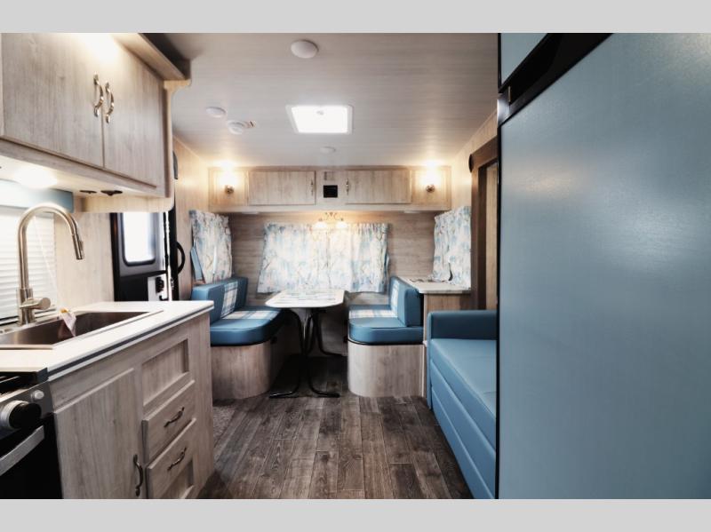 Step inside and experience a spacious rear sofa slide-out that expands your living space, creating a comfortable lounge for relaxing, entertaining, or sleeping guests. The open-concept interior features panoramic windows for natural light, durable easy-clean flooring, and stylish retro décor that gives this coach its signature charm. The fully equipped kitchen includes a large refrigerator, microwave, cooktop, oven, stainless sink, and generous counter space—perfect for families and couples who enjoy cooking on the road. A comfortable front queen bedroom offers privacy, overhead storage, and wardrobe space so you can travel longer without sacrificing comfort. The spacious bathroom features a full shower, vanity, and foot-flush toilet—everything you need for extended trips or campground living.