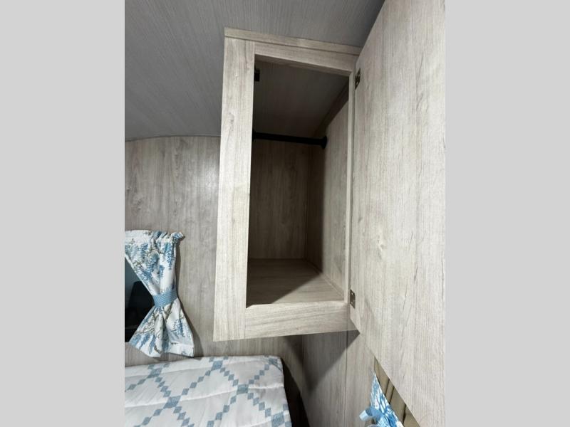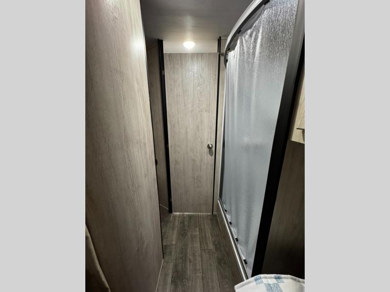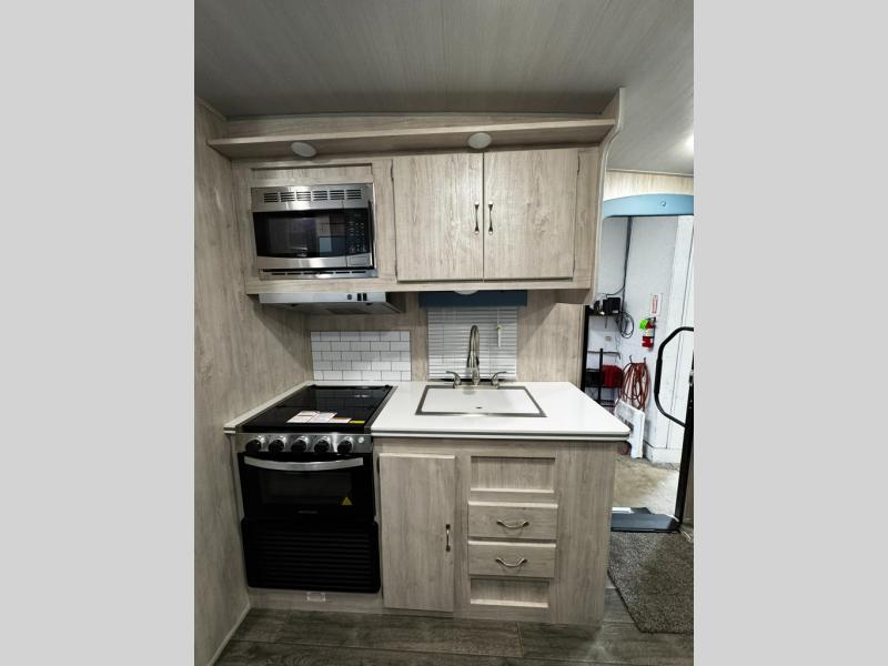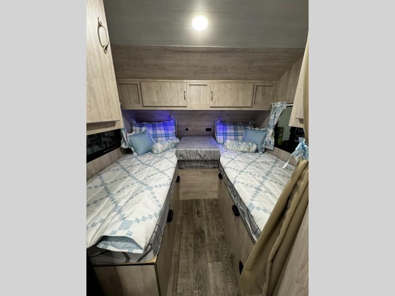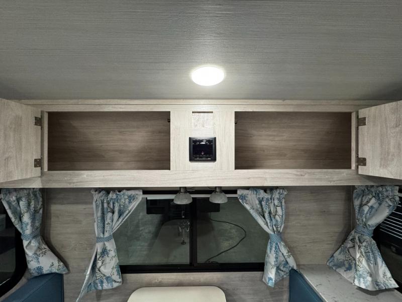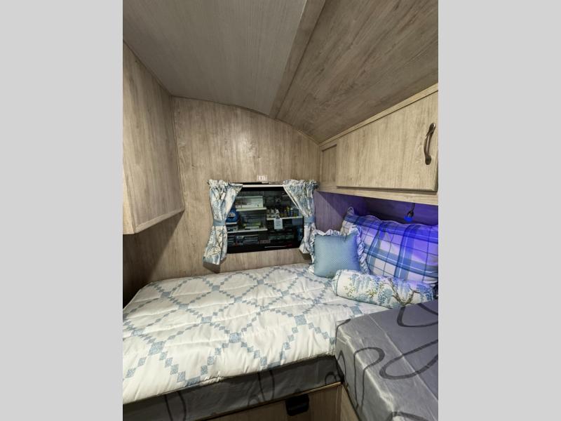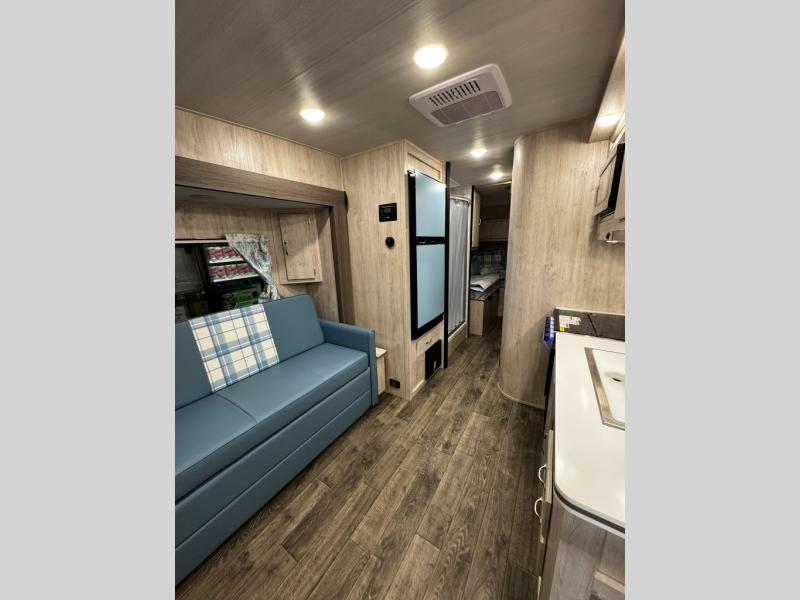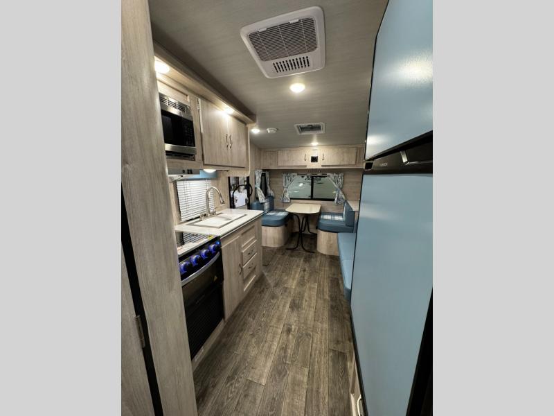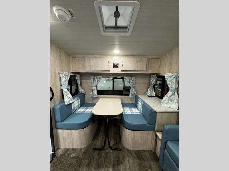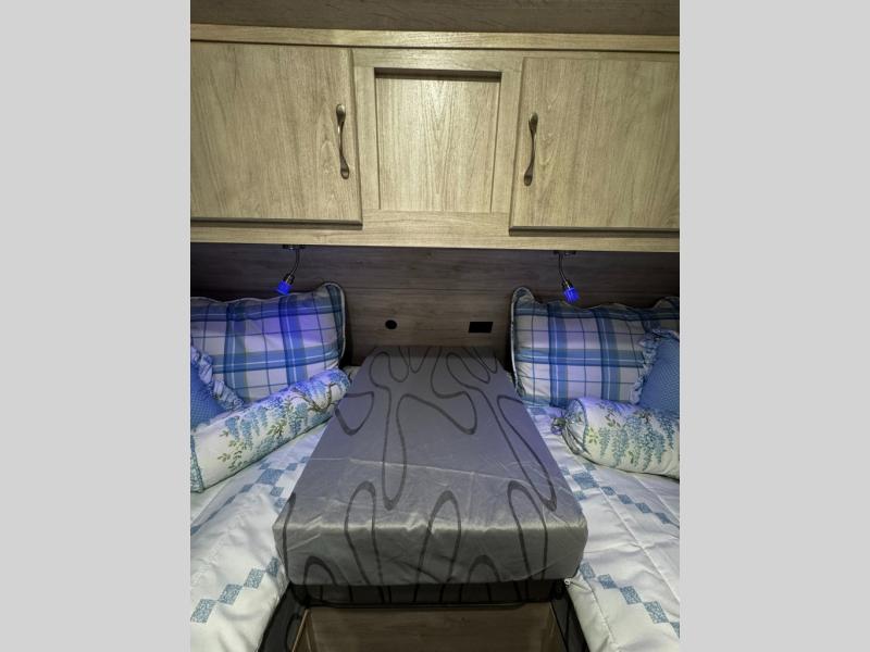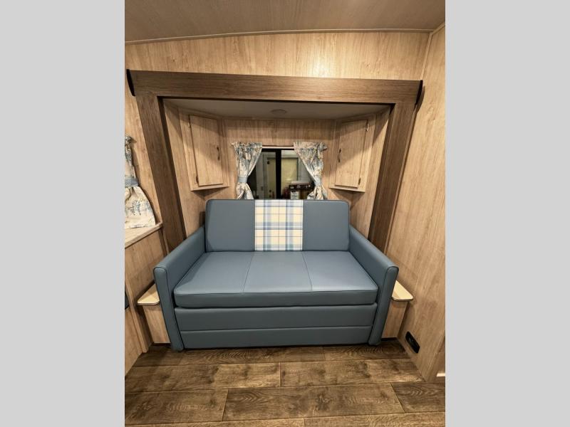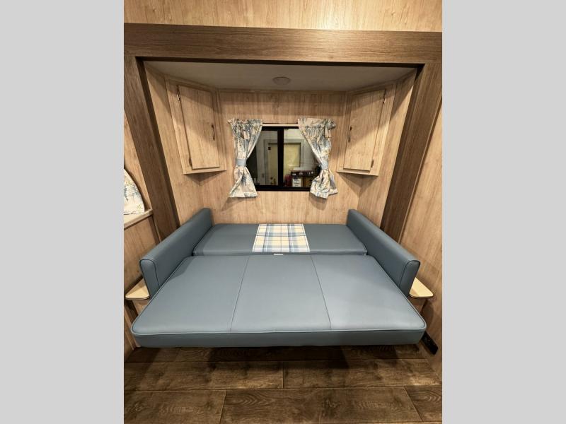 Step into comfort with this classic travel trailer in tow. You will find a rear vintage booth dinette and a sofa slide out with end tables to set your drinks on. The kitchen is complete with a microwave oven, cooktop, plus overhead cabinets for your belongings. After a day outdoors, you can clean up in the 24" x 36" shower, and there is a private toilet and sink across the hall if someone needs to use it while you're cleaning up. In the front bedroom you'll find twin beds with an insert to convert them into a king-size bed, plus dual shirt closets. How convenient!