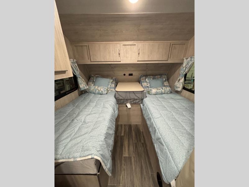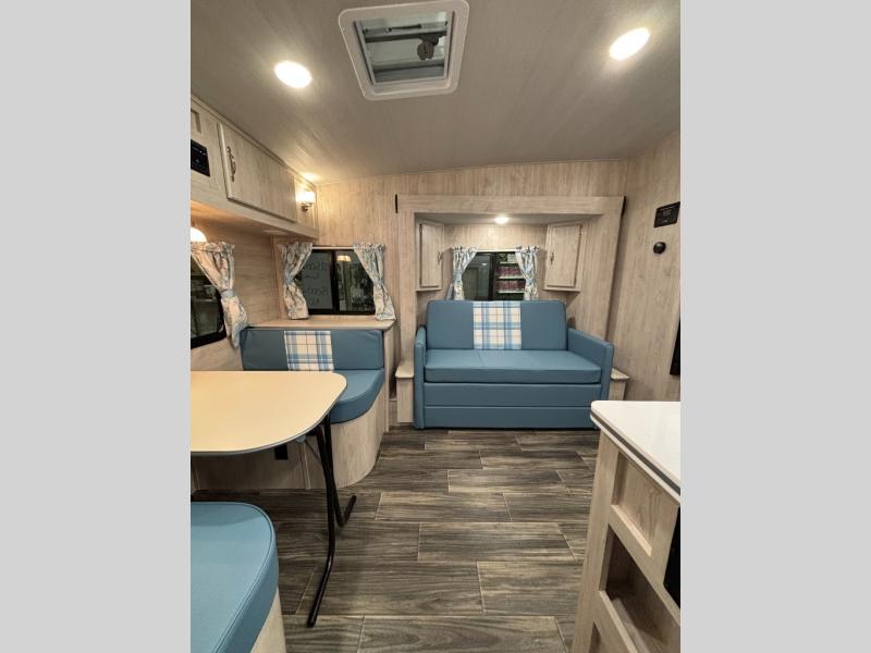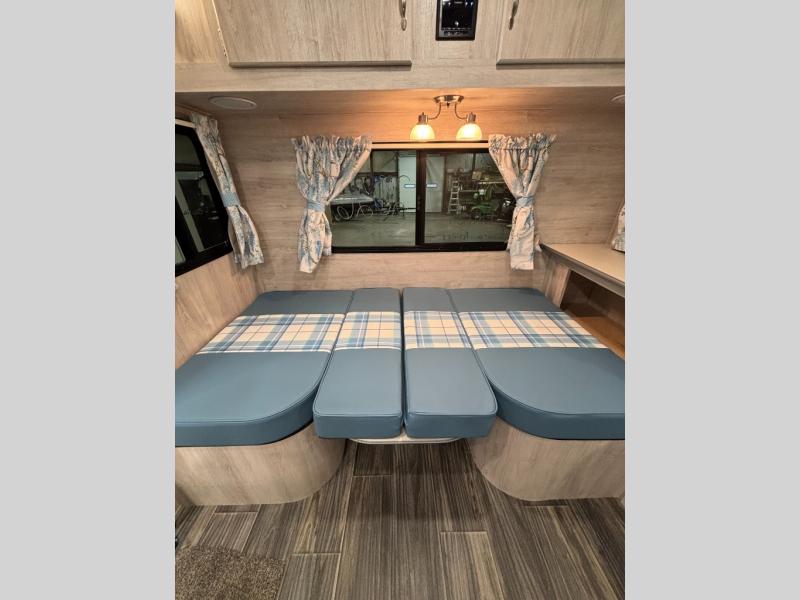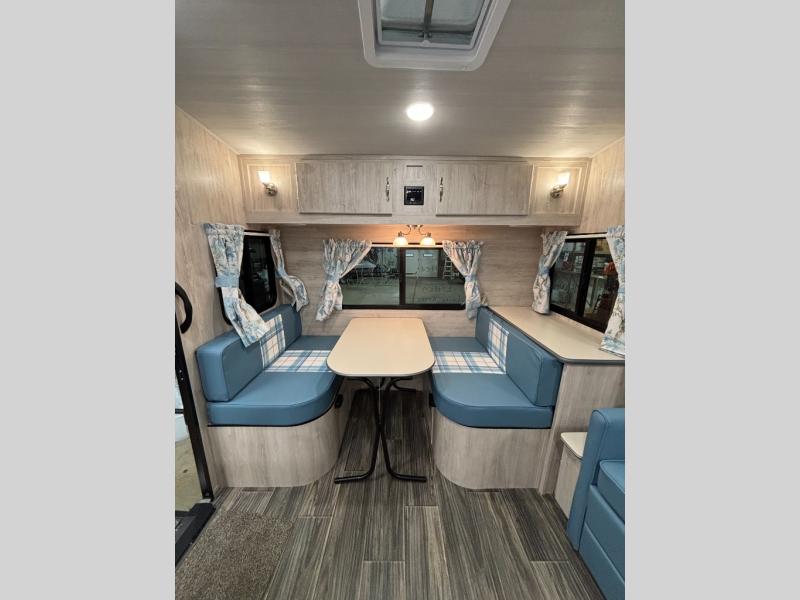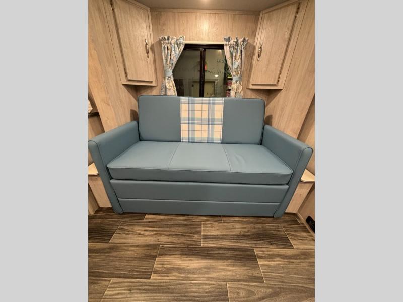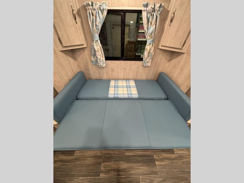 Step into comfort with this classic travel trailer in tow. You will find a rear vintage booth dinette and a sofa slide out with end tables to set your drinks on. The kitchen is complete with a microwave oven, cooktop, plus overhead cabinets for your belongings. After a day outdoors, you can clean up in the 24" x 36" shower, and there is a private toilet and sink across the hall if someone needs to use it while you're cleaning up. In the front bedroom you'll find twin beds with an insert to convert them into a king-size bed, plus dual shirt closets. How convenient!