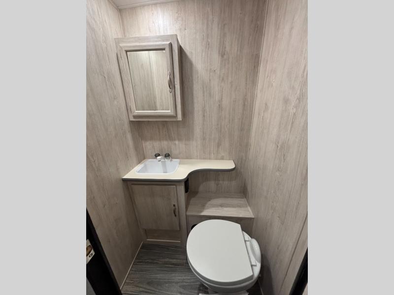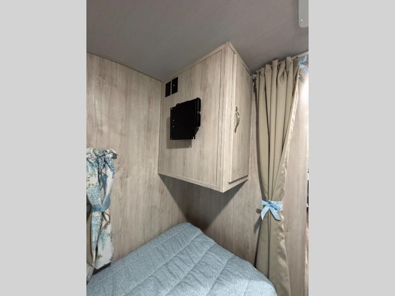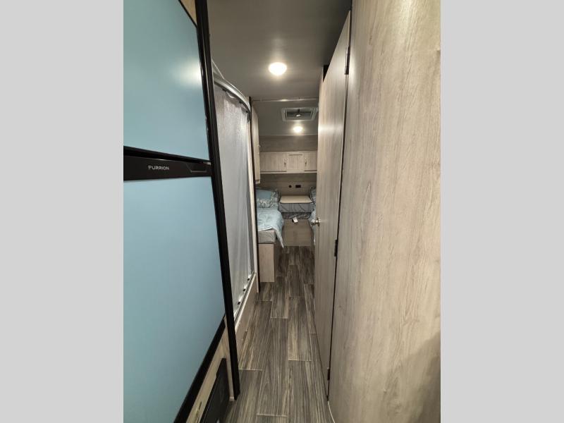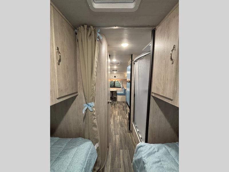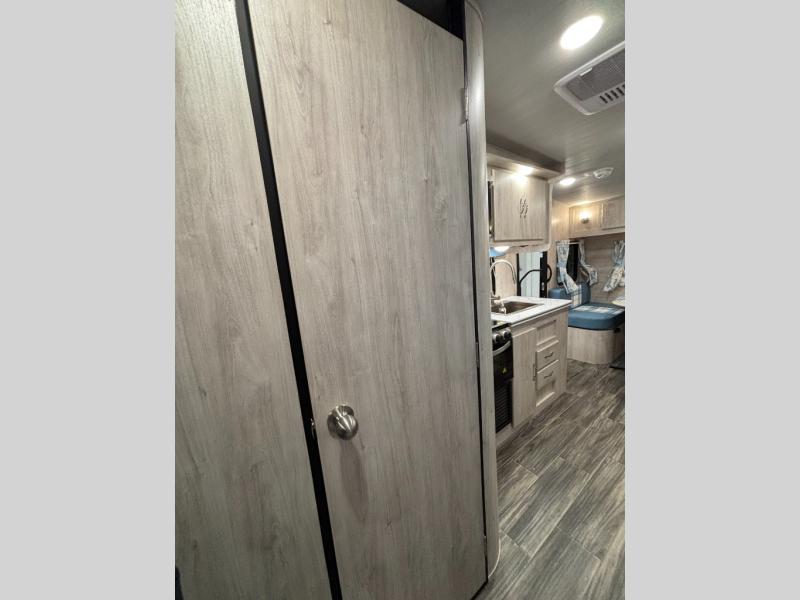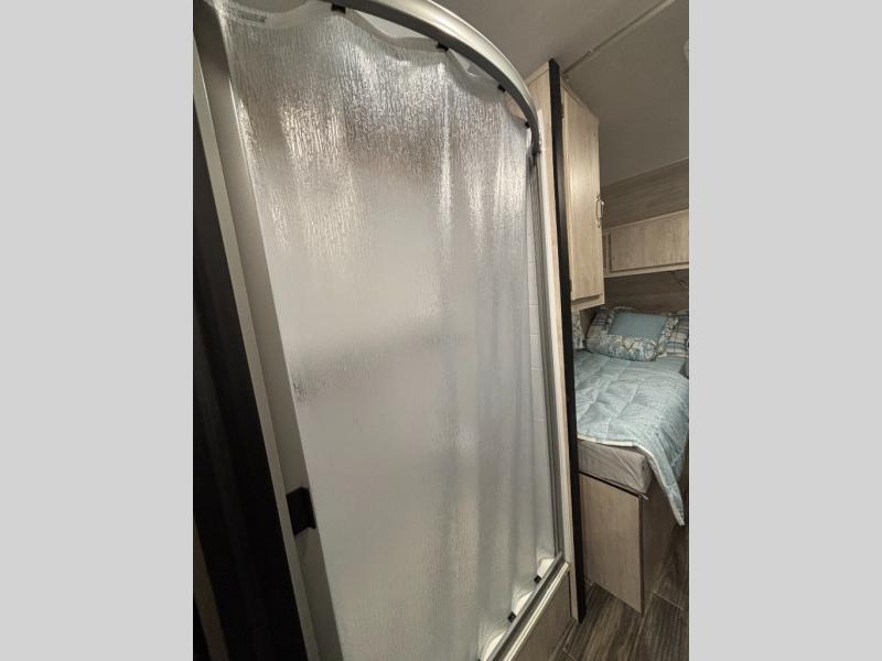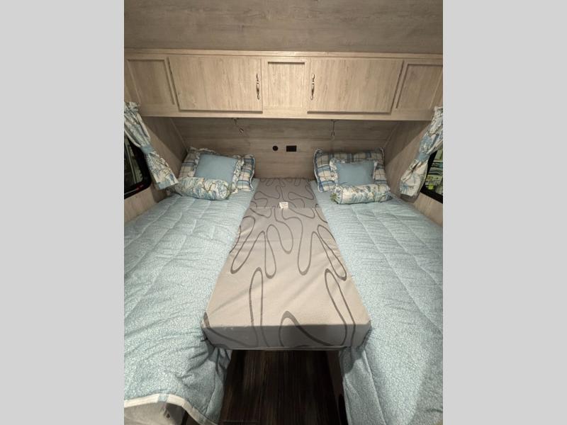 Step into comfort with this classic travel trailer in tow. You will find a rear vintage booth dinette and a sofa slide out with end tables to set your drinks on. The kitchen is complete with a microwave oven, cooktop, plus overhead cabinets for your belongings. After a day outdoors, you can clean up in the 24" x 36" shower, and there is a private toilet and sink across the hall if someone needs to use it while you're cleaning up. In the front bedroom you'll find twin beds with an insert to convert them into a king-size bed, plus dual shirt closets. How convenient!