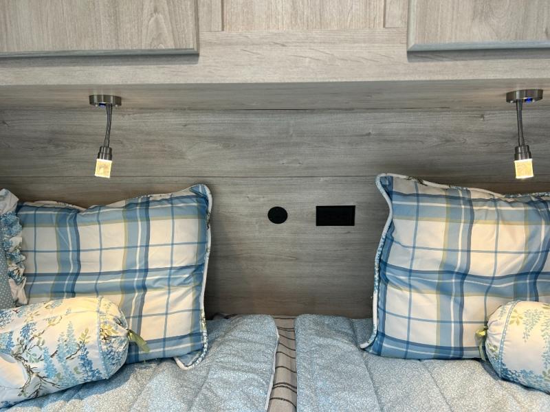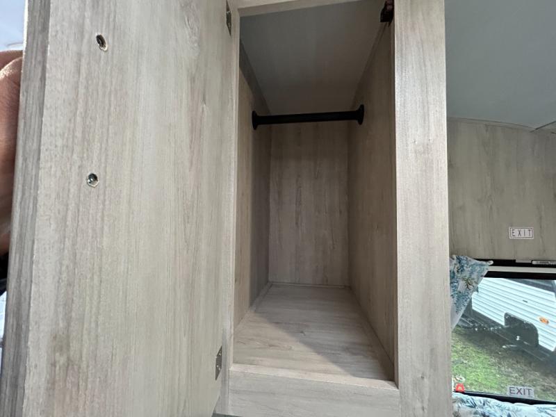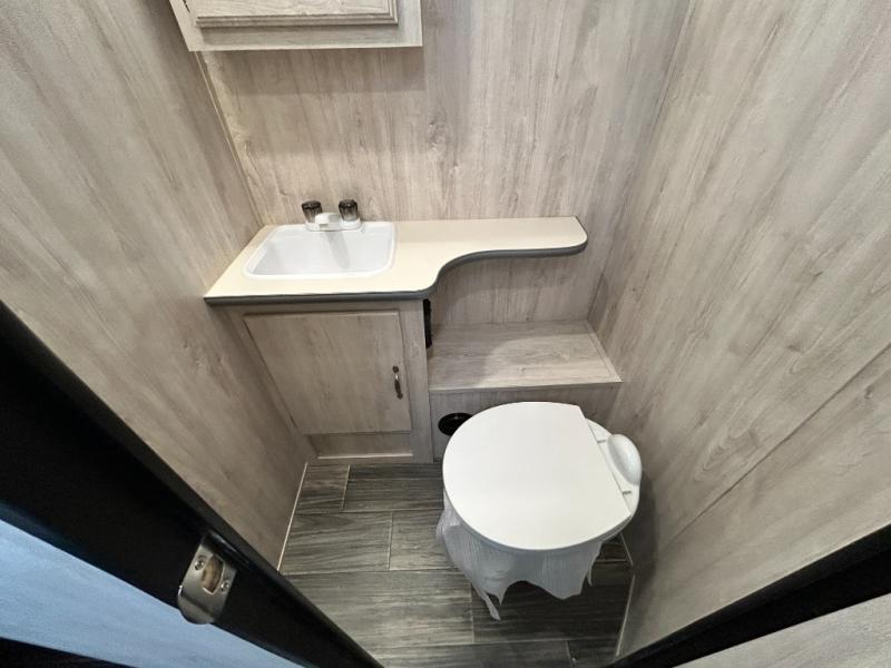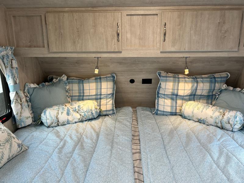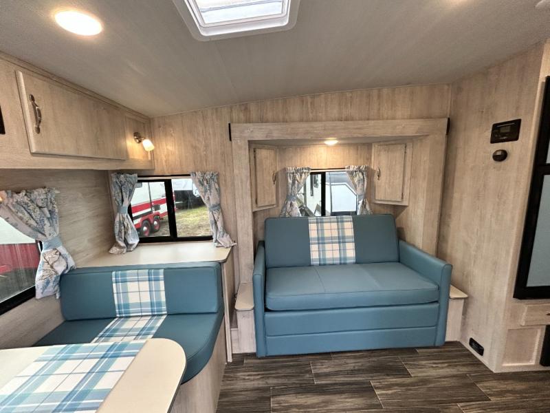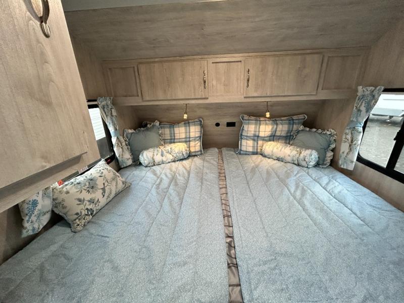 Step into comfort with this classic travel trailer in tow. You will find a rear vintage booth dinette and a sofa slide out with end tables to set your drinks on. The kitchen is complete with a microwave oven, cooktop, plus overhead cabinets for your belongings. After a day outdoors, you can clean up in the 24" x 36" shower, and there is a private toilet and sink across the hall if someone needs to use it while you're cleaning up. In the front bedroom you'll find twin beds with an insert to convert them into a king-size bed, plus dual shirt closets. How convenient!