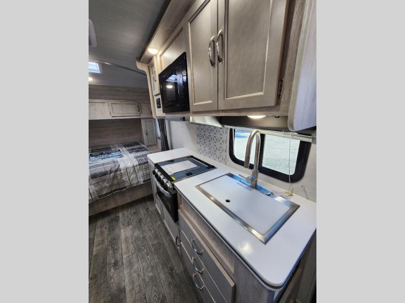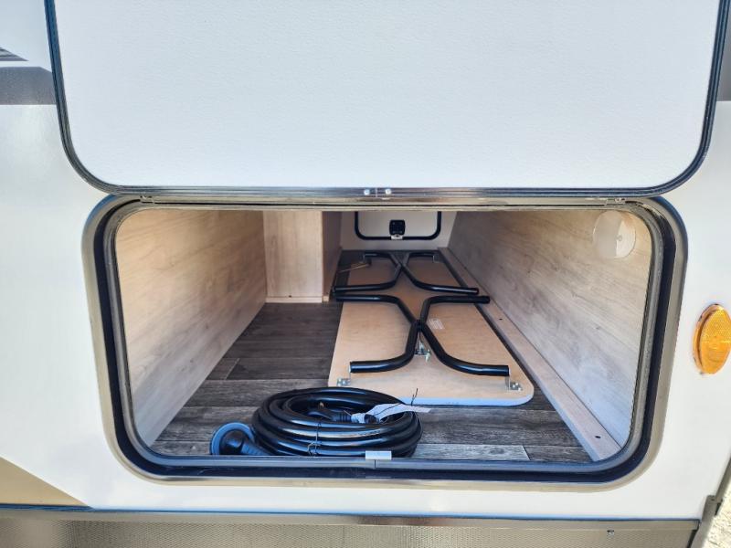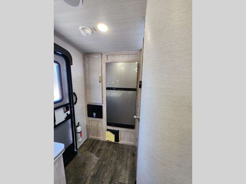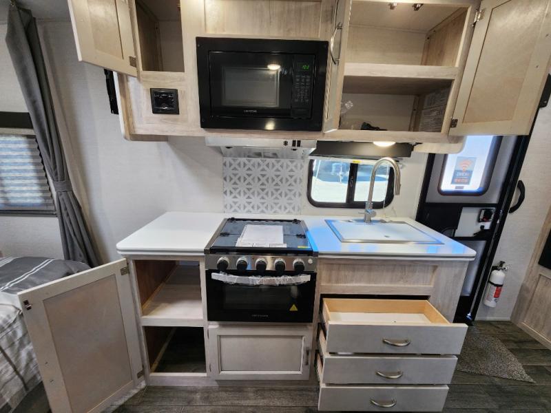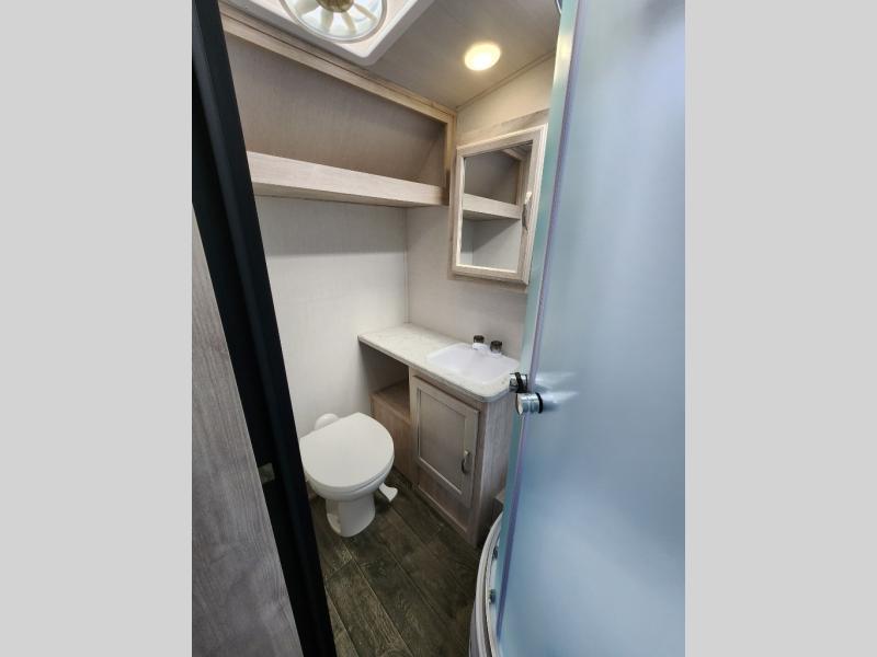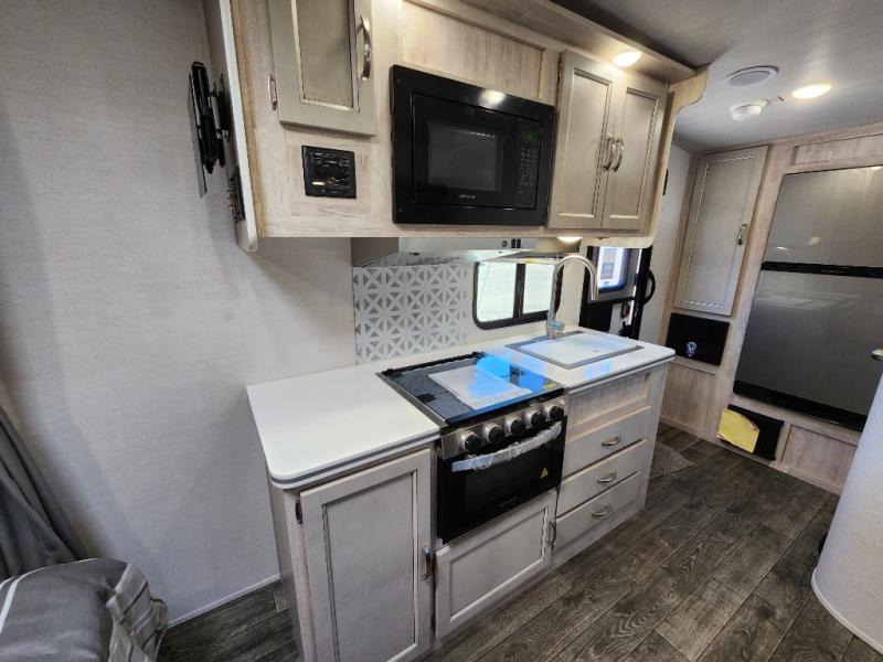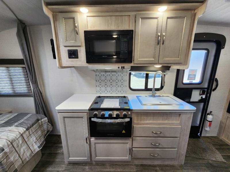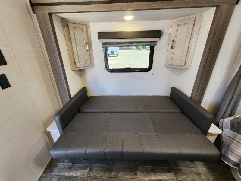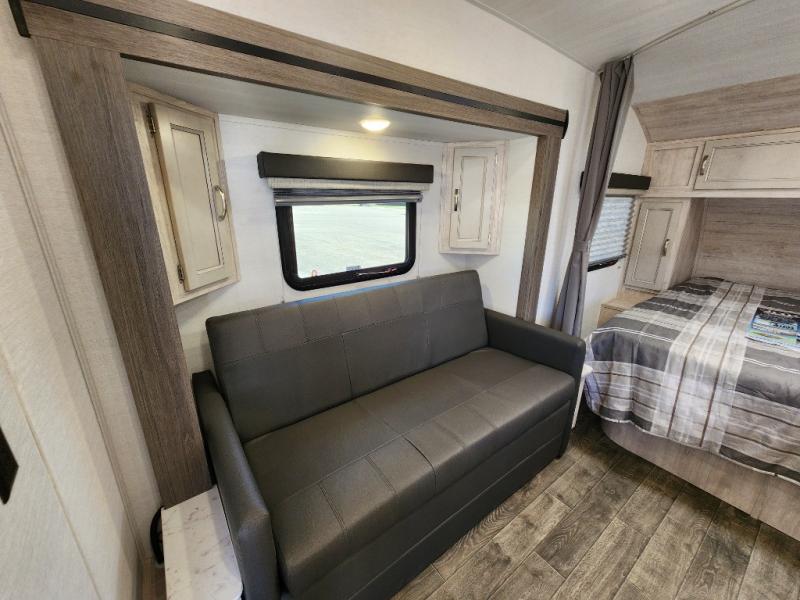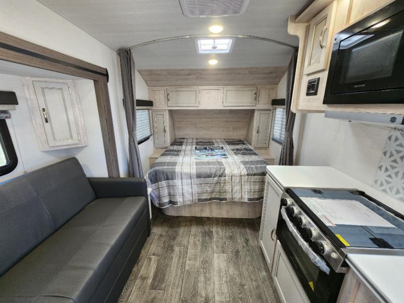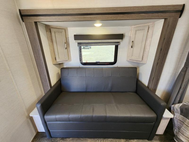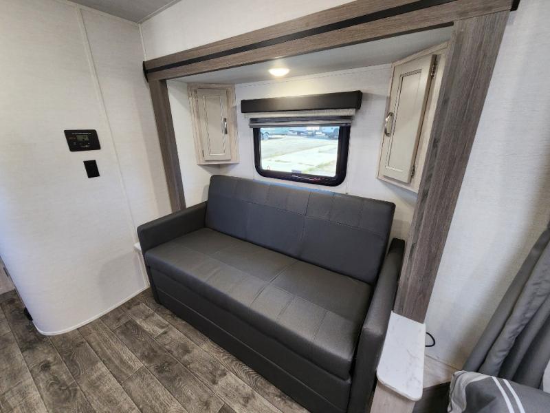 You will have everything in this travel trailer for a comfortable weekend getaway! You will start each morning feeling refreshed after sleeping on the front queen bed with shirt closets on either side and a TV mount location diagonal from it. After you take a nice, hot shower in the rear corner bathroom, head to the 8 cu. ft. 12V refrigerator and grab some bacon to fry up on the three burner cooktop. The sofa bed slide has a 60" folding table for you to enjoy your meals, and can transform into an extra sleeping space for a guest or two little ones. Don't leave any of your favorite snacks behind either when you can store them inside the pantry/closet near the entrance!