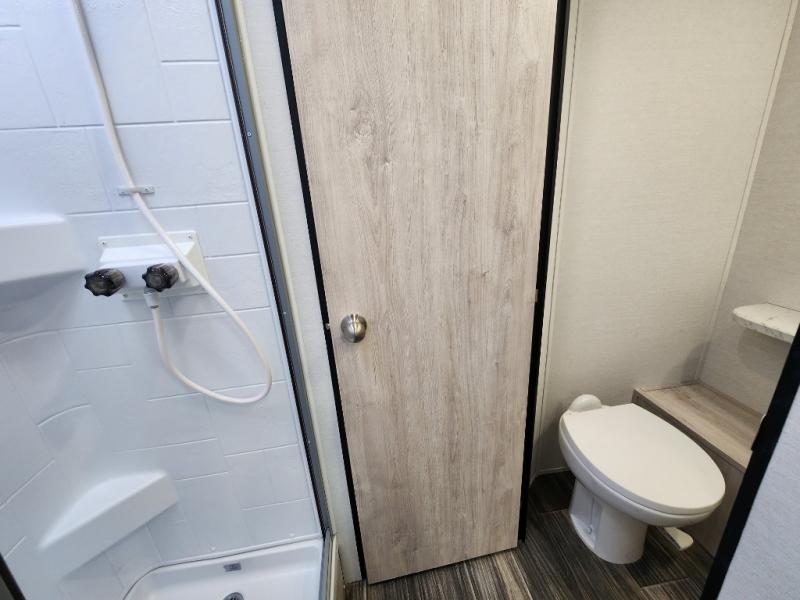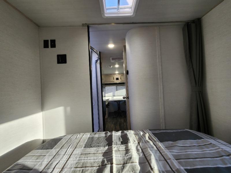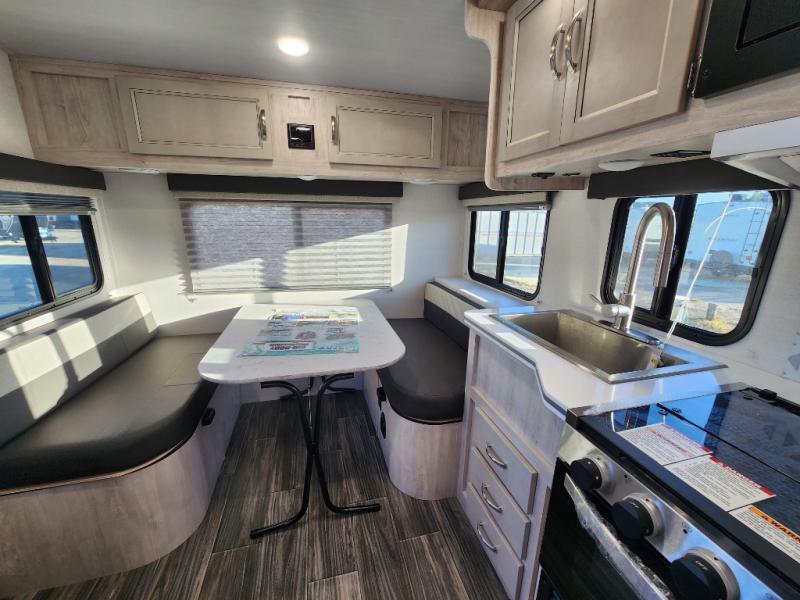 If you enjoy a more classic look for an RV, you'll love this Vintage Cruiser 19ERD. The rear booth dinette is surrounded by windows for bright, open views, and you'll find overhead storage here for dry goods or snacks. The chef of your group will have a cooktop and a microwave oven to prepare meals. The private toilet and sink is right across the hall from the 24" x 36" shower so two people can freshen up at once. How convenient! This model also features a semi-private front bedroom with a privacy curtain for your own space, plus an RV queen bed and dual shirt closets to keep your clothes tidy!