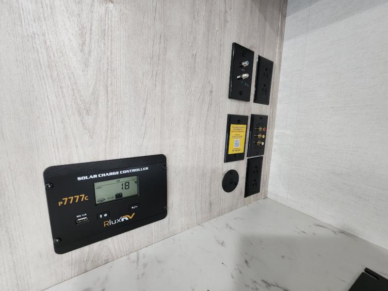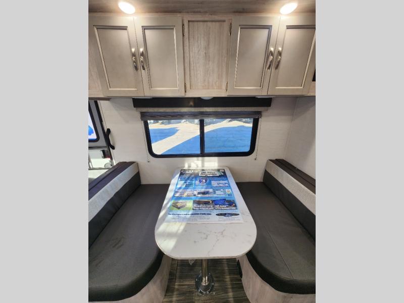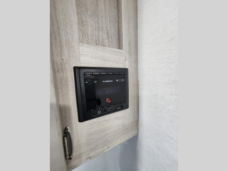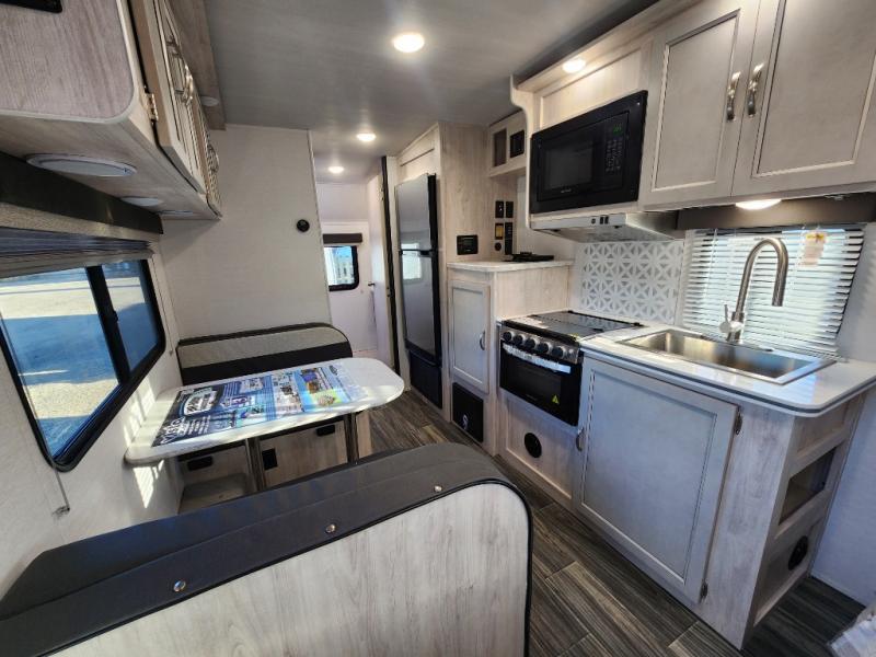 This travel trailer has the same layout as model 18MBS, but you'll enjoy a fixed RV queen bed up front instead of the Murphy bed. The full rear bath includes a linen closet and a wardrobe to keep your necessities organized, and you'll find additional storage throughout this model for your belongings. The vintage booth dinette will be the perfect place to dine at after dinner is made on the cooktop. There is also a microwave oven for quick meals and an 8 cu. ft. 12V refrigerator for cold drinks and perishables. And don't forget about the exterior pass-through storage for your larger camp gear!