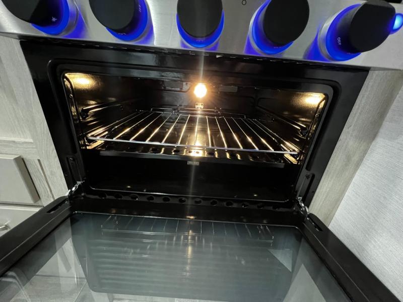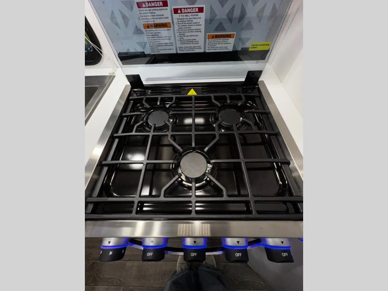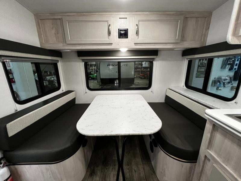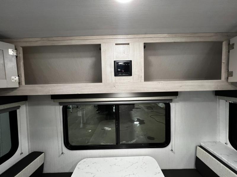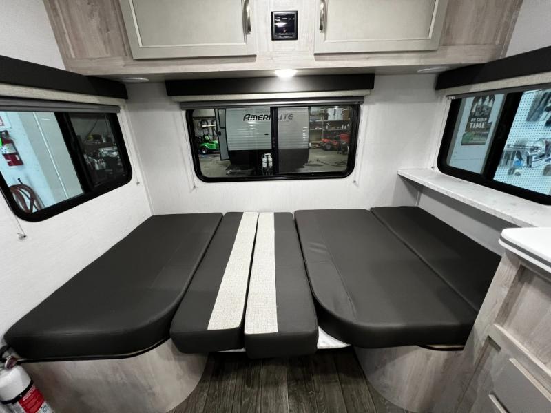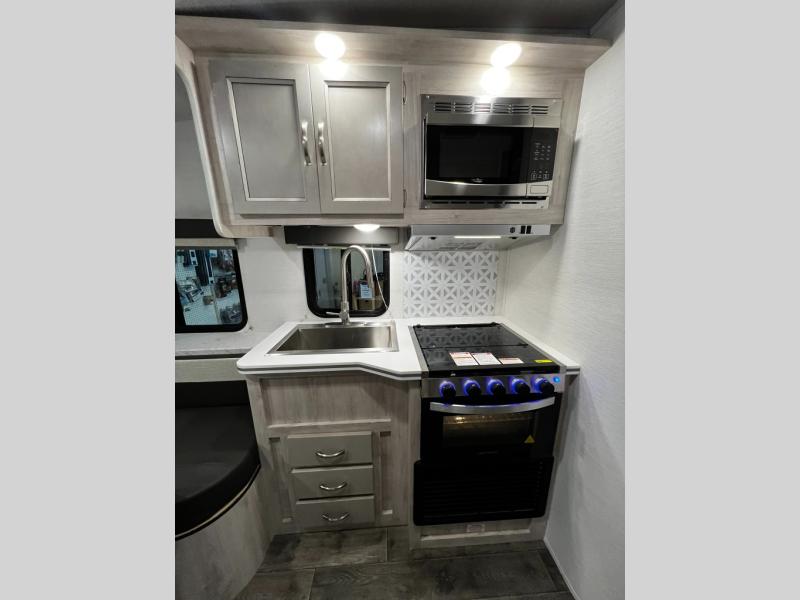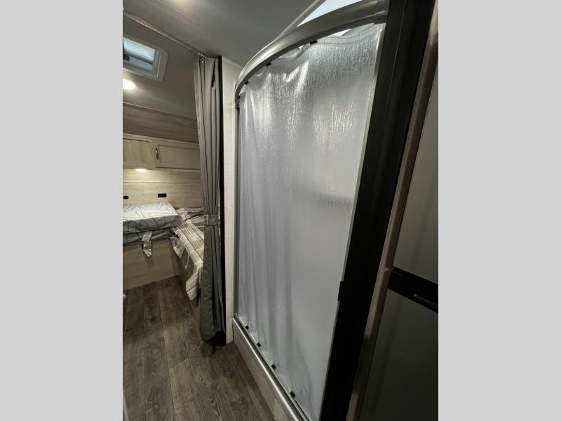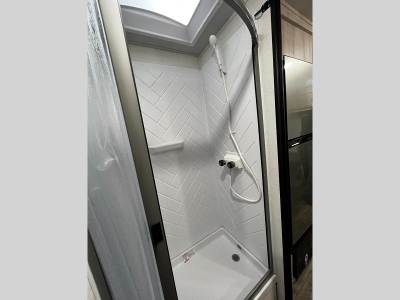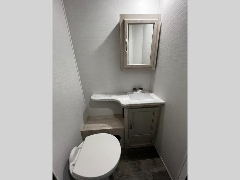 Enjoy the comforts of home while at the campsite in this travel trailer! Up front there are two twin beds with an insert for a king bed. The separated bathroom makes it easy for one to freshen up in the shower while another washes up for dinner in the private toilet and sink right across the hall. The rear booth dinette is great for enjoying a meal, playing a card game, and even transforming into an extra sleeping space. The flat floor entry helps to keep you from tripping when entering or exiting. The microwave above the three burner cooktop is just waiting for you to pop the perfect bag of popcorn on movie night!