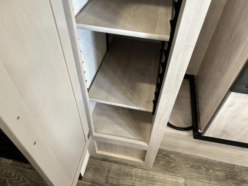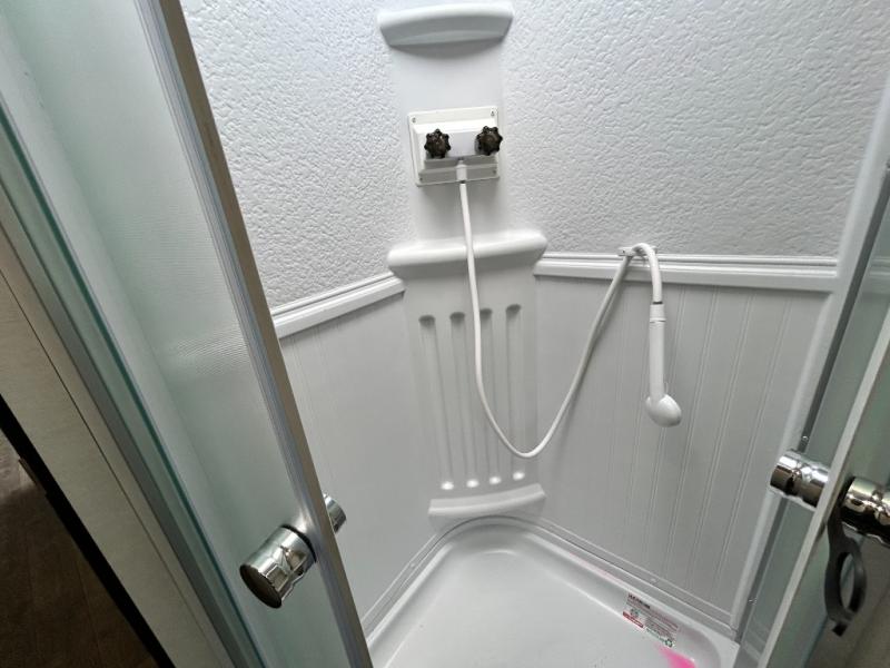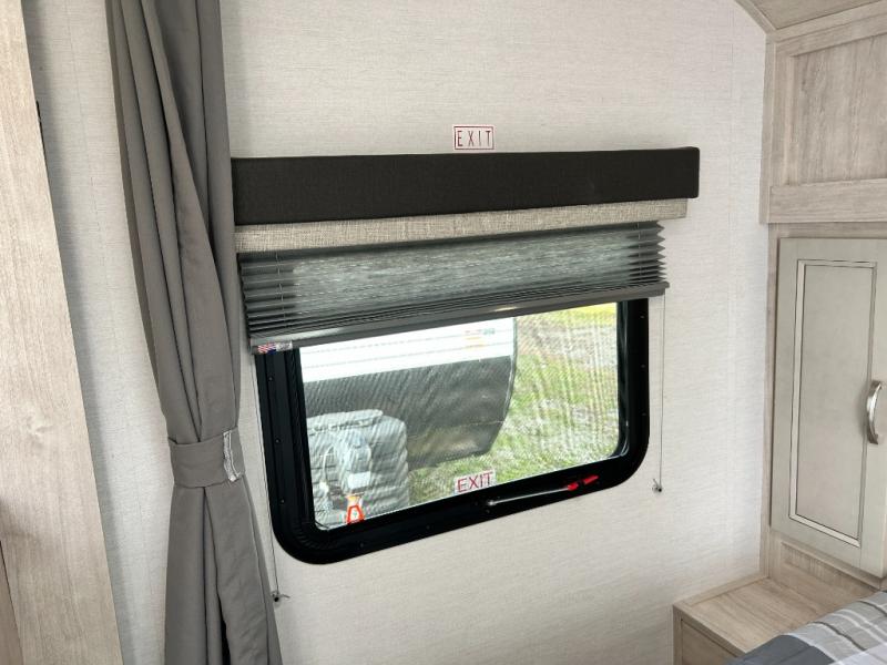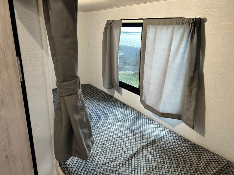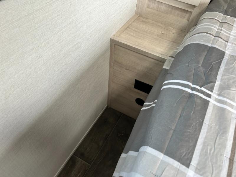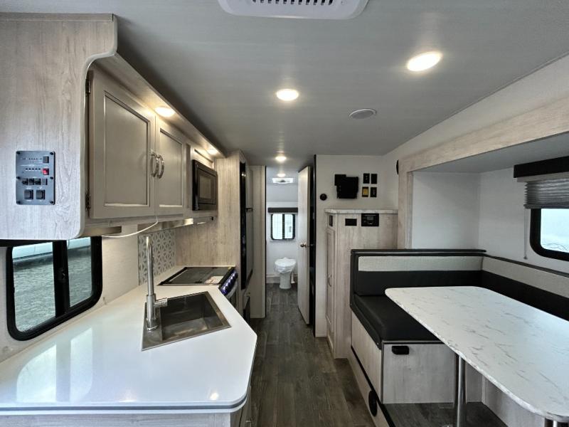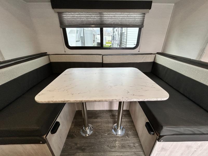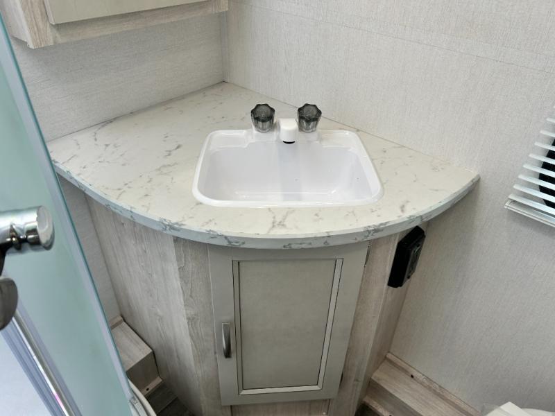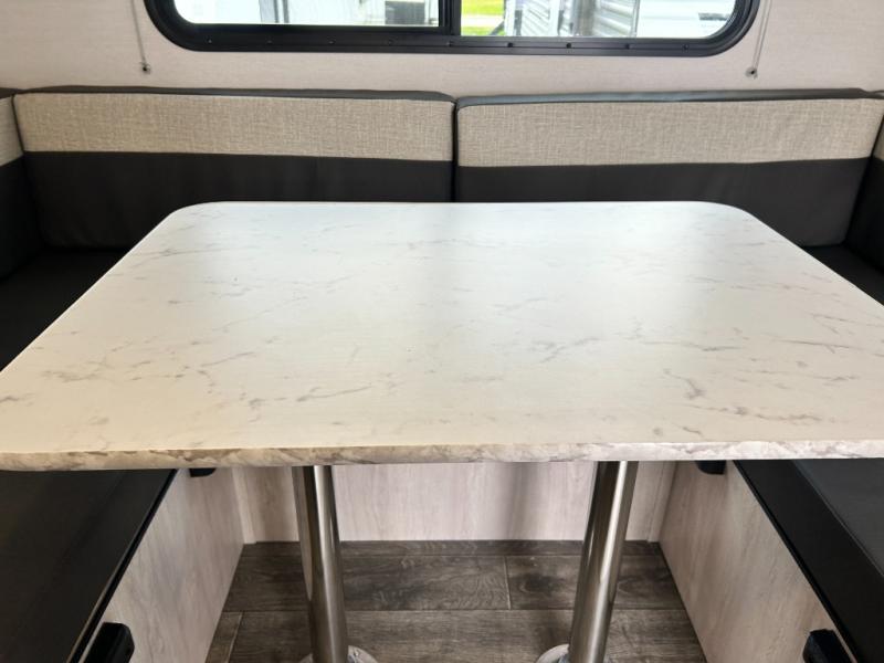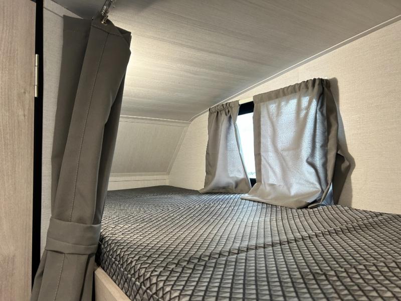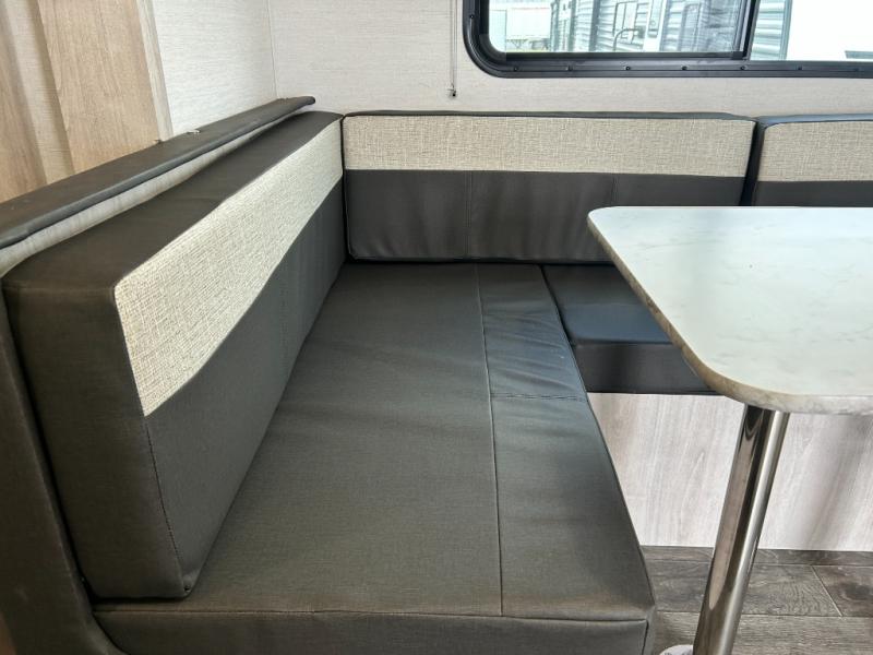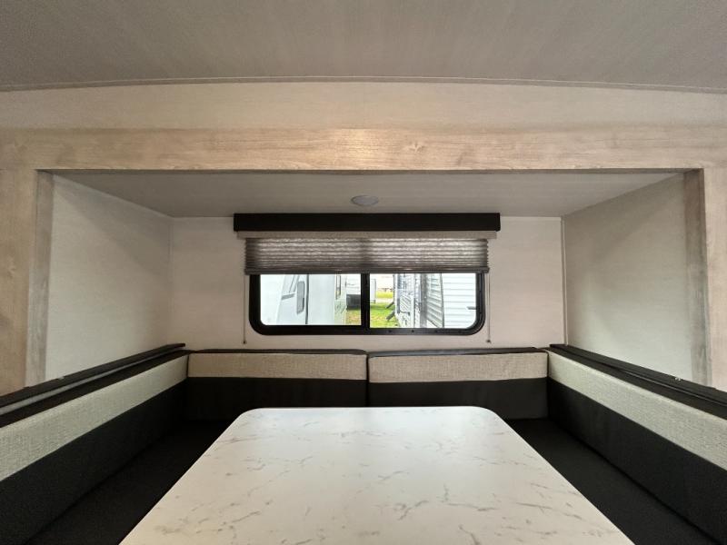 You will feel right at home camping in this travel trailer! With a set of corner bunk beds and a 60" x 74" bed up front, everyone will enjoy a good night's rest, plus the U-shaped dinette slide can also transform into a sleeping space. There are also under-seat drawers to store your games, and a TV mount with home theater by the wardrobe. The rear corner bathroom has a neo-angled shower, a high velocity vent to eliminate any steam, and a deluxe wood medicine cabinet with a mirror!