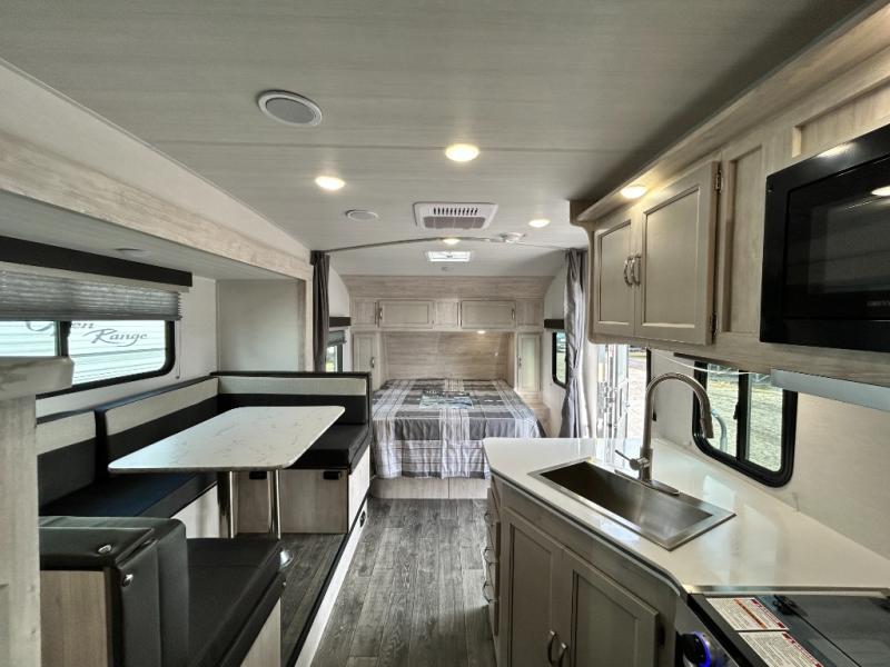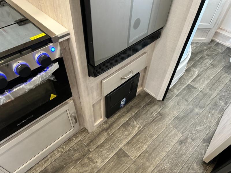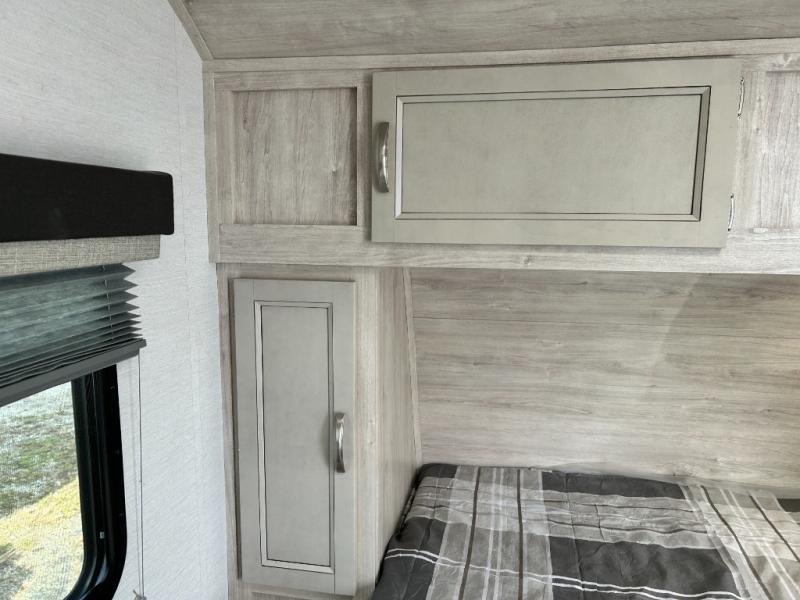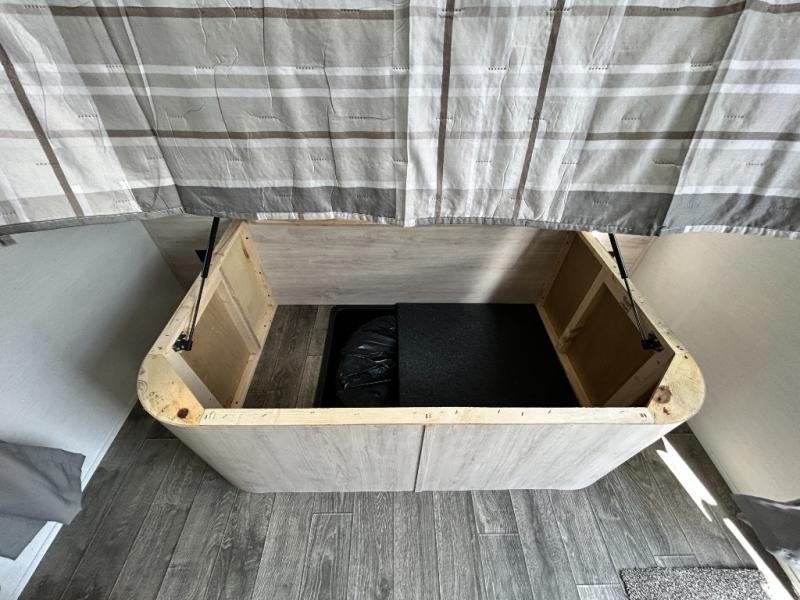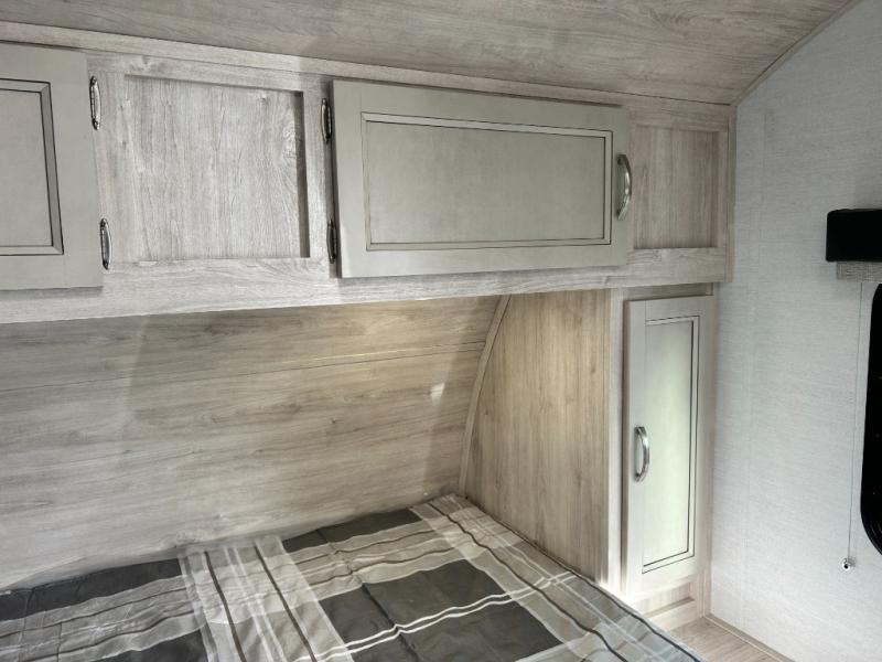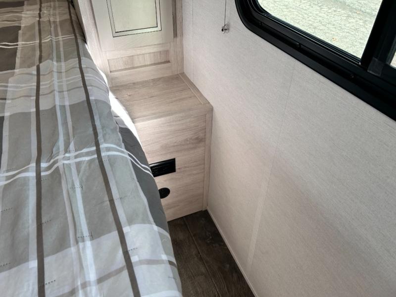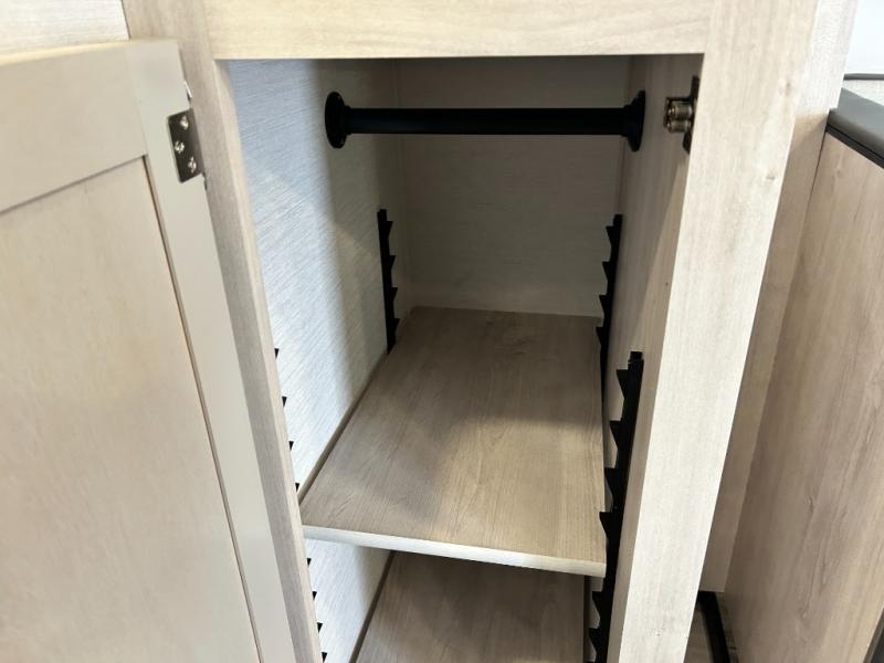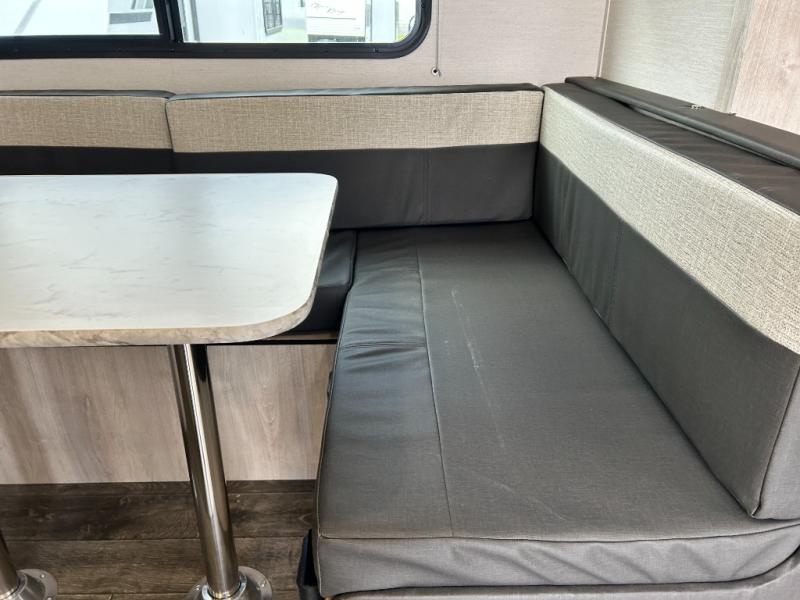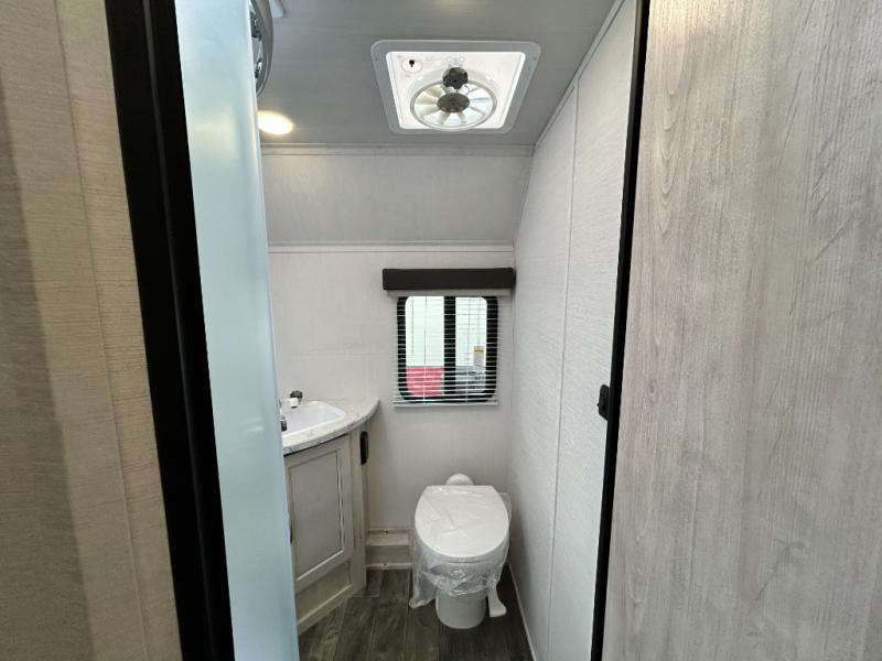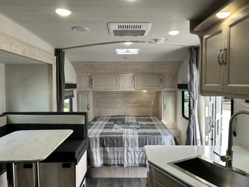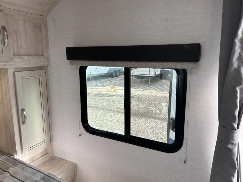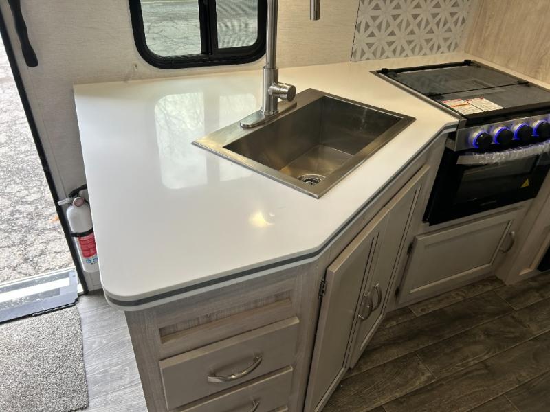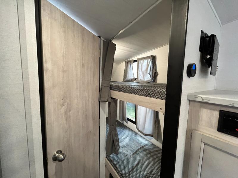 You will feel right at home camping in this travel trailer! With a set of corner bunk beds and a 60" x 74" bed up front, everyone will enjoy a good night's rest, plus the U-shaped dinette slide can also transform into a sleeping space. There are also under-seat drawers to store your games, and a TV mount with home theater by the wardrobe. The rear corner bathroom has a neo-angled shower, a high velocity vent to eliminate any steam, and a deluxe wood medicine cabinet with a mirror!