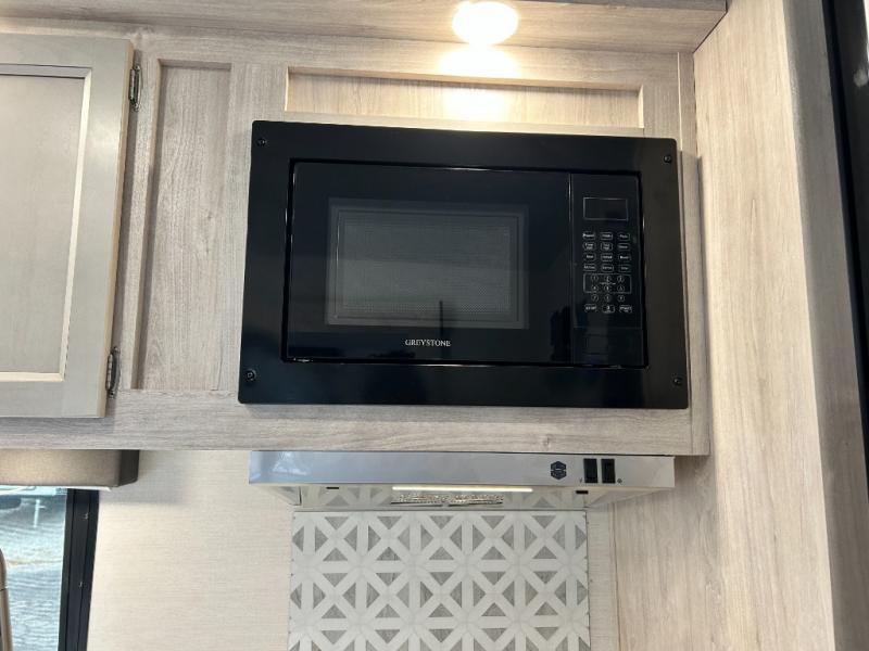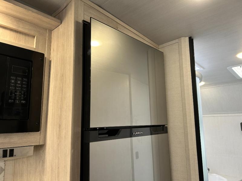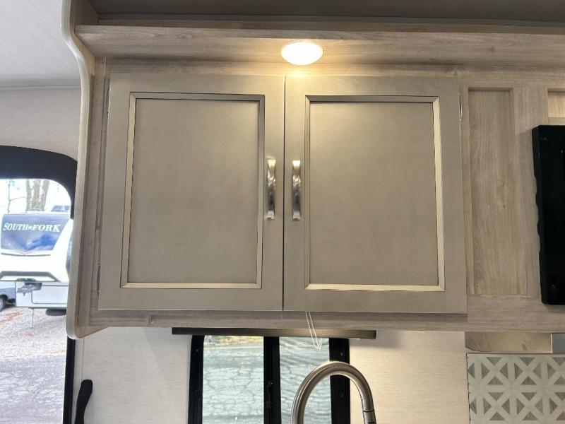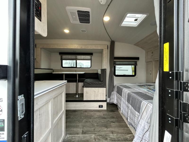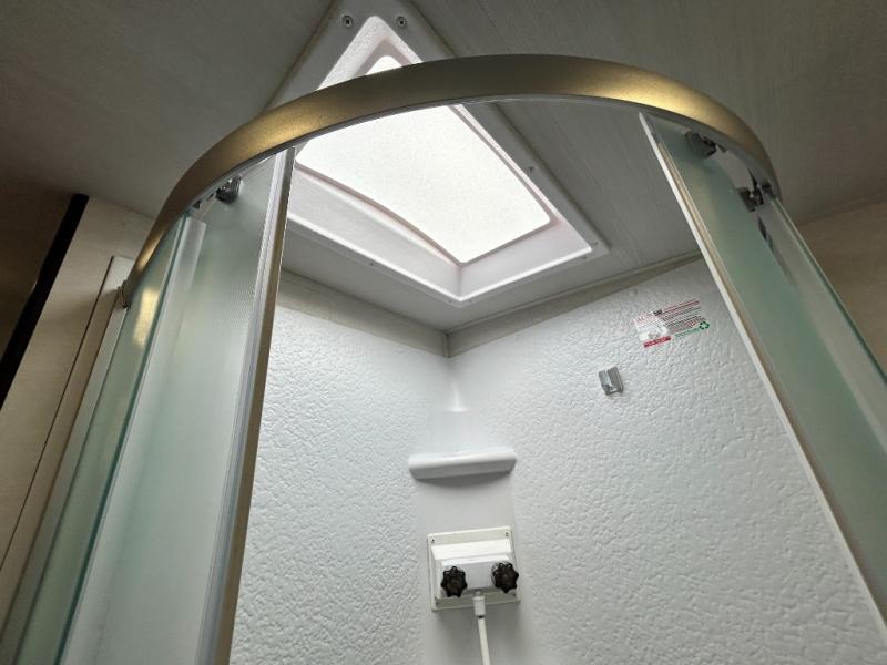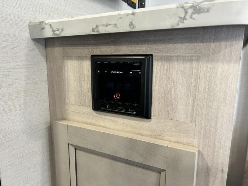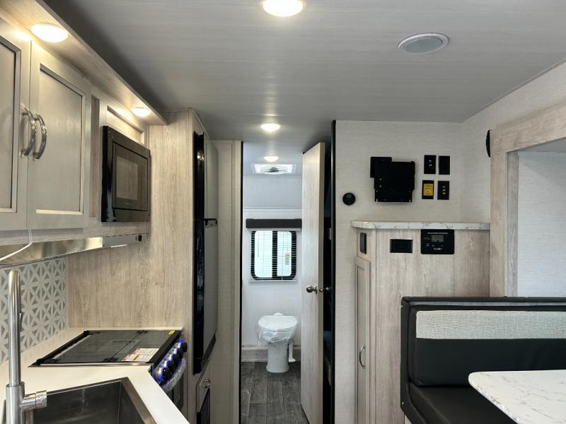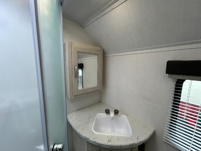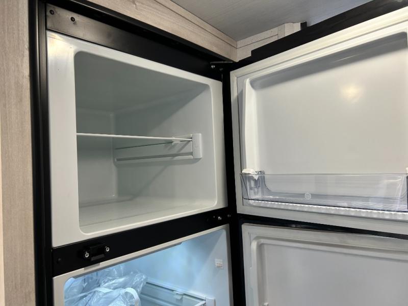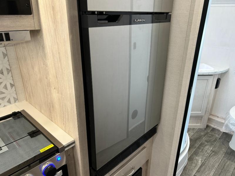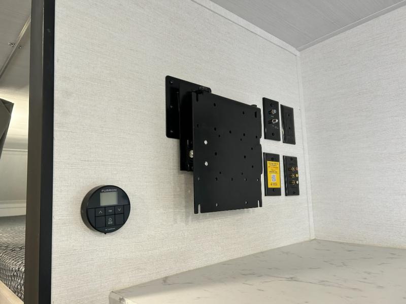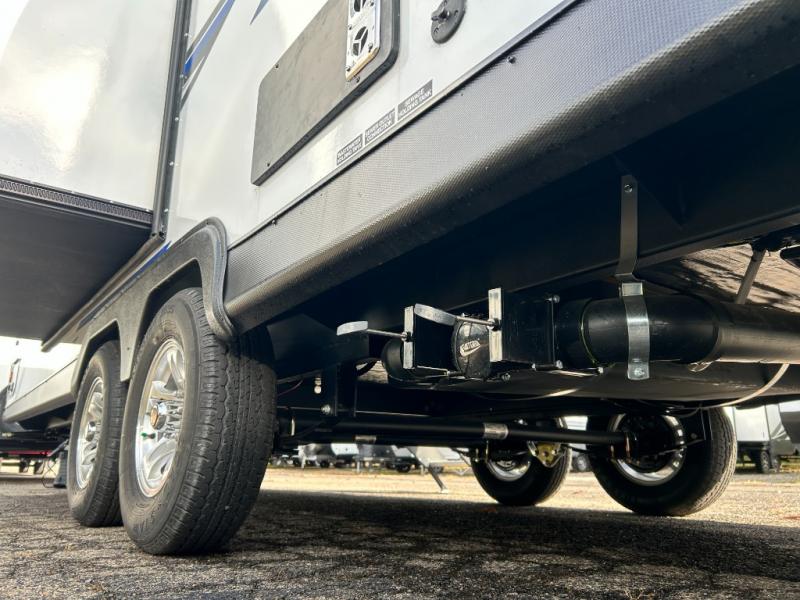 You will feel right at home camping in this travel trailer! With a set of corner bunk beds and a 60" x 74" bed up front, everyone will enjoy a good night's rest, plus the U-shaped dinette slide can also transform into a sleeping space. There are also under-seat drawers to store your games, and a TV mount with home theater by the wardrobe. The rear corner bathroom has a neo-angled shower, a high velocity vent to eliminate any steam, and a deluxe wood medicine cabinet with a mirror!