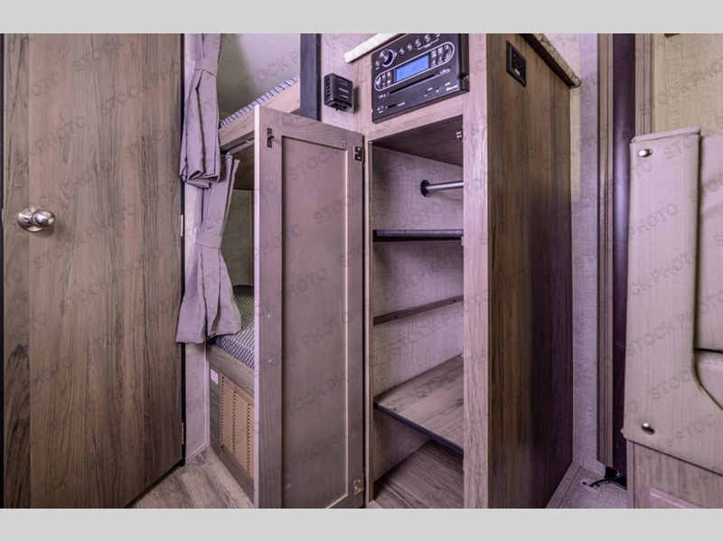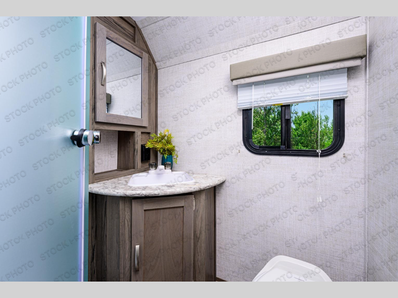 You will feel right at home camping in this travel trailer! With a set of corner bunk beds and a 60" x 74" bed up front, everyone will enjoy a good night's rest, plus the U-shaped dinette slide can also transform into a sleeping space. There are also under-seat drawers to store your games, and a TV mount with home theater by the wardrobe. The rear corner bathroom has a neo-angled shower, a high velocity vent to eliminate any steam, and a deluxe wood medicine cabinet with a mirror!